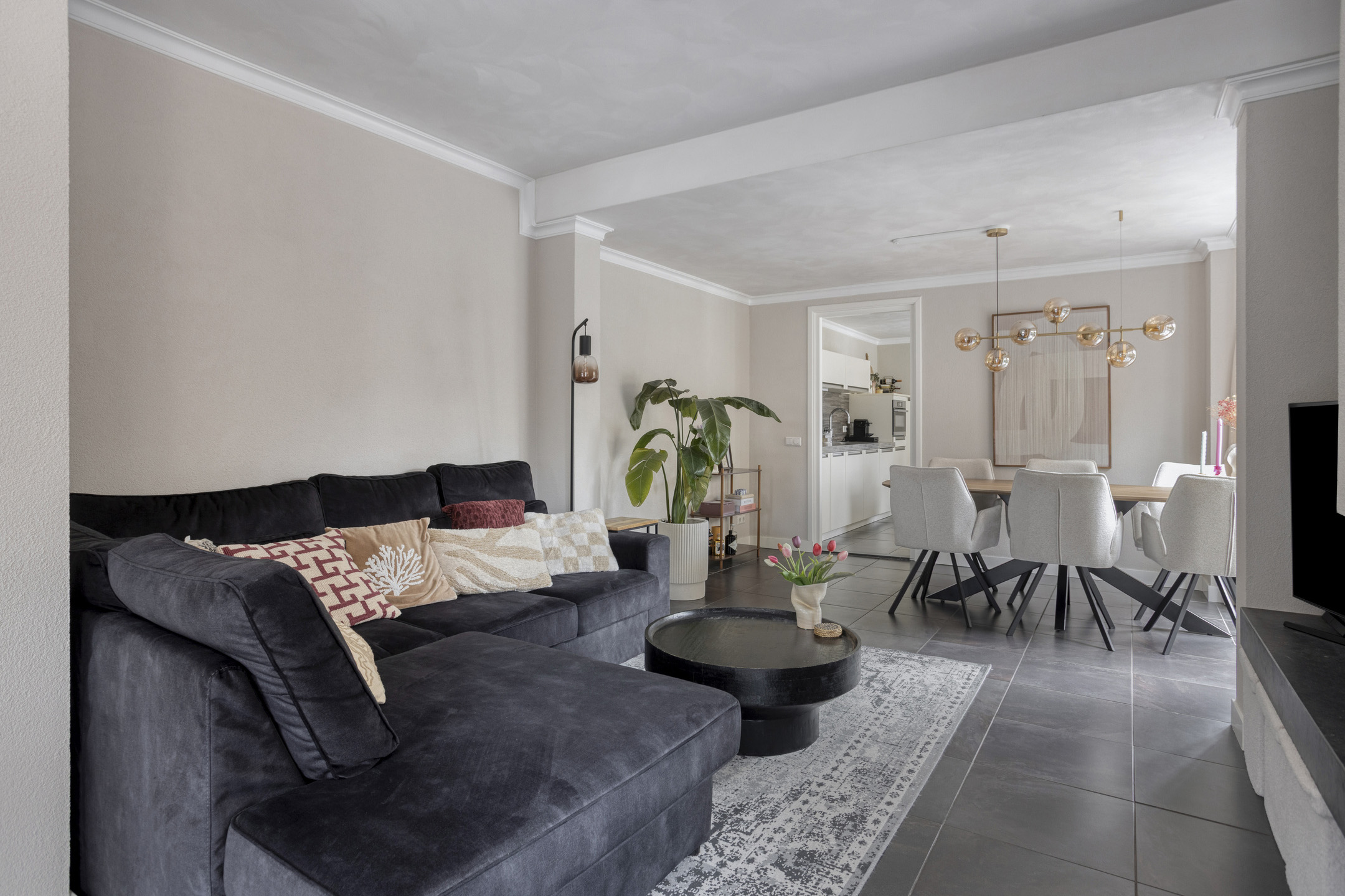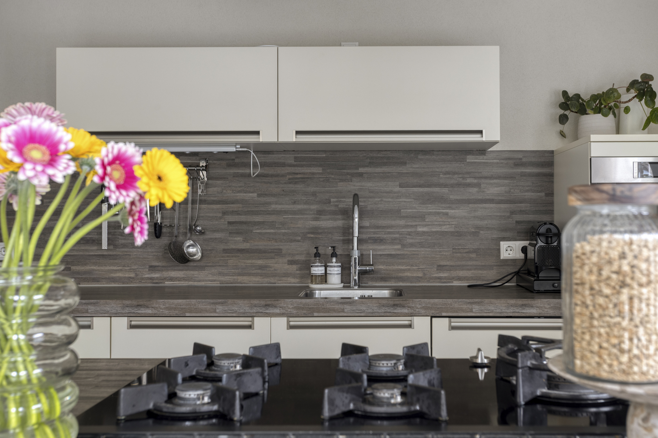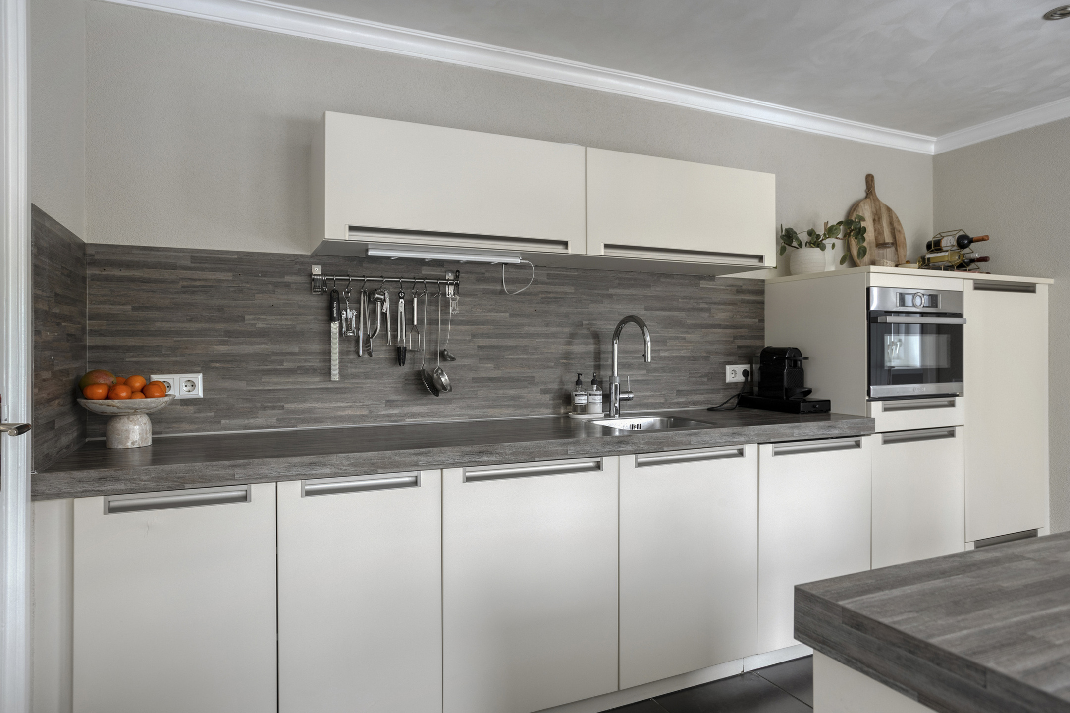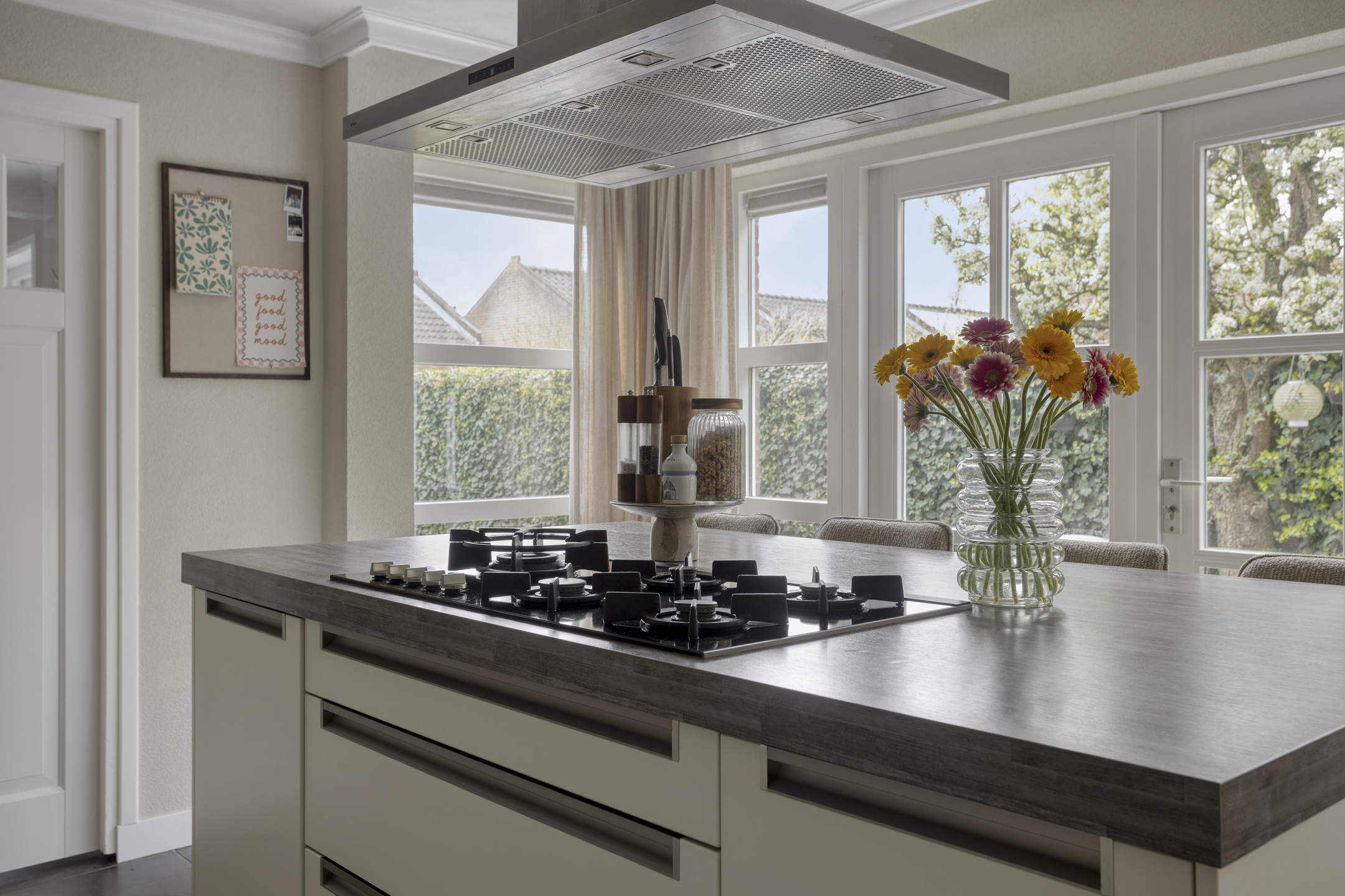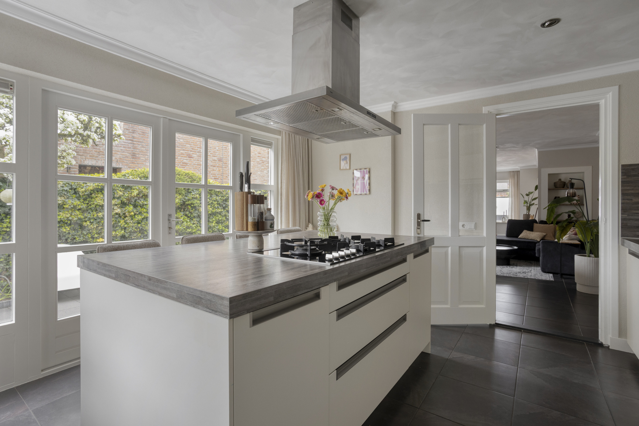 De keuken bevindt zich aan de achterzijde van de woning en is voorzien van een vaatwasser, koelkast, combi-oven en een 5-pits gaskookplaat. Vanuit de keuken geven openslaande deuren toegang tot de tuin, waardoor binnen en buiten mooi met elkaar worden verbonden.
