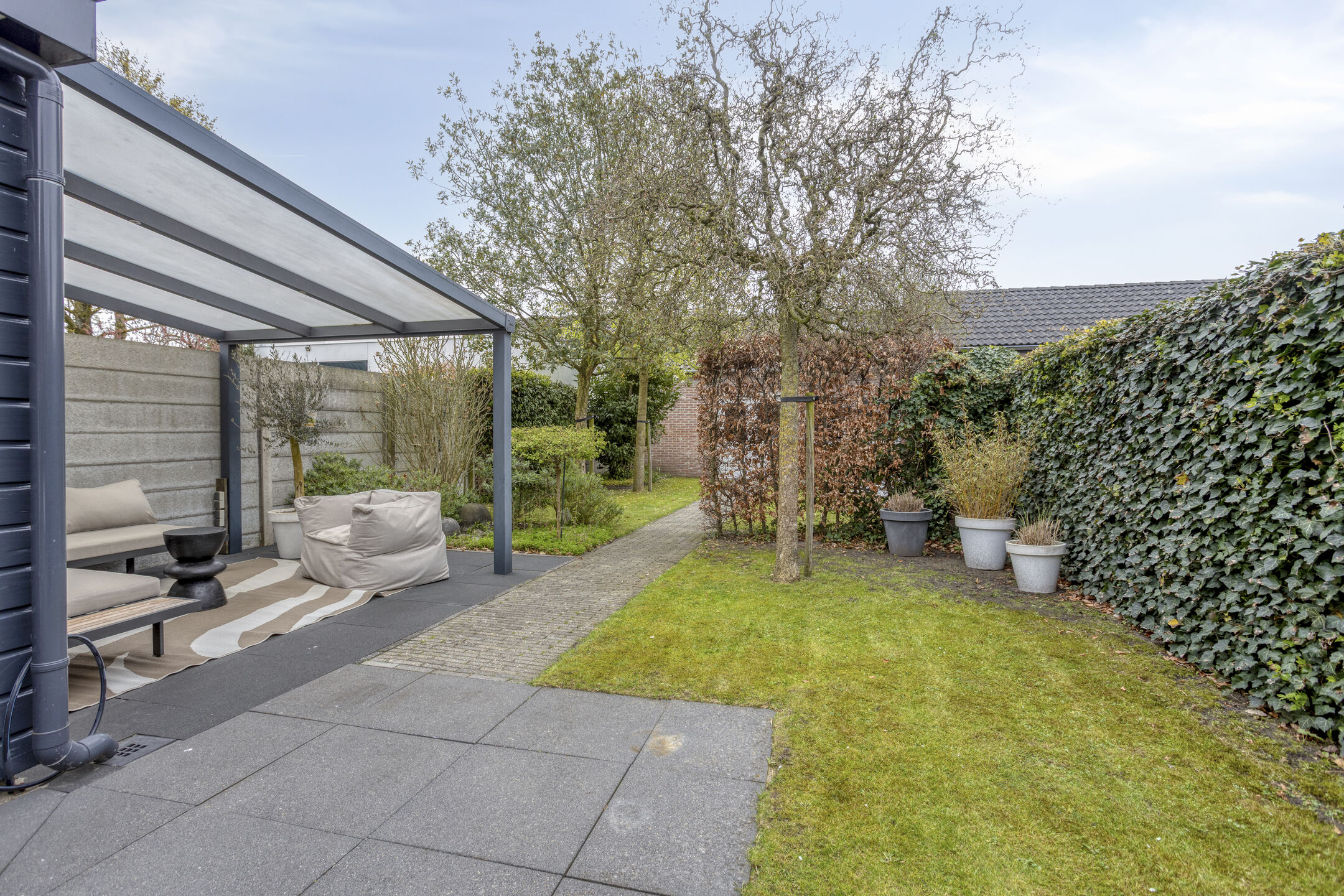 De achtertuin is verzorgd aangelegd en beschikt over een gazon met een beregeningssysteem, wat zorgt voor eenvoudig onderhoud. Onder de overkapping is een gezellige zithoek gerealiseerd waar u heerlijk beschut kunt genieten van het buitenleven.