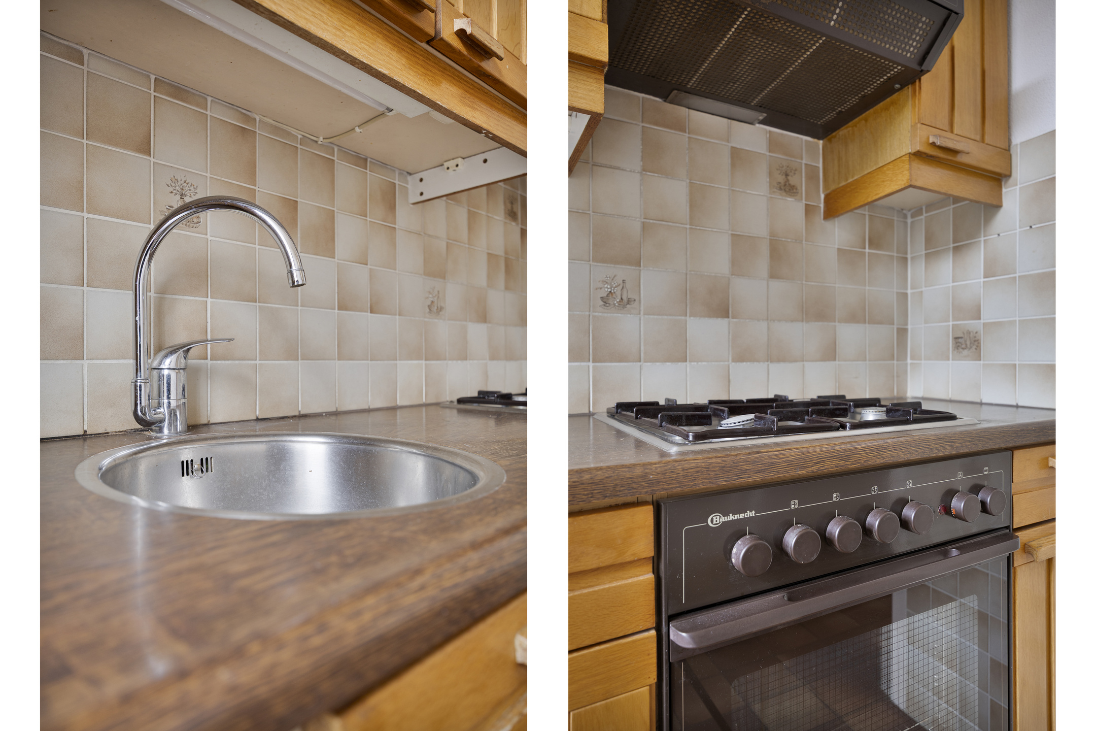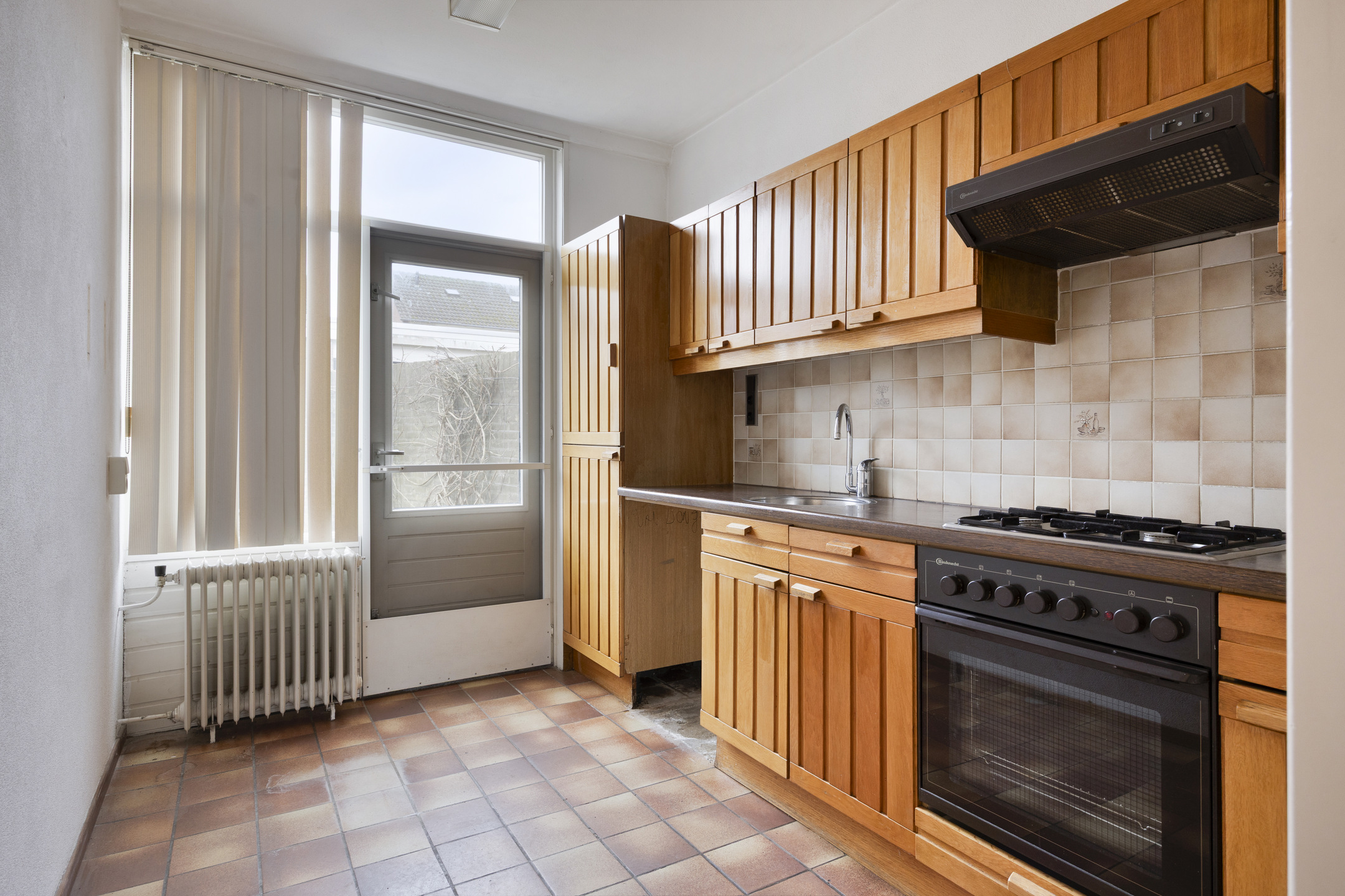 De keuken is uitgerust met een koel-vriescombinatie, een 4-pits gasfornuis en een oven. Daarnaast beschikt de keuken over een praktische trapkast voor extra bergruimte en biedt deze toegang tot zowel de woonkamer als de tuin.