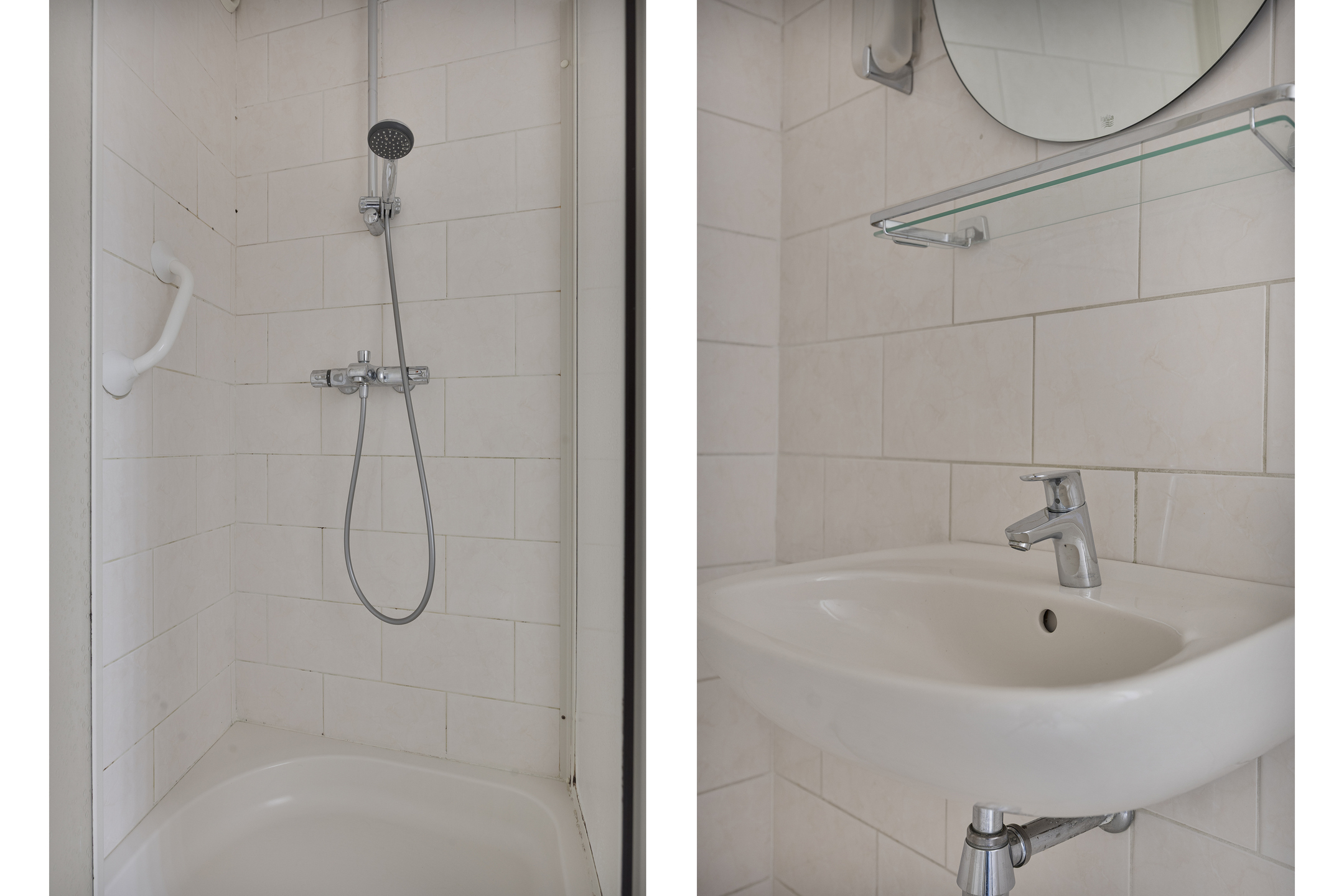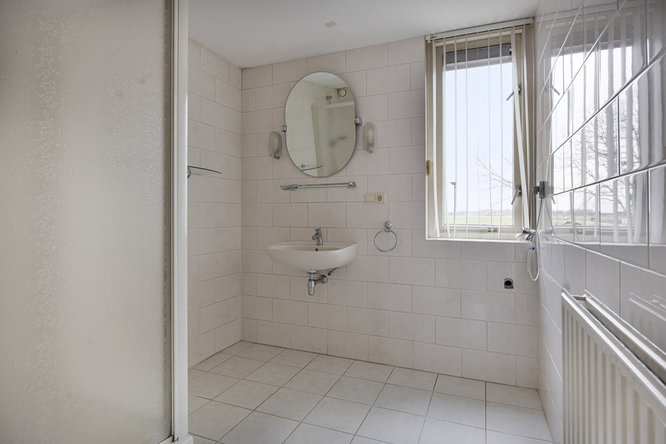 De ruime badkamer is voorzien van een douche en een wastafel.