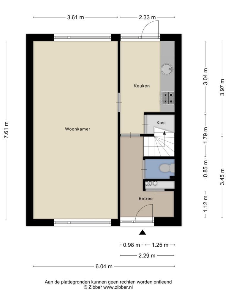 Bij binnenkomst komt u in de hal met meterkast, toilet en trapopgang naar de eerste verdieping. Vanuit de hal bereikt u de keuken.
