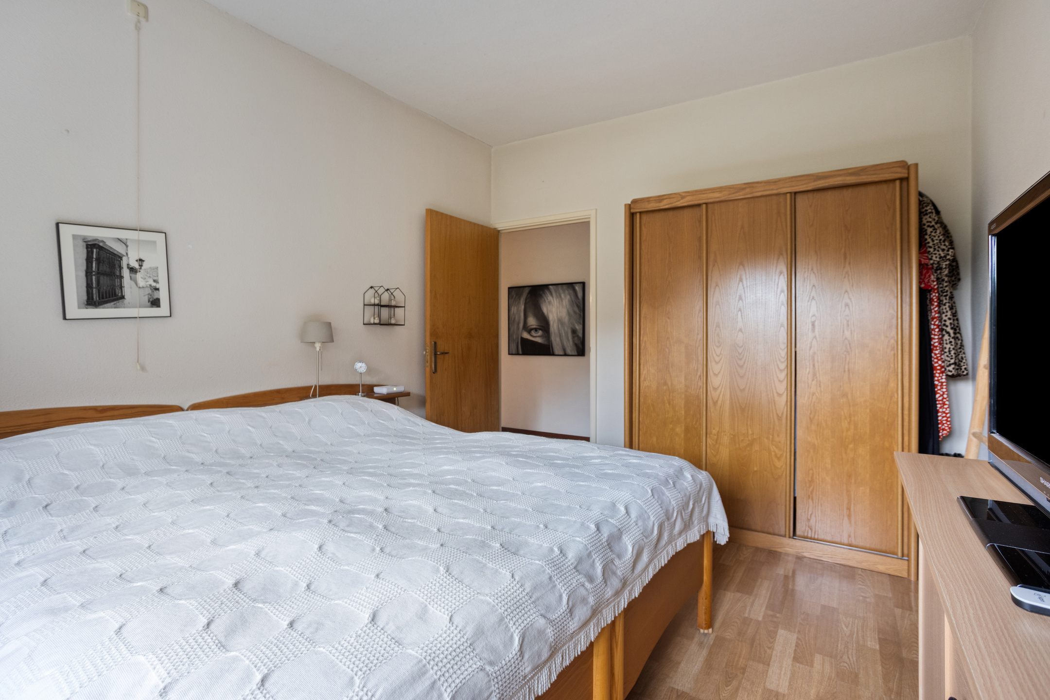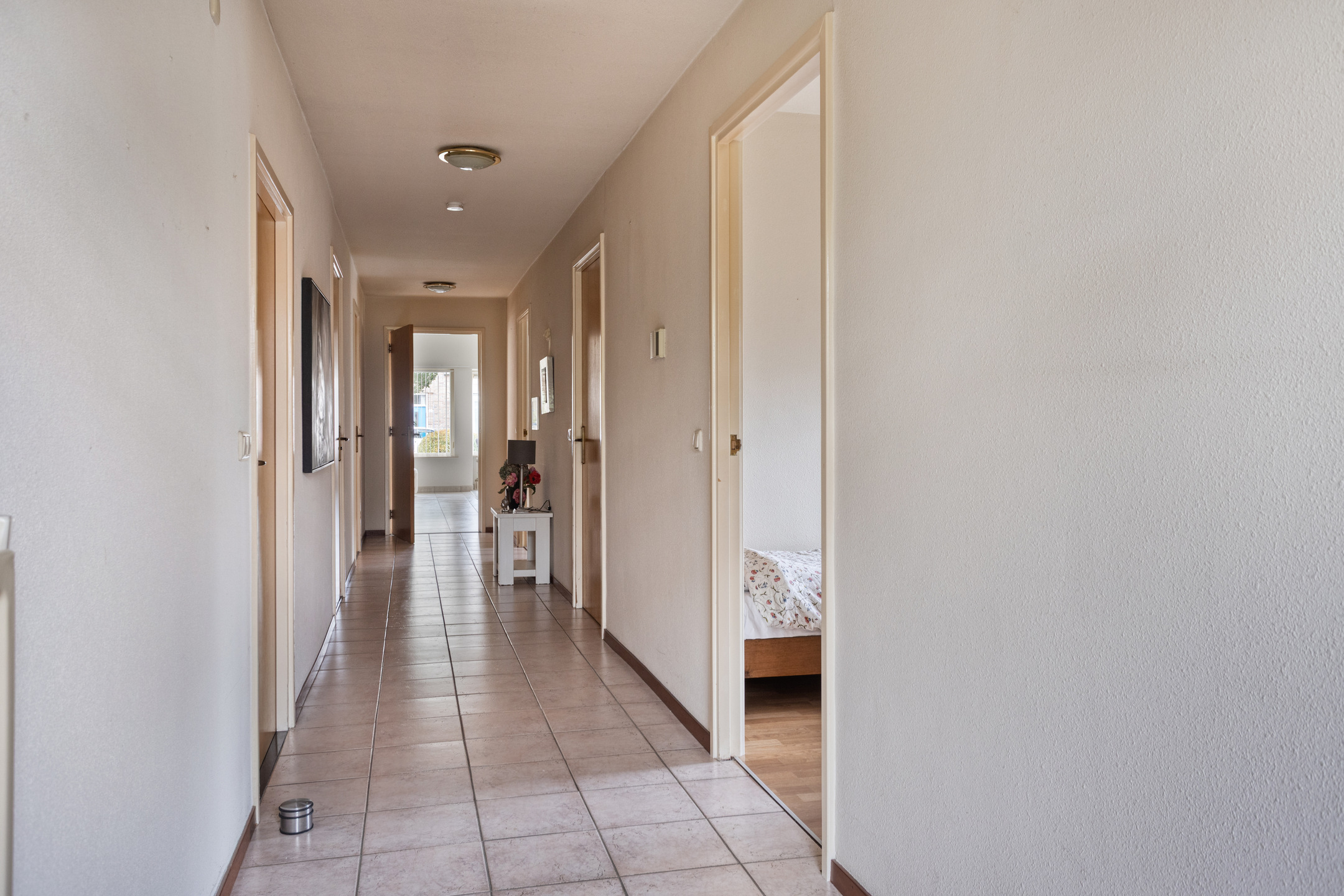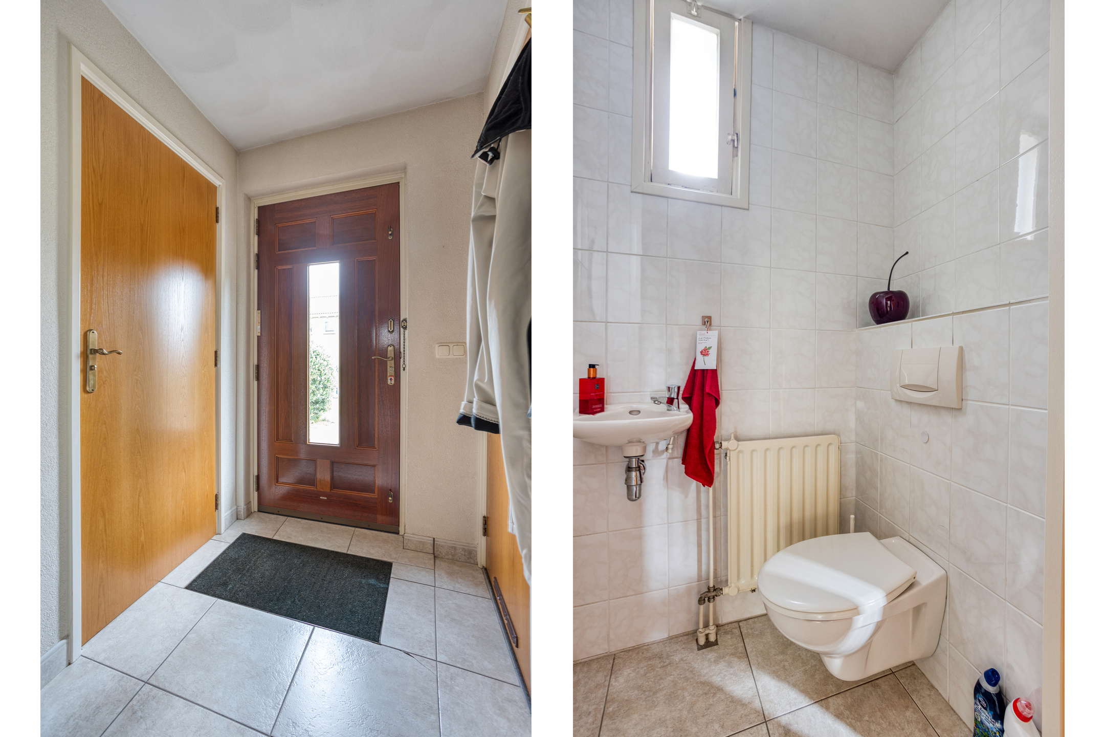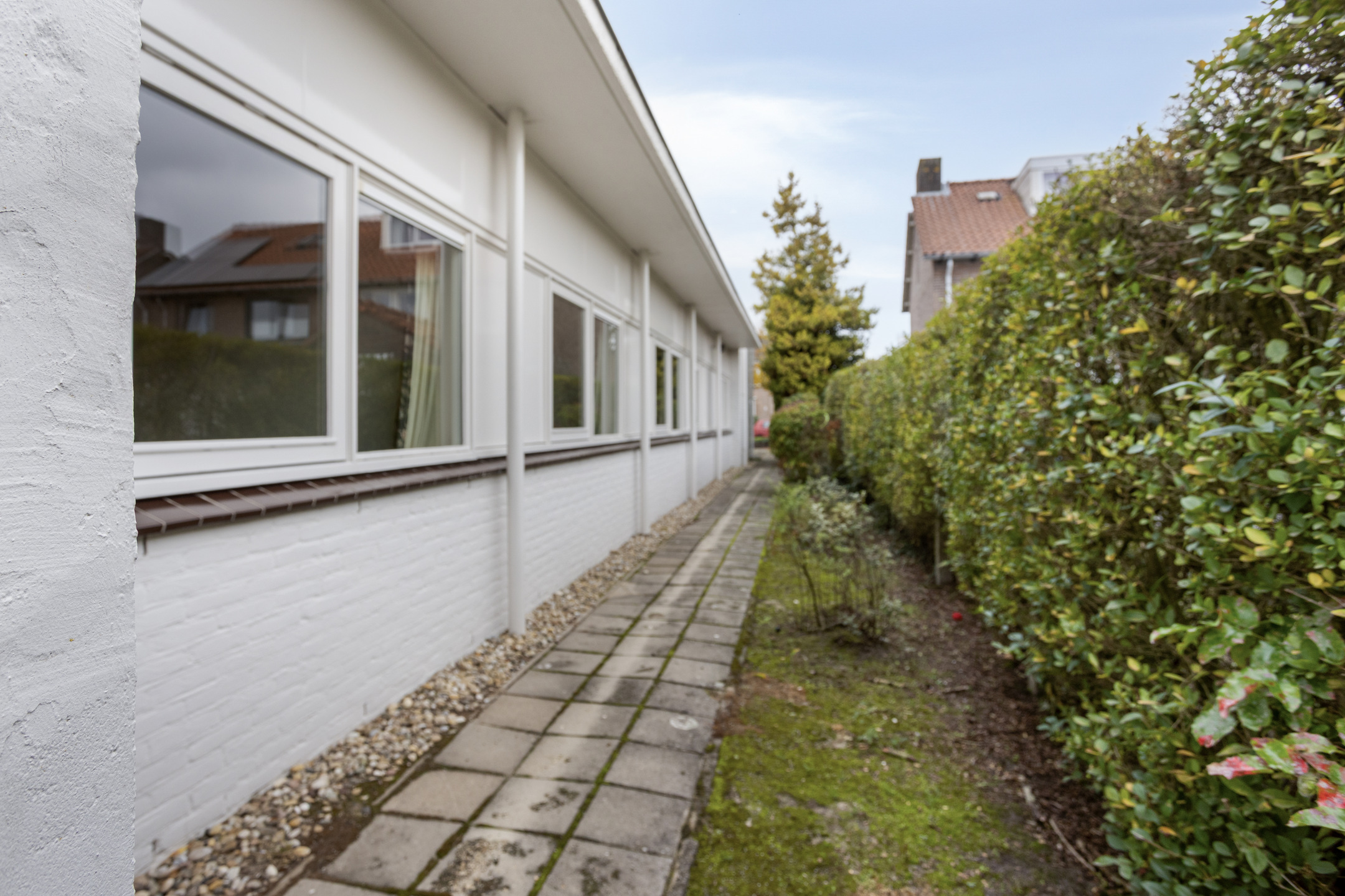 De hal geeft toegang tot de maar liefst 4 royale lichte slaapkamers, de moderne badkamer, de praktische bijkeuken met was voorzieningen en een berging. De moderne badkamer is uitgerust met een inloopdouche, ligbad, wastafel en tweede toilet. Alles is gelijkvloers, wat het wooncomfort aanzienlijk vergroot. Aan het einde van de hal geeft een deur toegang tot het terras achter de woning. Vanuit de berging heeft u toegang tot de inpandige garage, ideaal voor het stallen van de auto, fietsen of als hobbyruimte. In de berging bevindt zich de toegang naar de ruimte waar de CV-ketel is geplaatst.