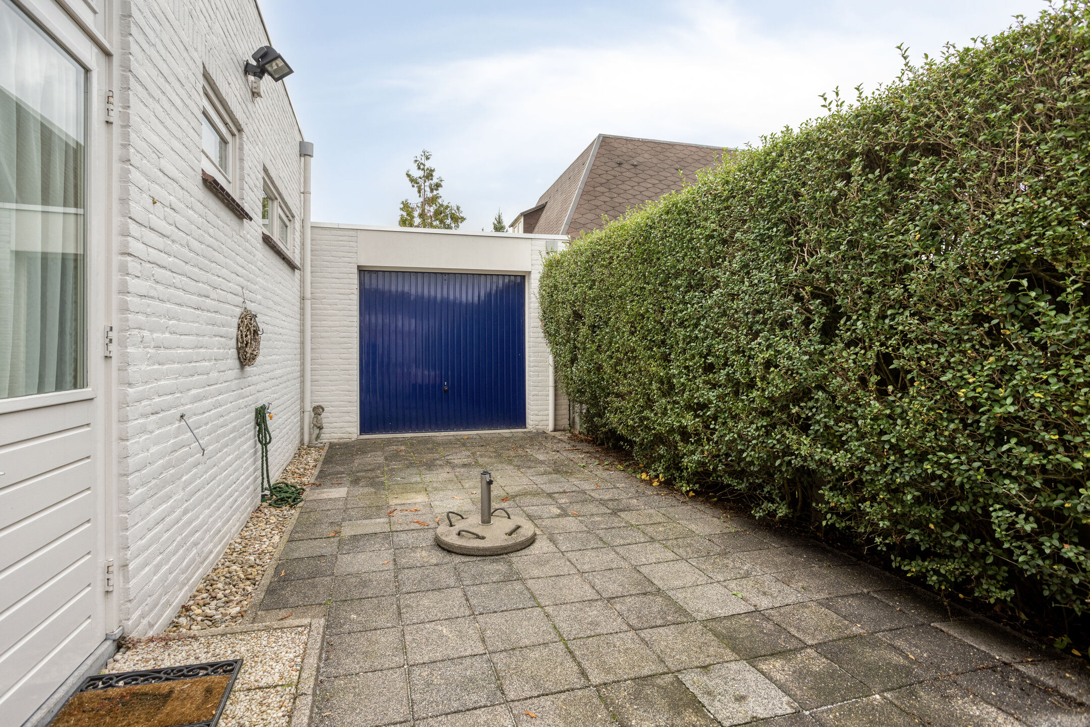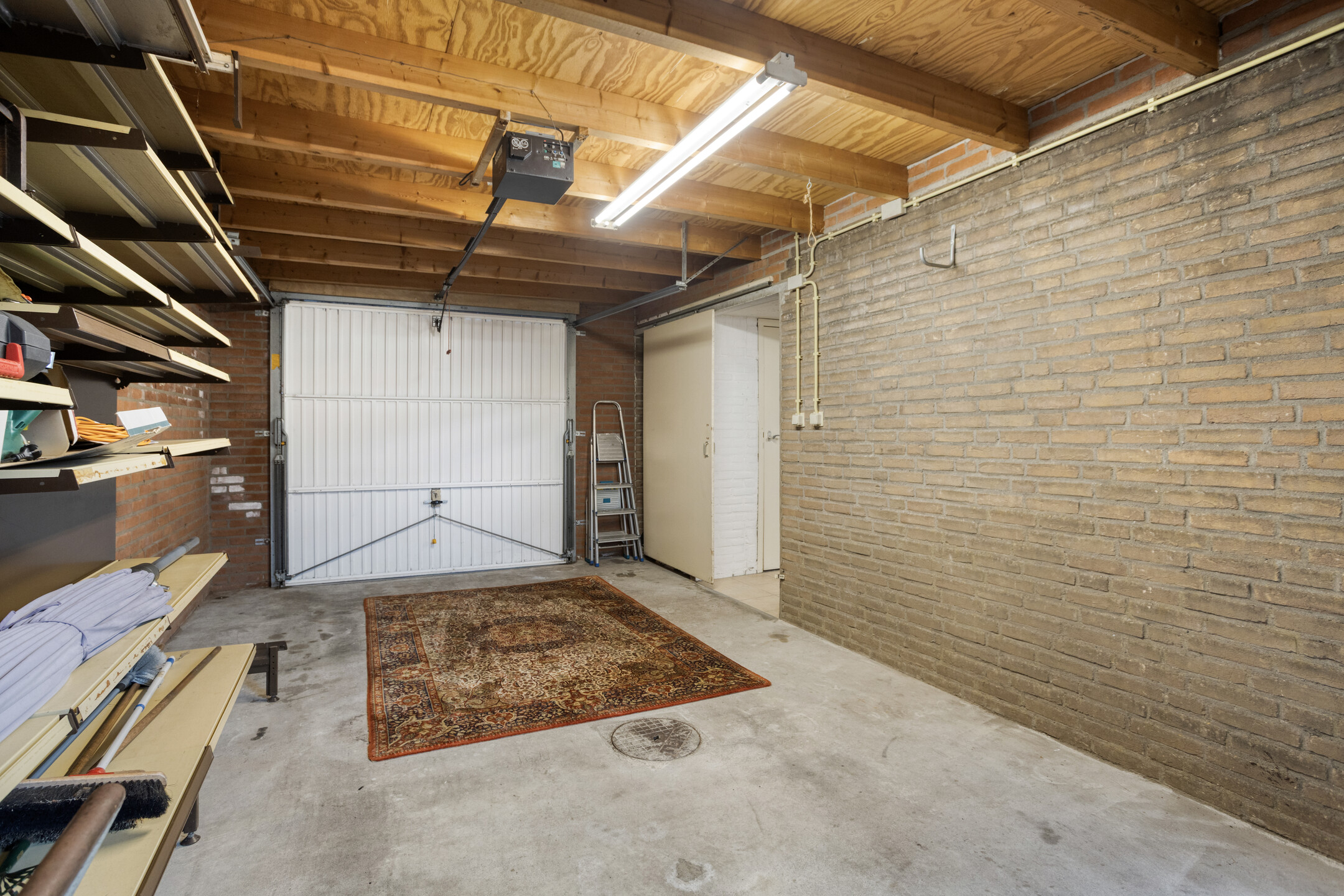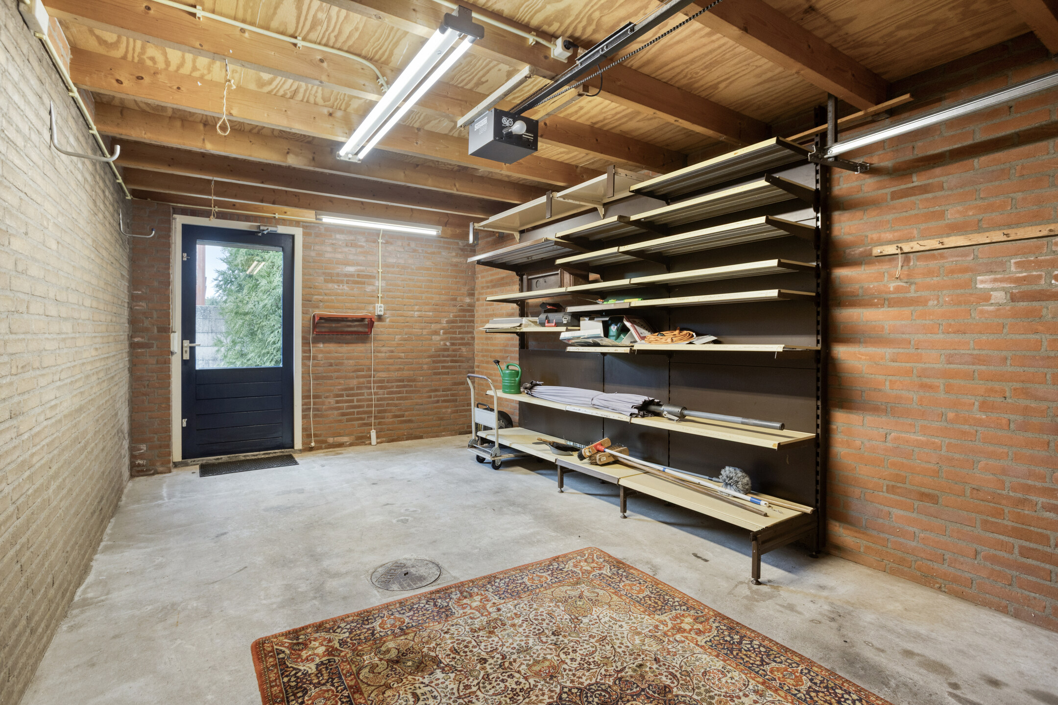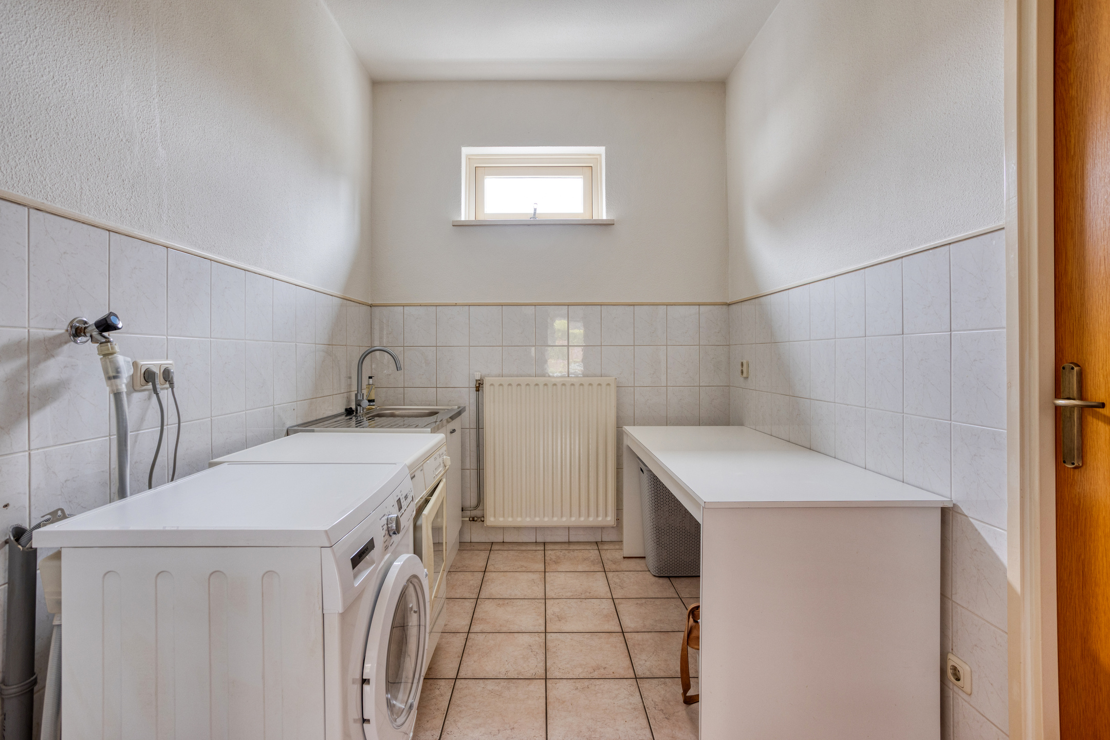 Aansluitend bevindt zich een praktische bijkeuken met wasmachineaansluiting en extra bergruimte. De garage beschikt over een elektrische garagedeur en een loopdeur naar de tuin.