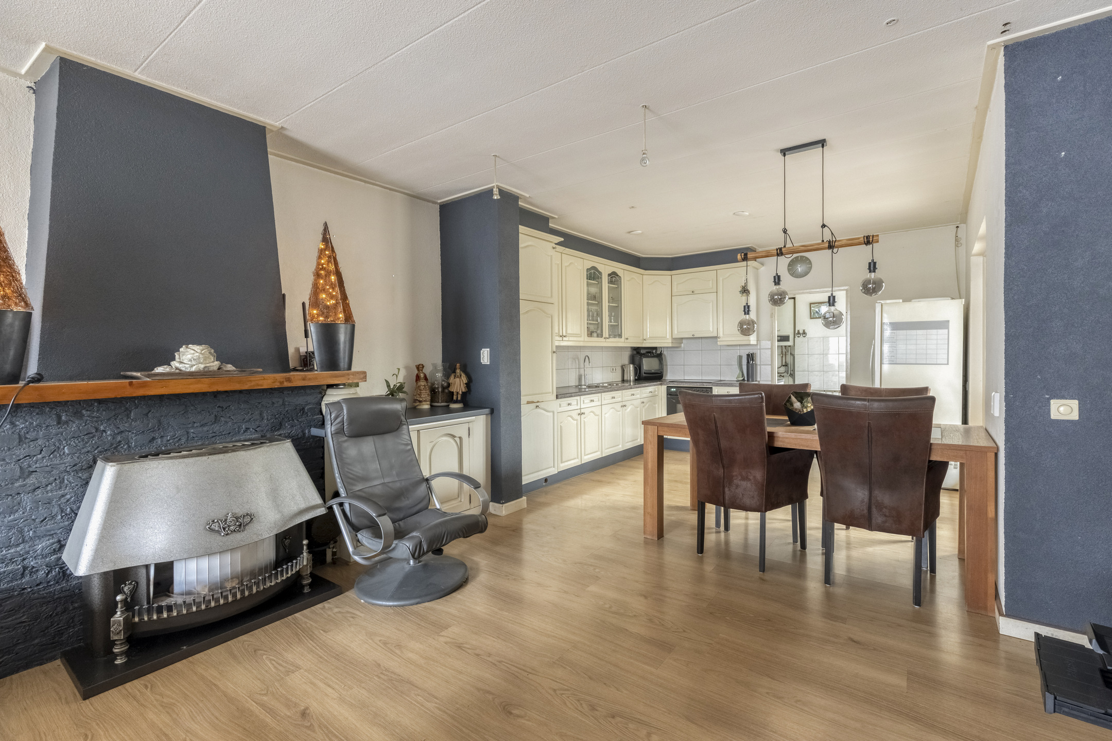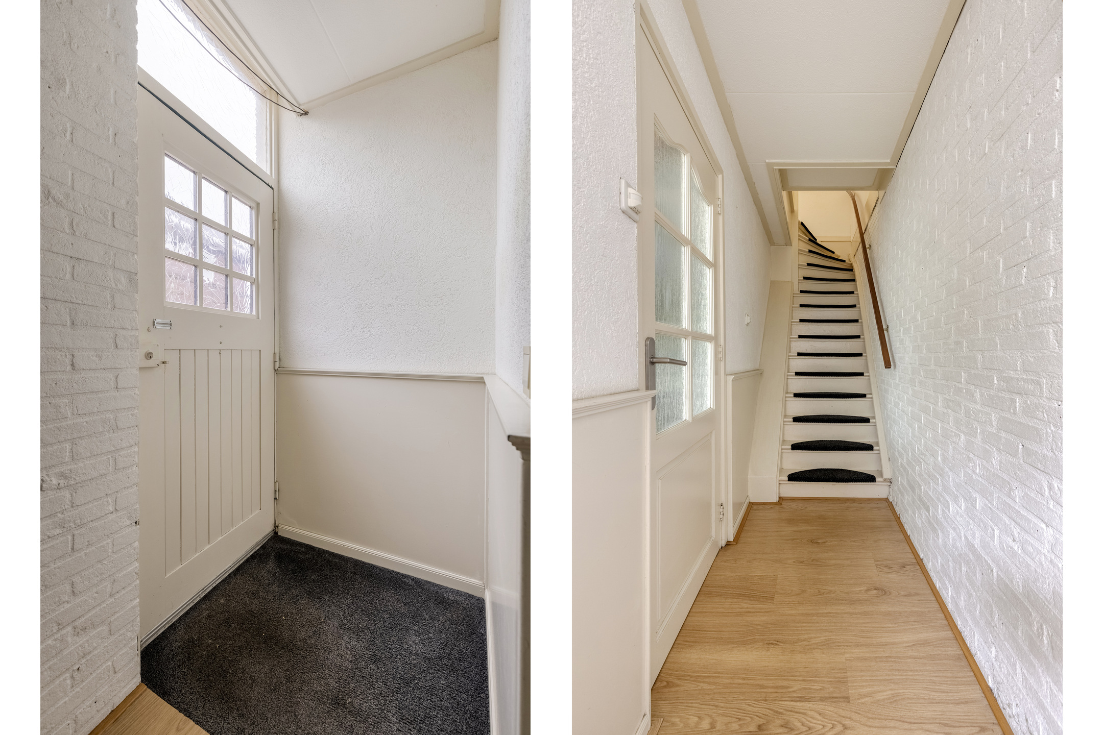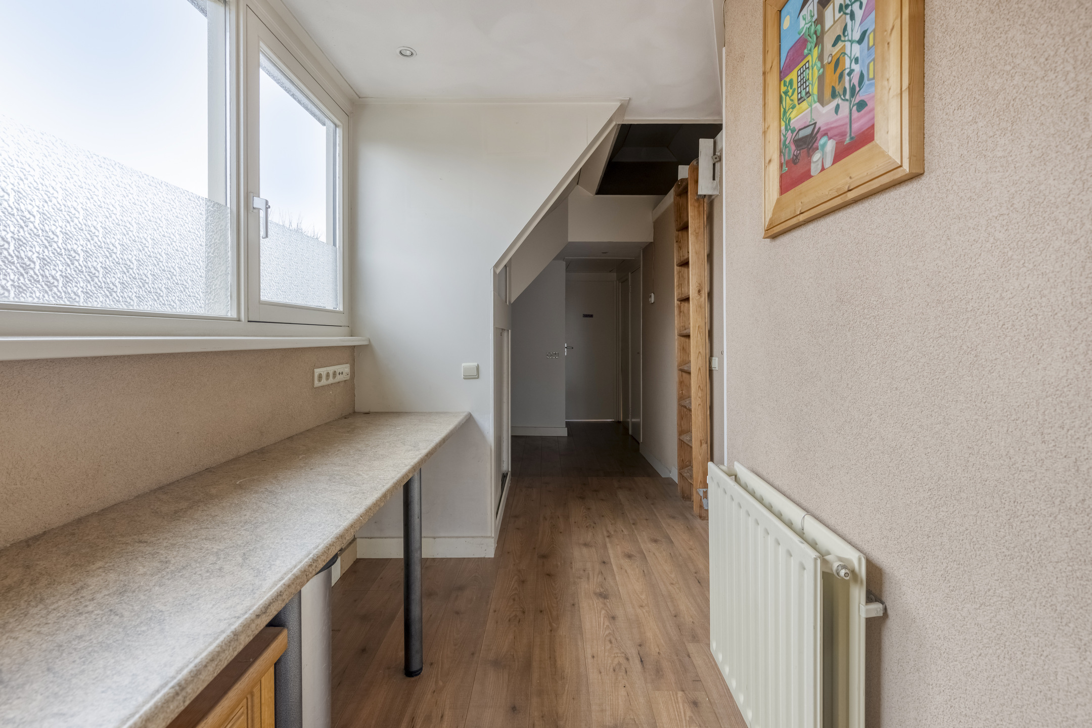 Via de entree bereikt u de woonkamer, waar de gashaard zorgt voor een sfeervol middelpunt. Daarnaast is er een praktische trapkast aanwezig voor extra opbergruimte.