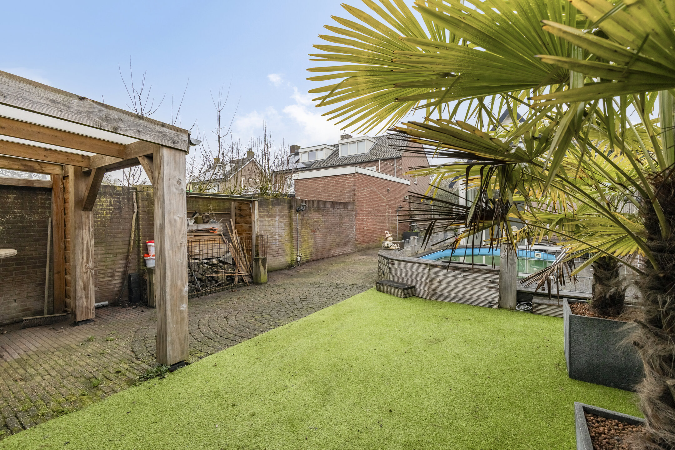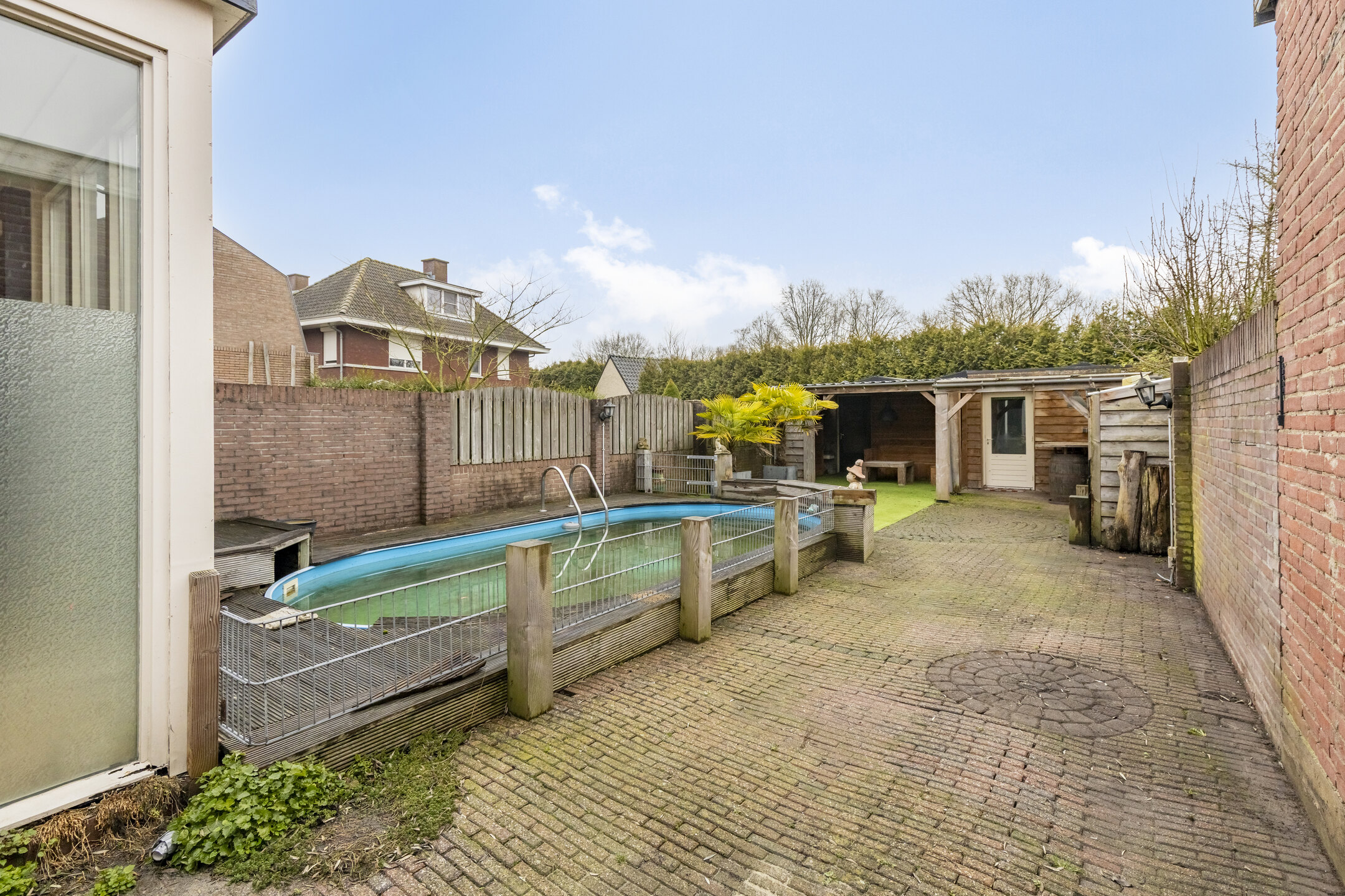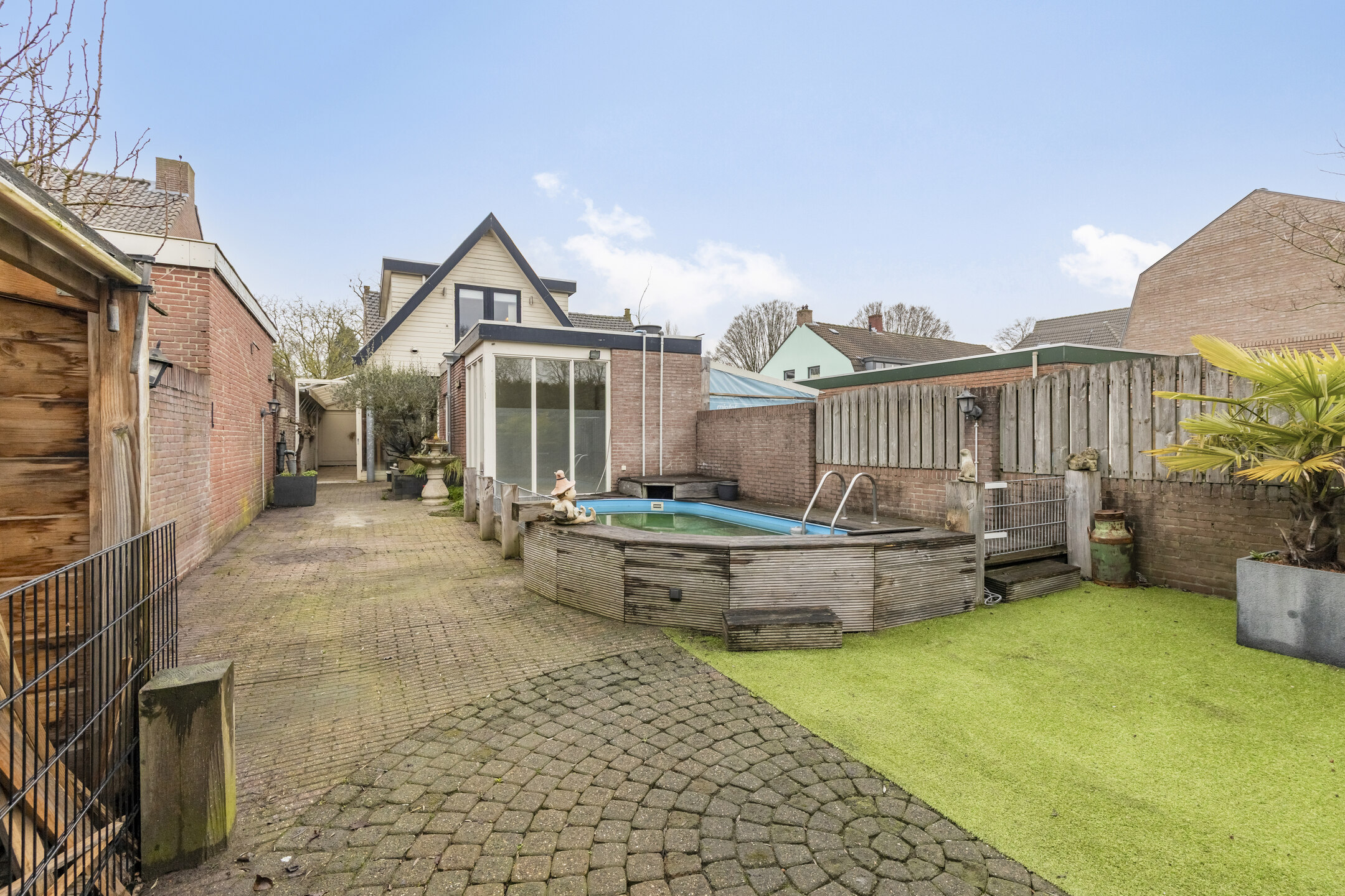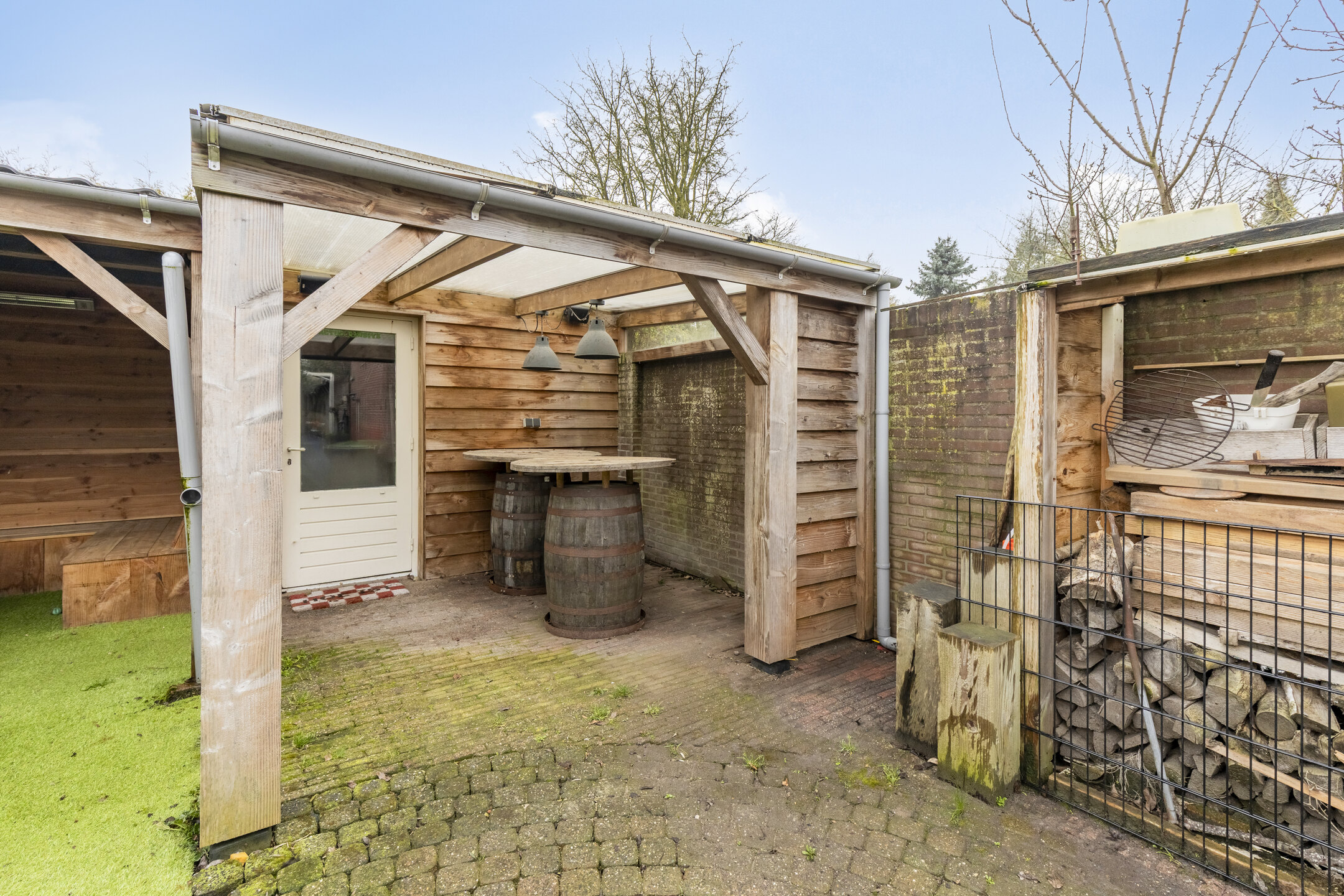 De achtertuin biedt diverse mogelijkheden om te ontspannen en te genieten. Er is een zwembad aanwezig, evenals een schuur en een bar. Daarnaast zorgt de overkapping voor een beschutte plek om buiten te zitten.