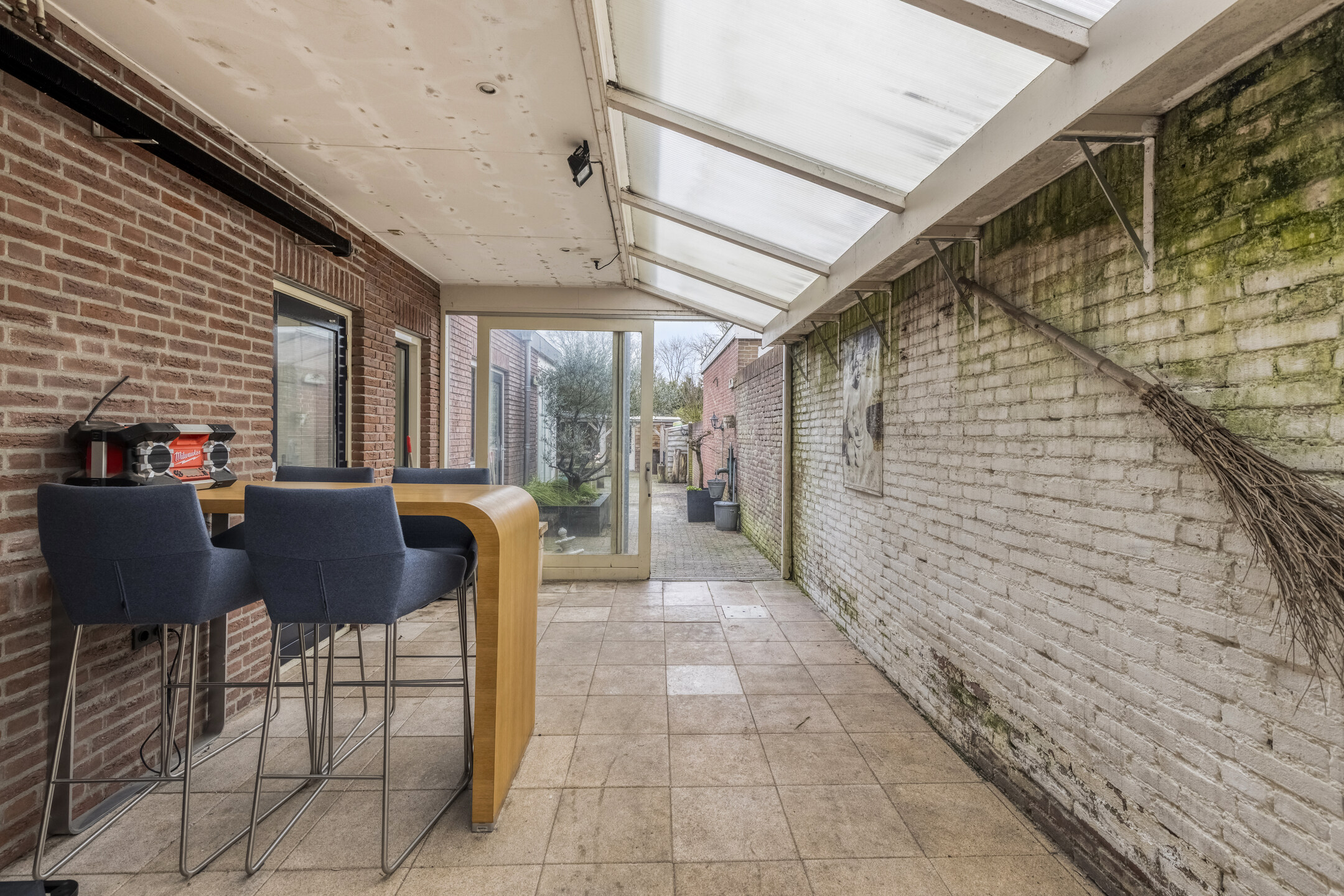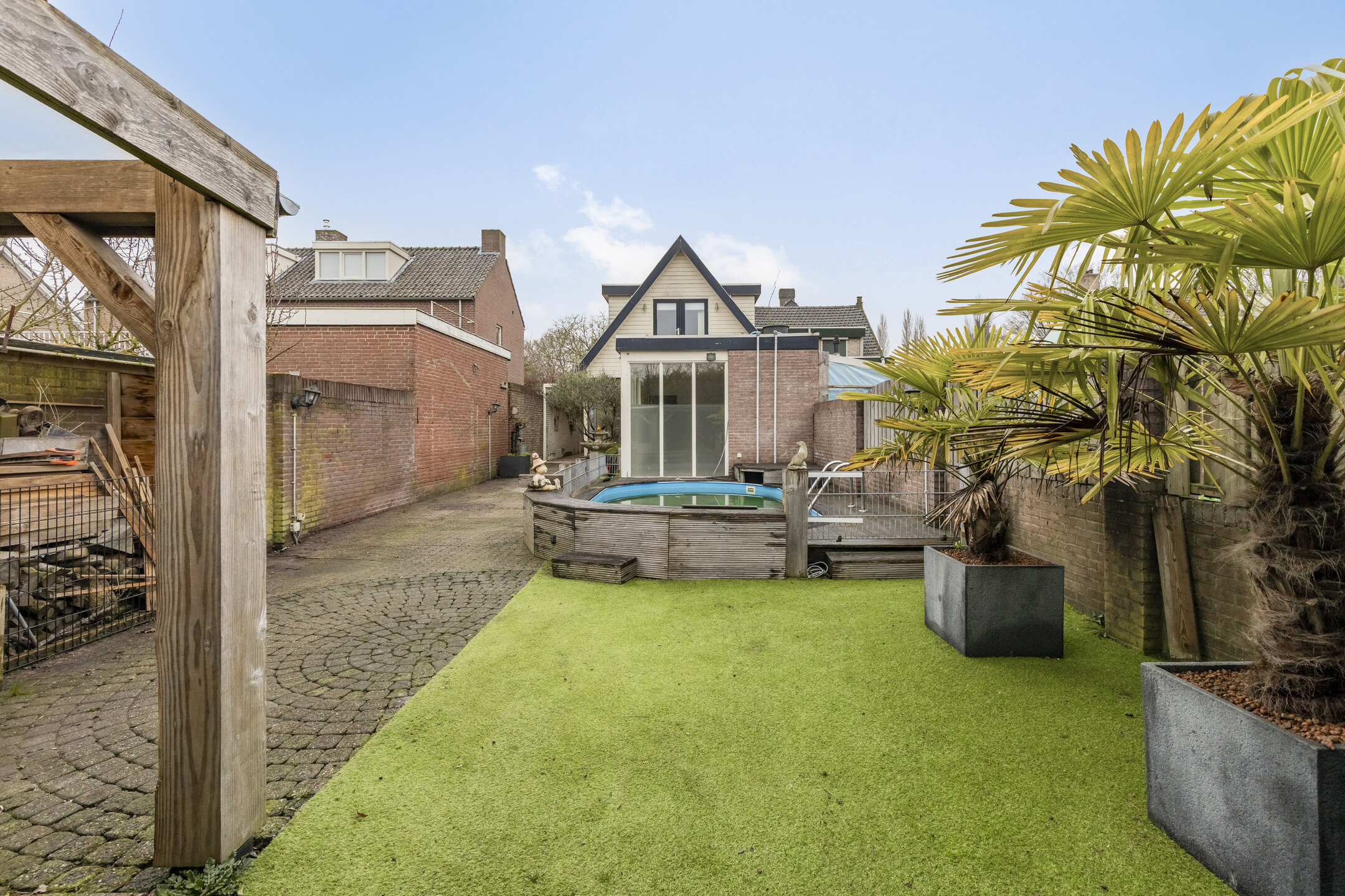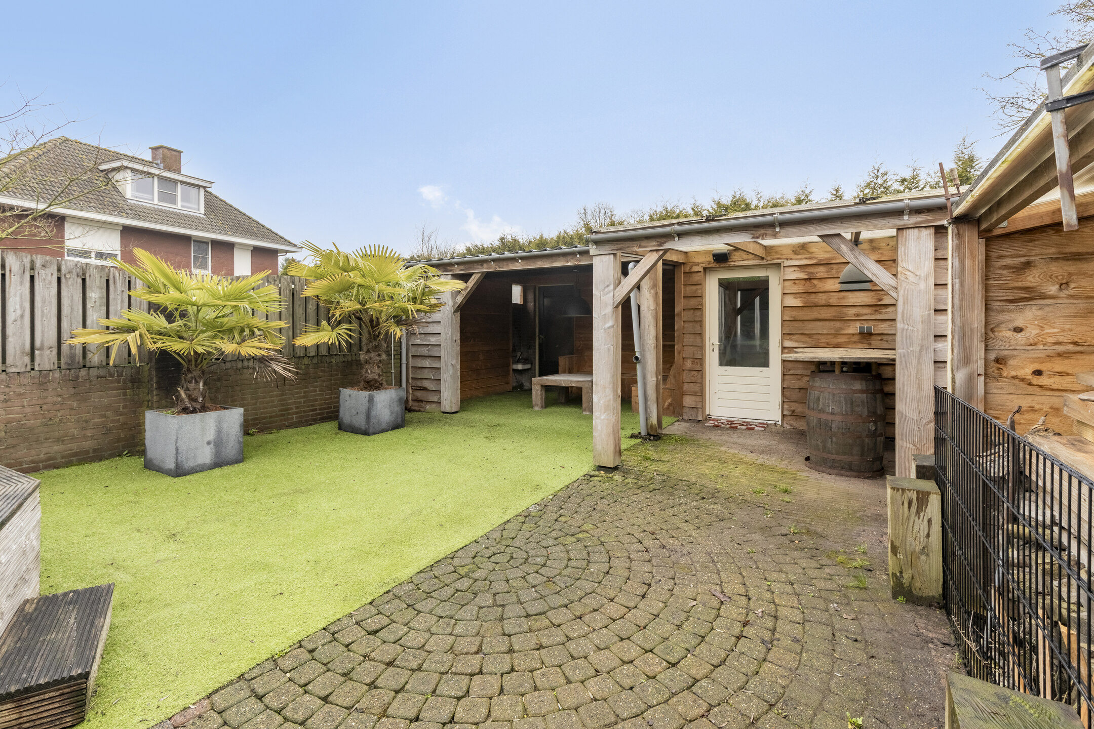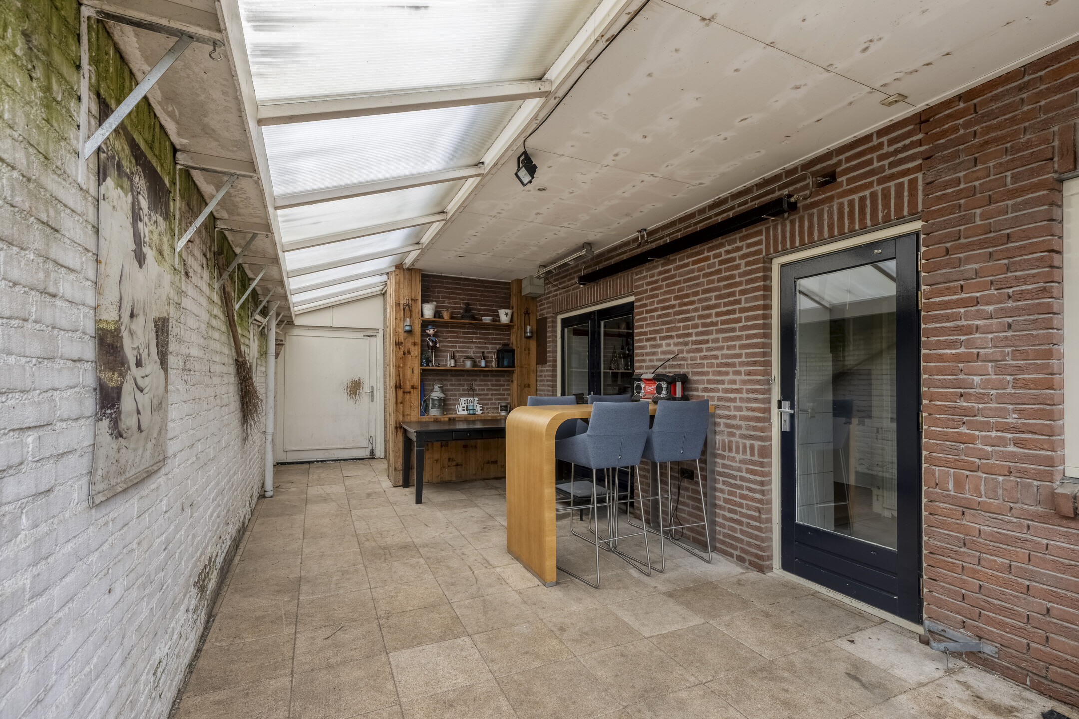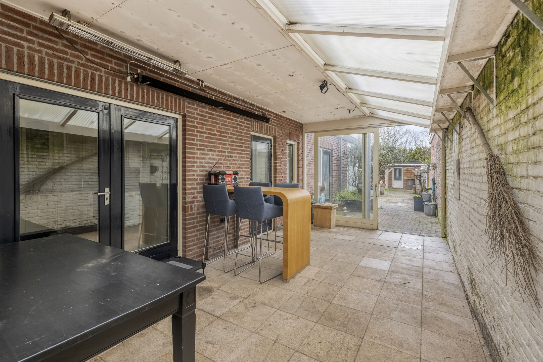 De achtertuin biedt diverse mogelijkheden om te ontspannen en te genieten. Er is een zwembad aanwezig, evenals een schuur en een bar. Daarnaast zorgt de overkapping voor een beschutte plek om buiten te zitten.