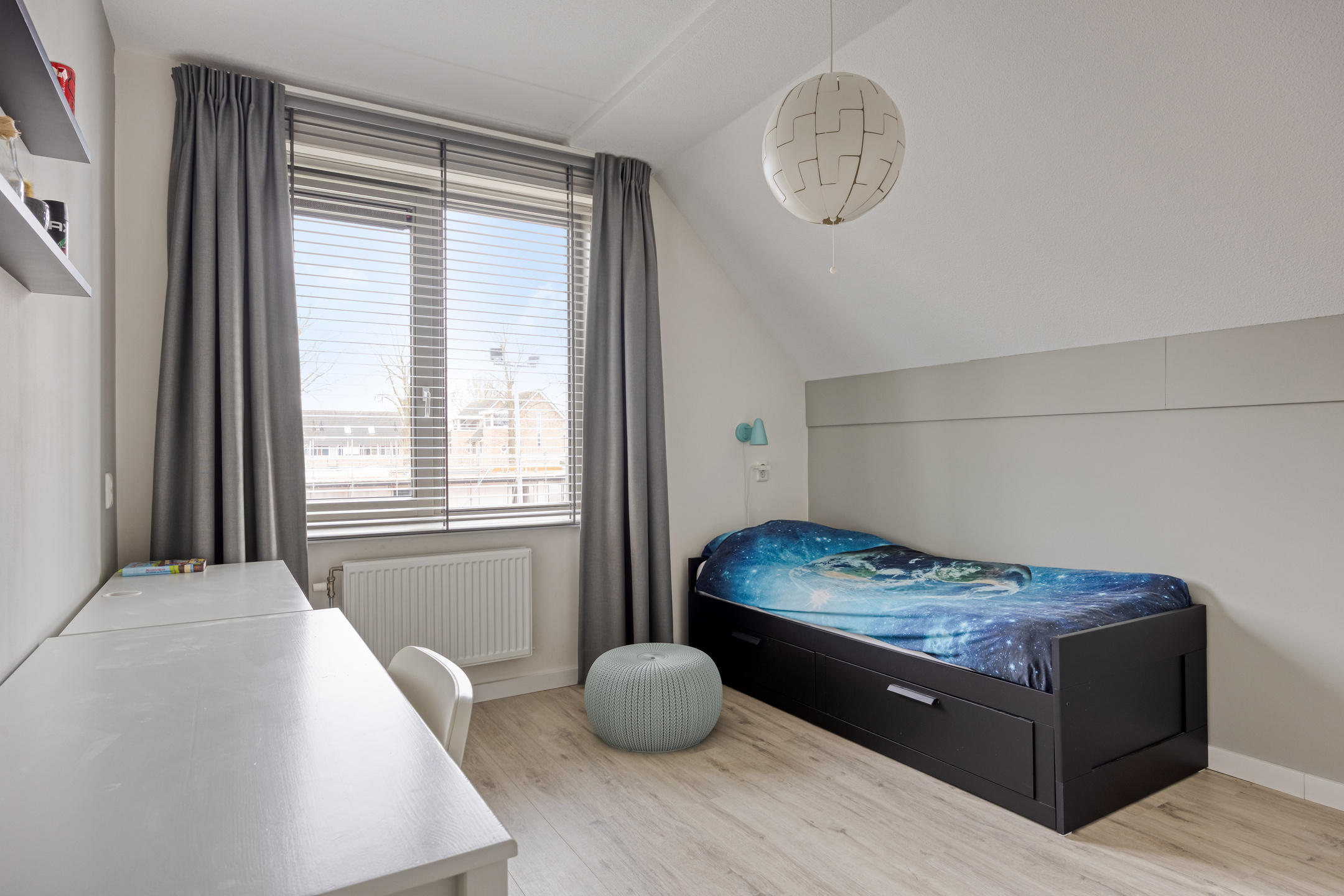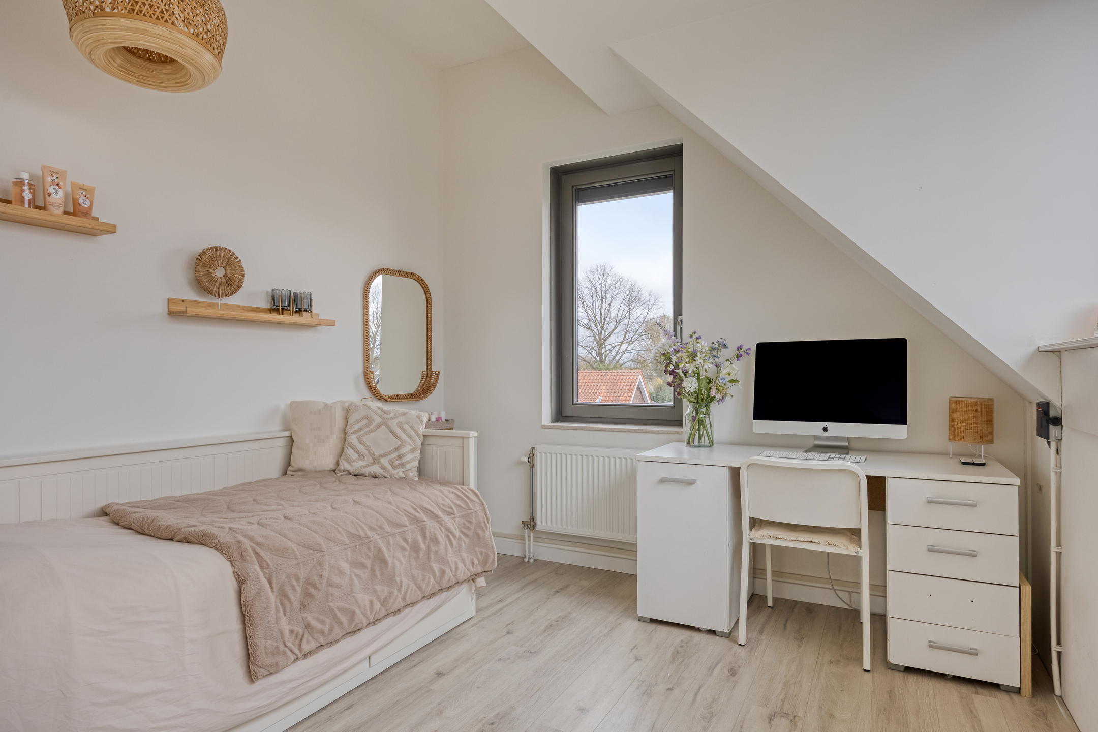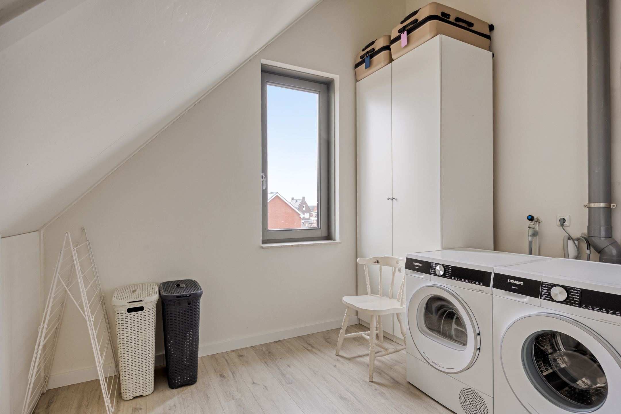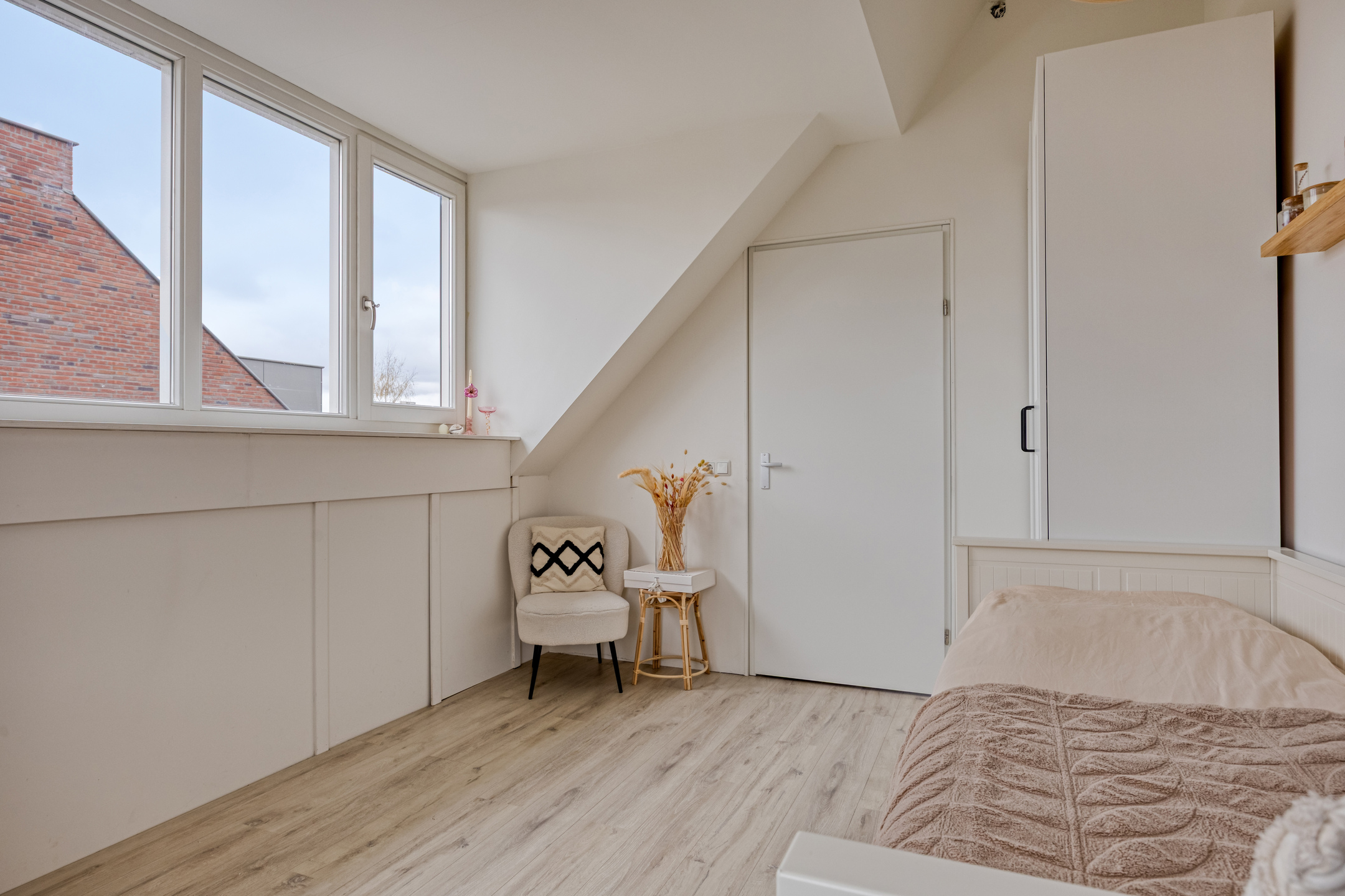 De tweede verdieping biedt een ruime slaapkamer aan de achterzijde, voorzien van een dakkapel die zorgt voor veel natuurlijk licht. Daarnaast is er een aparte wasruimte aan de voorzijde met aansluitingen voor de wasmachine en droger en de opstelplaats van de cv-ketel.
