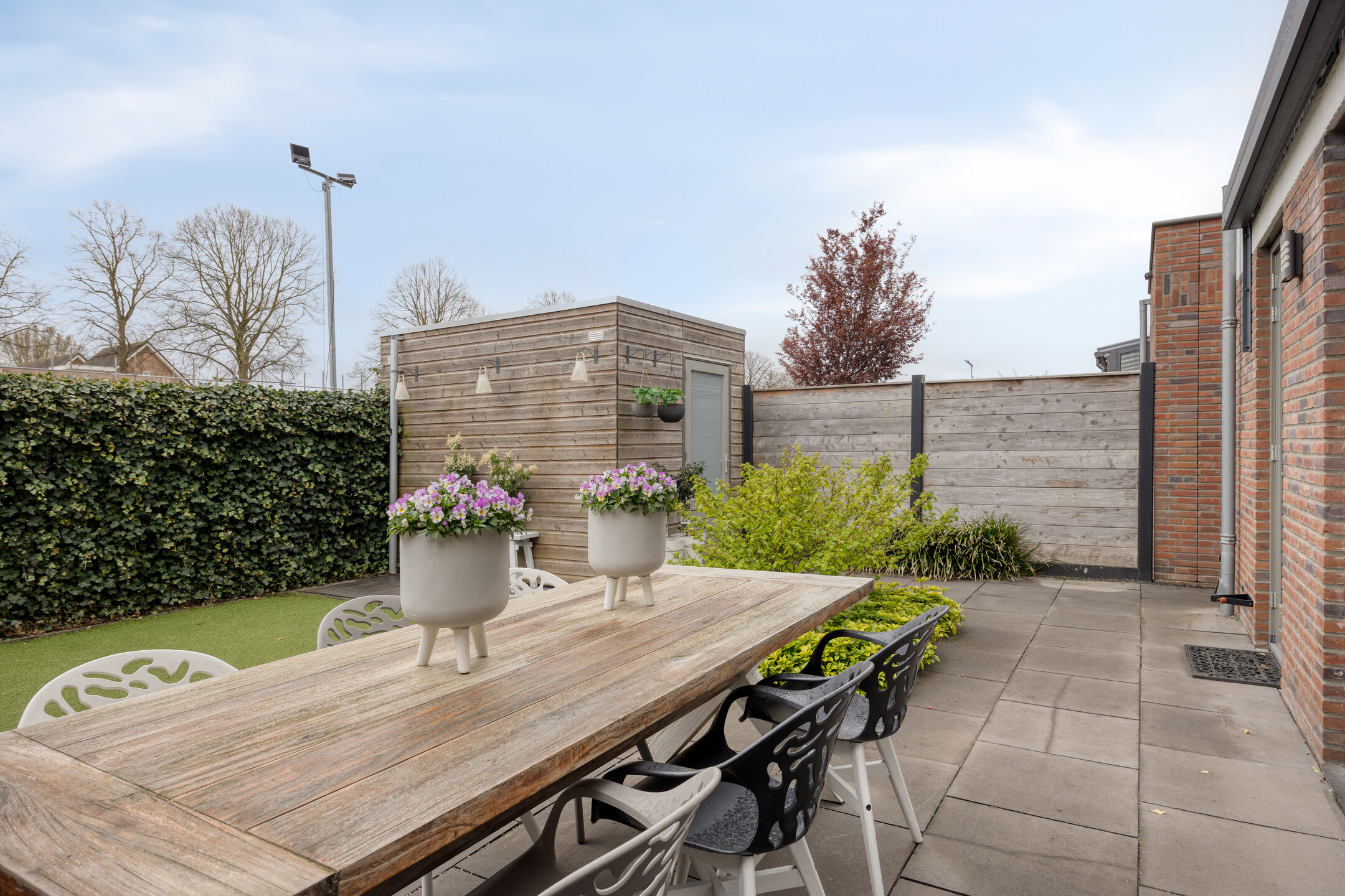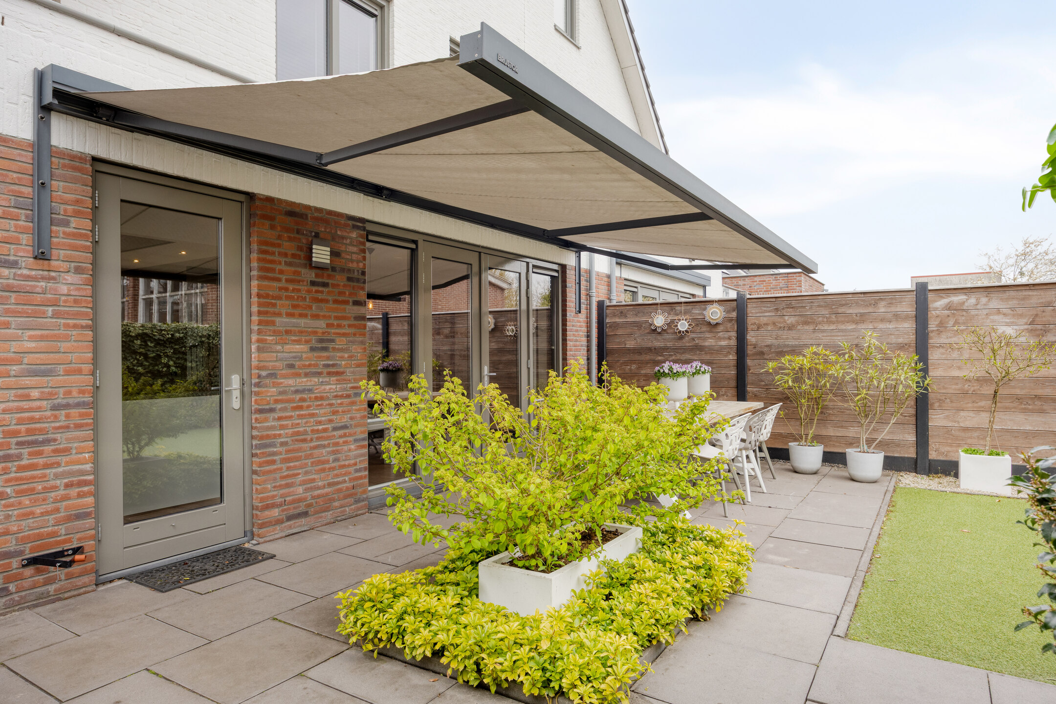 De achtertuin is deels betegeld en biedt een fijne plek om te ontspannen en te genieten van het buitenleven. Dankzij het aanwezige zonnescherm kunt u hier ook op zonnige dagen comfortabel zitten. Achterin de tuin bevindt zich een houten berging met elektra, ideaal voor het opbergen van fietsen en tuingereedschap. De tuin is daarnaast bereikbaar via een praktische achterom.