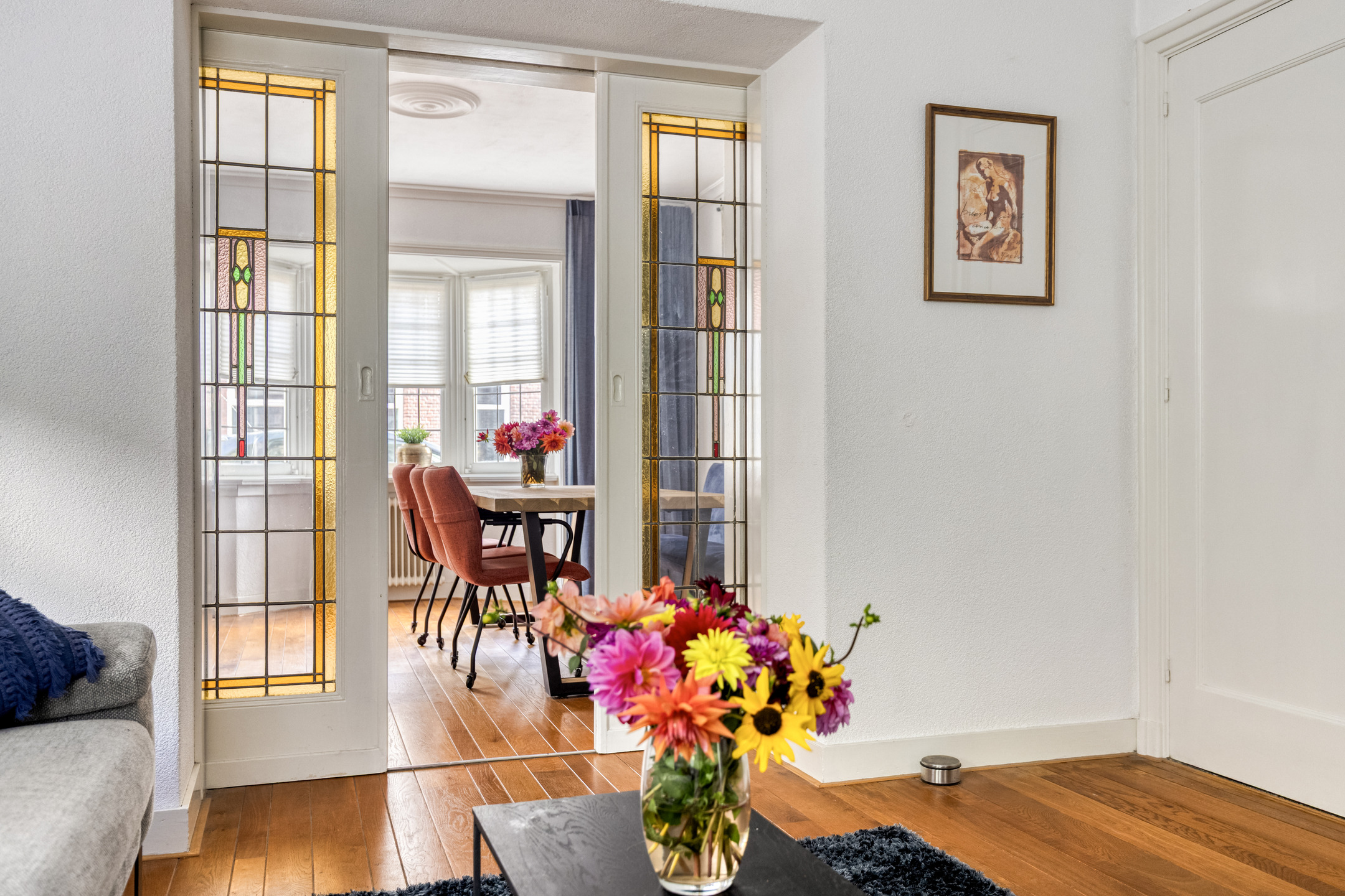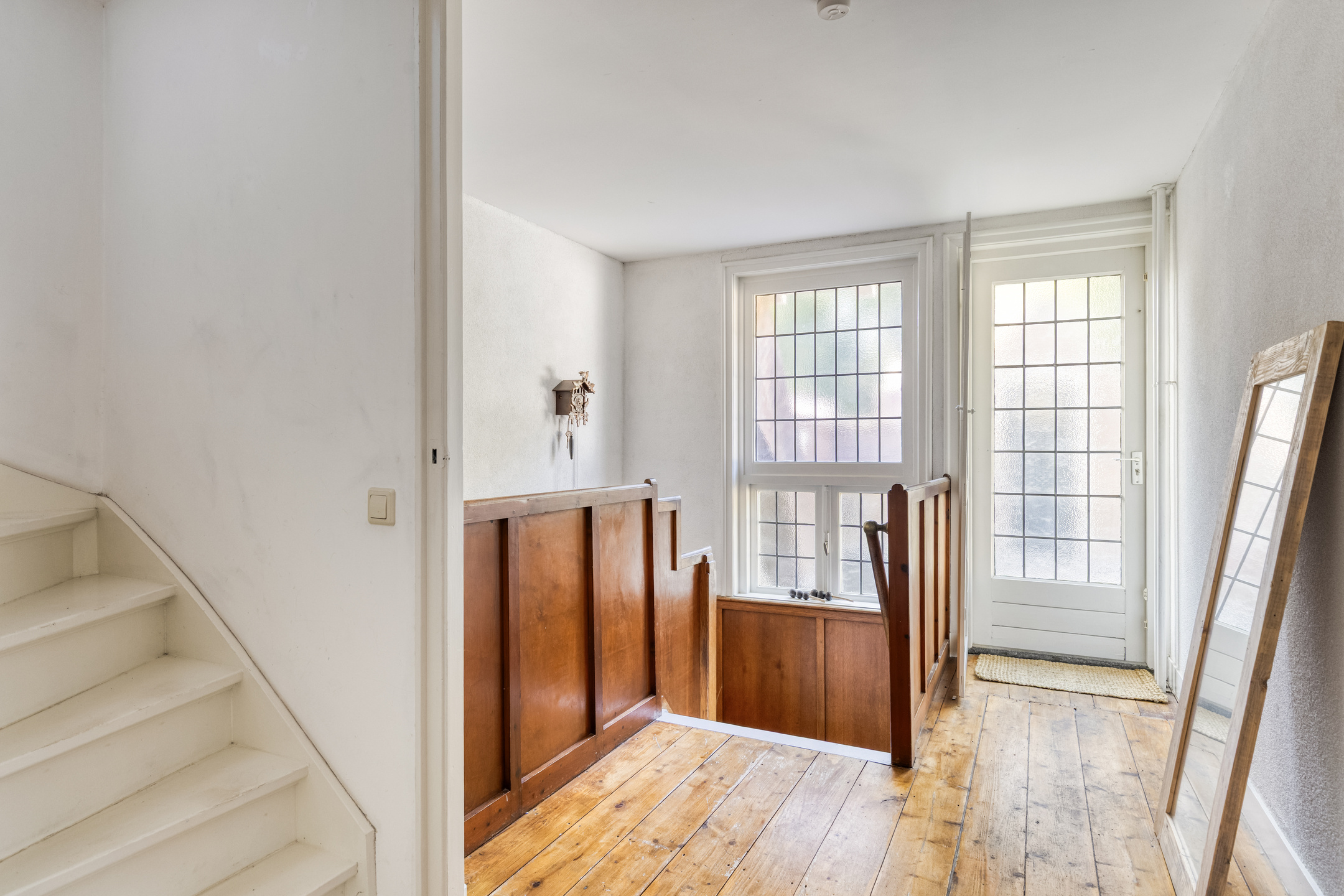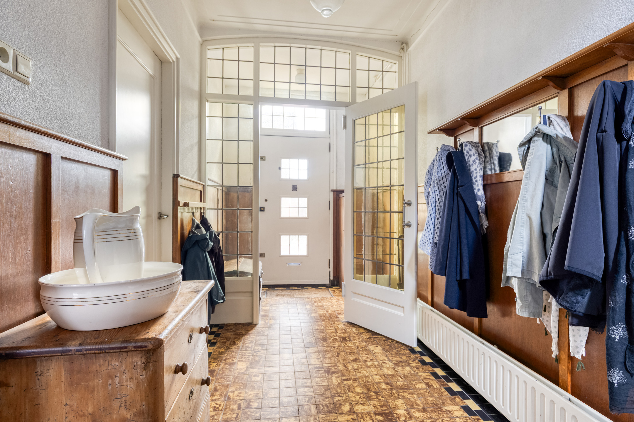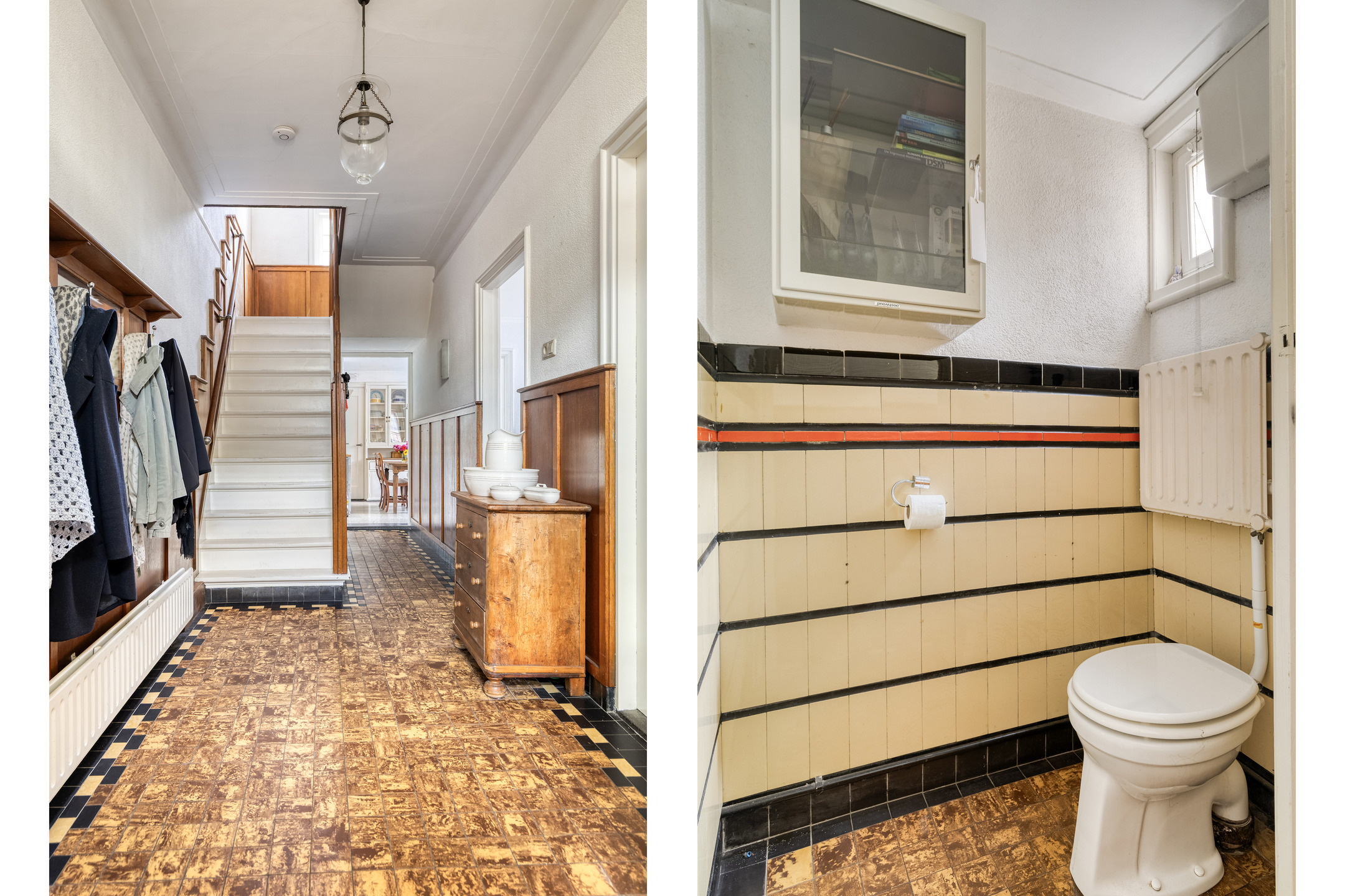 Bij binnenkomst valt direct de originele voordeur met glas-in-lood op. De hal verwelkomt u met een klassieke tegelvloer, houten lambrisering en een fraaie trapopgang met bordes. Onder de trap bevindt zich het toilet.