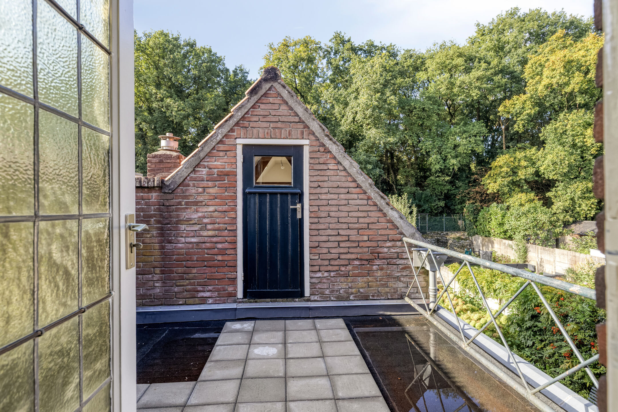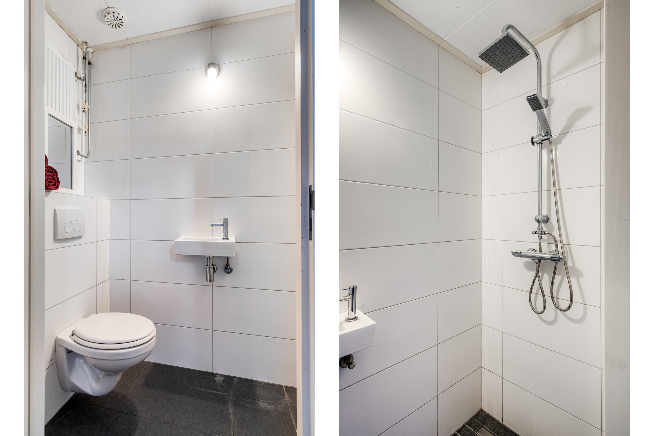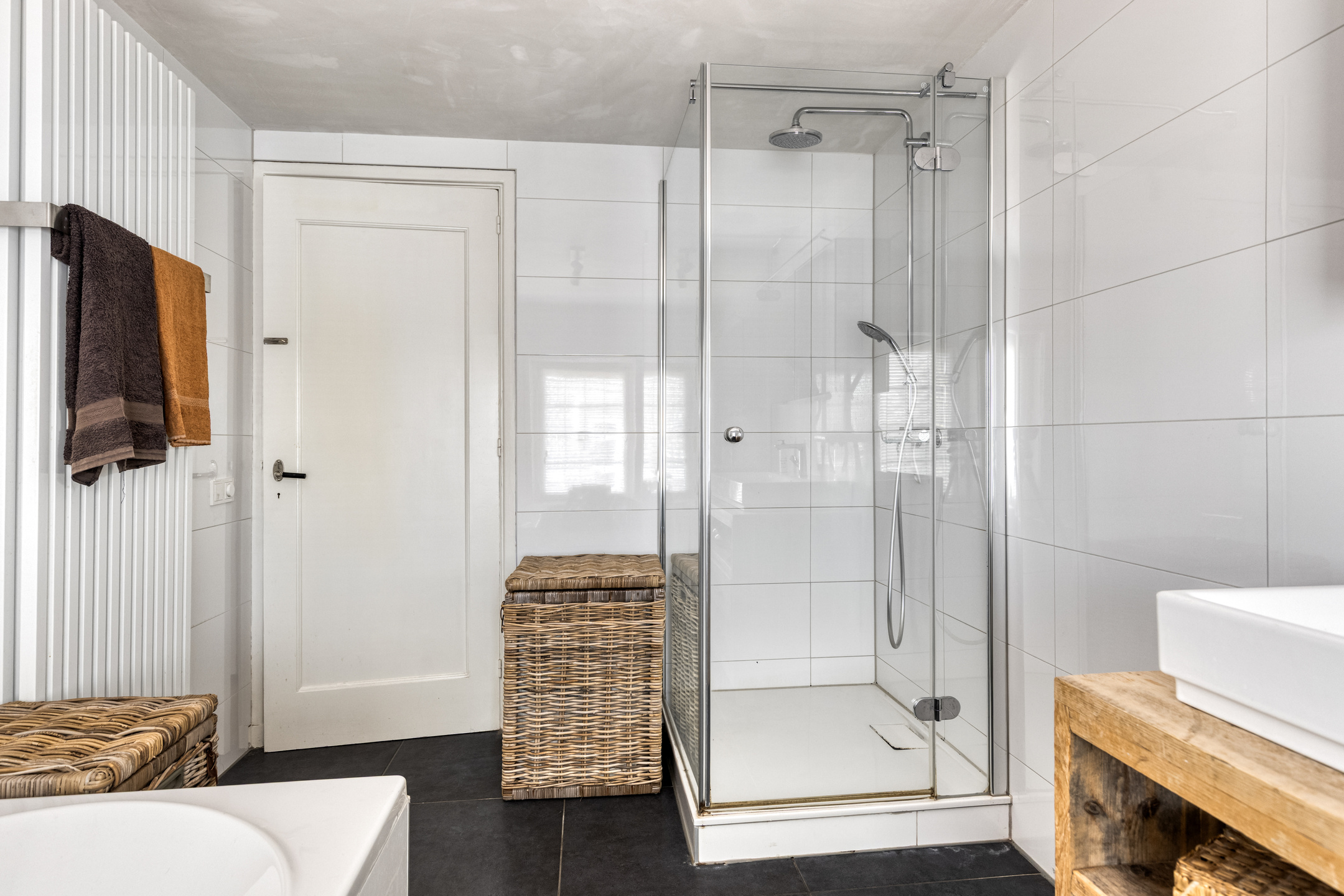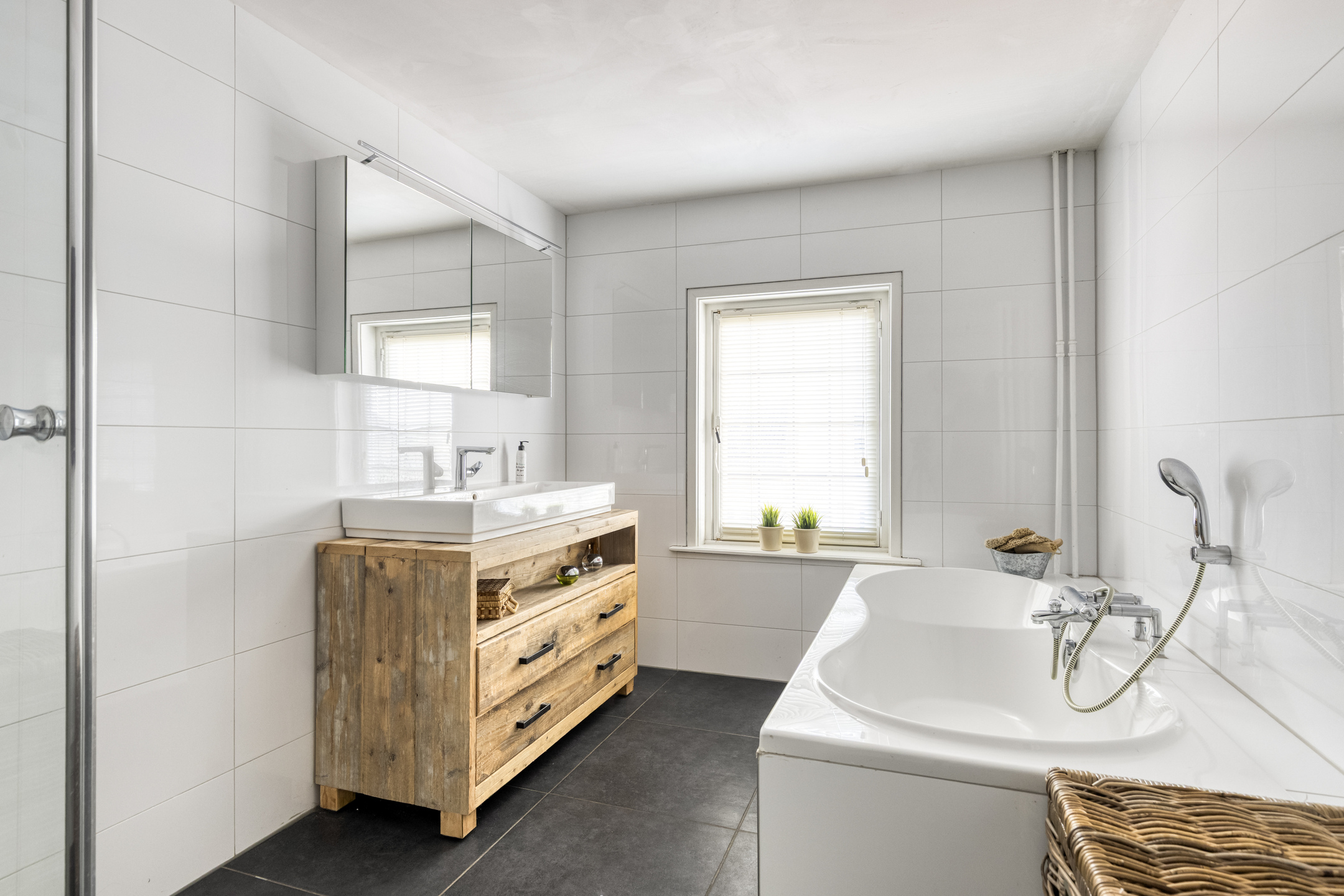 De badkamer is licht en modern uitgevoerd in wit en grijs, voorzien van douchecabine, ligbad, wastafelmeubel en handdoekradiator. Vanaf de overloop is het platte dak bereikbaar, dat toegang biedt tot de bergzolder.
