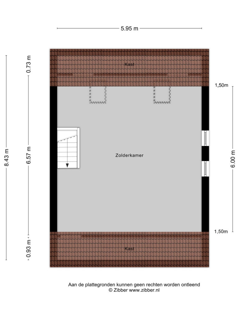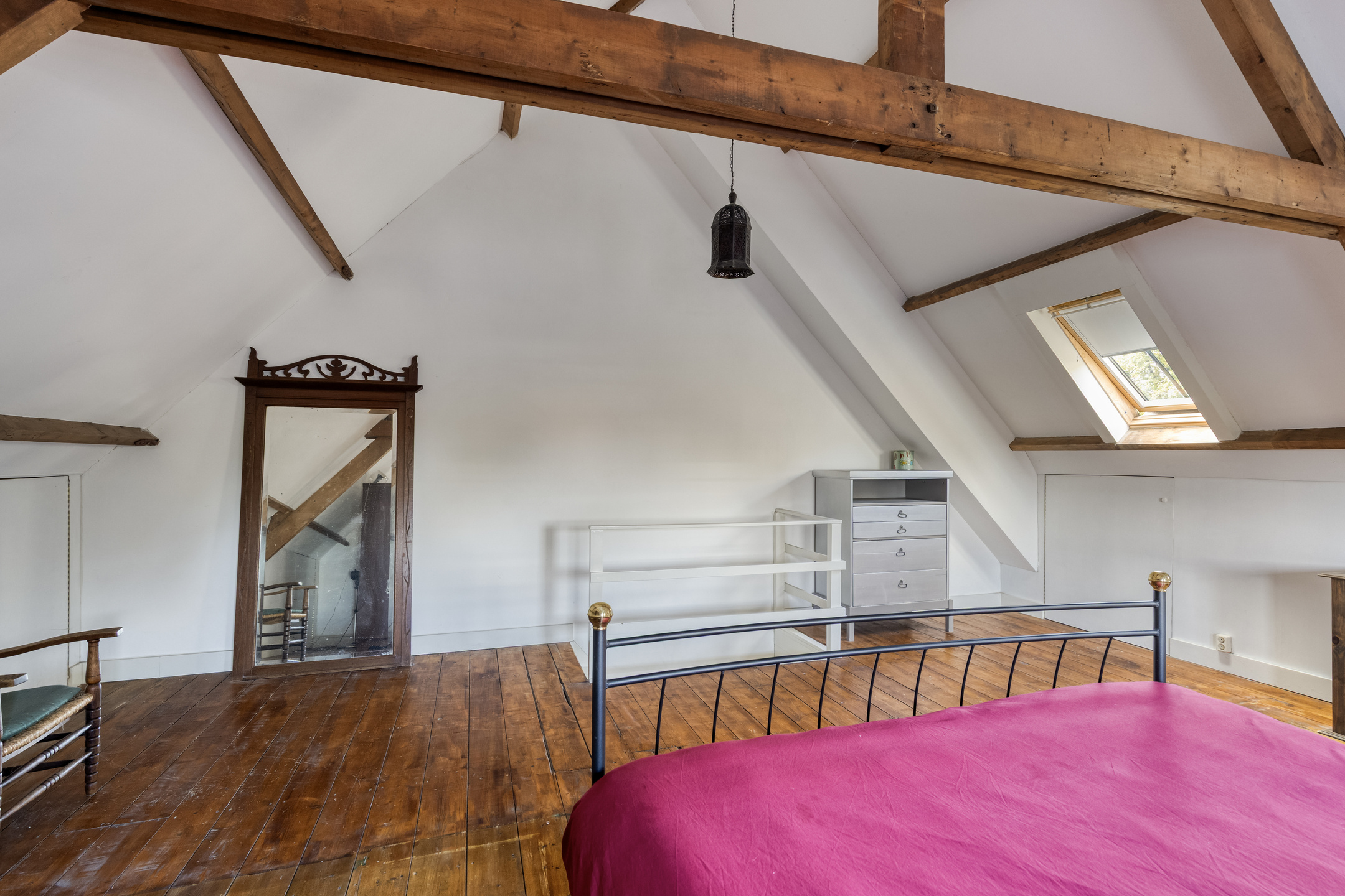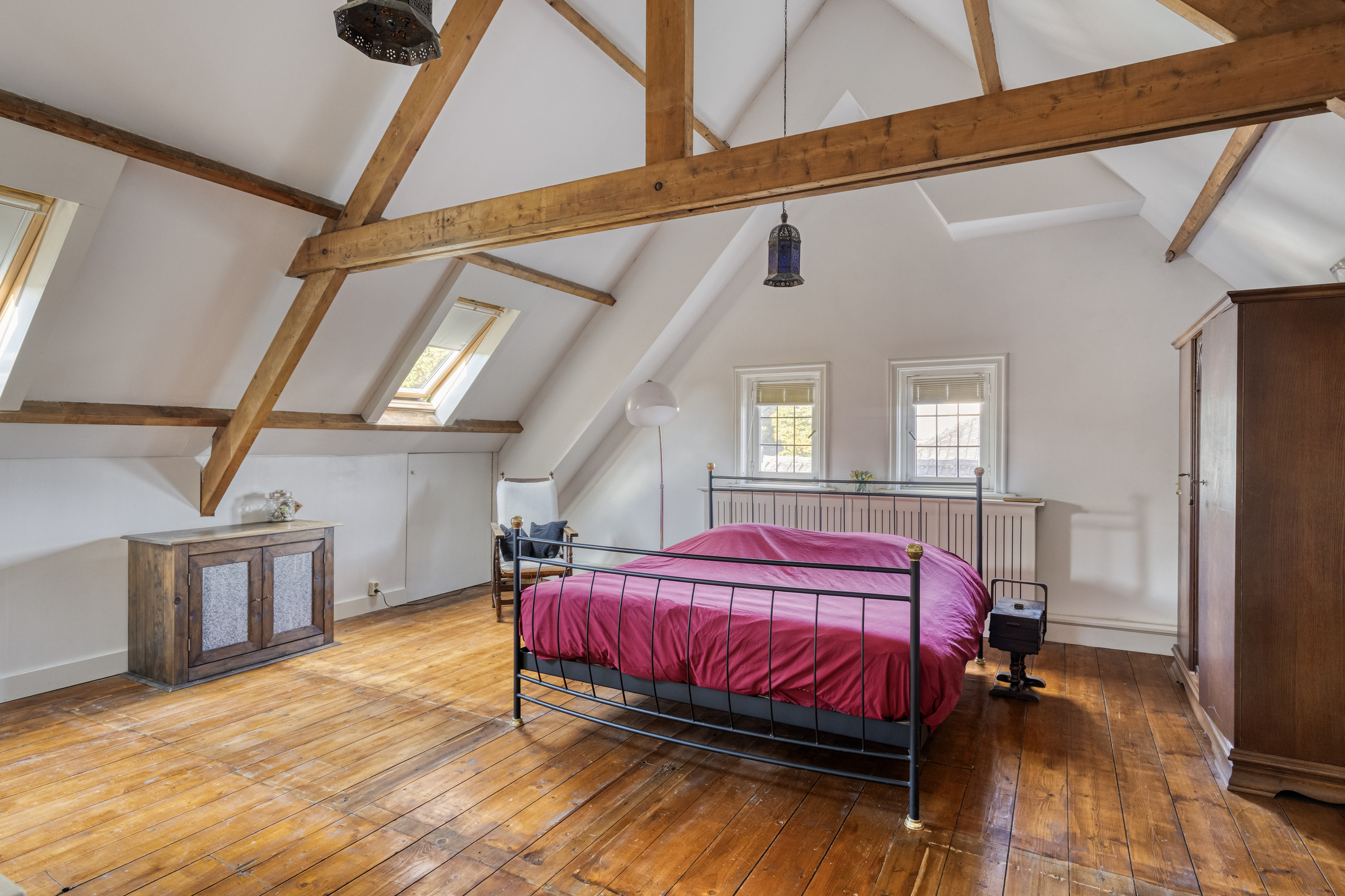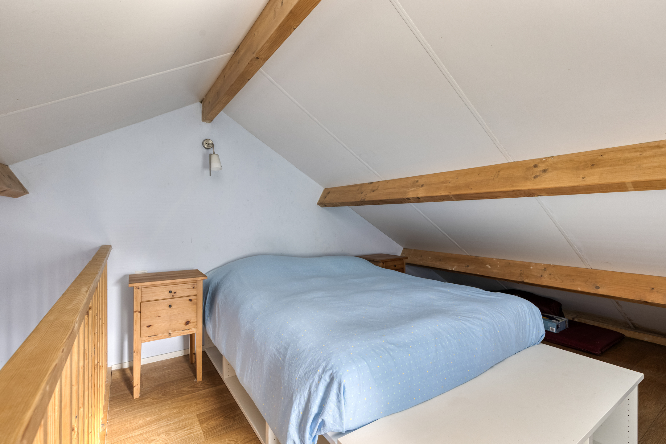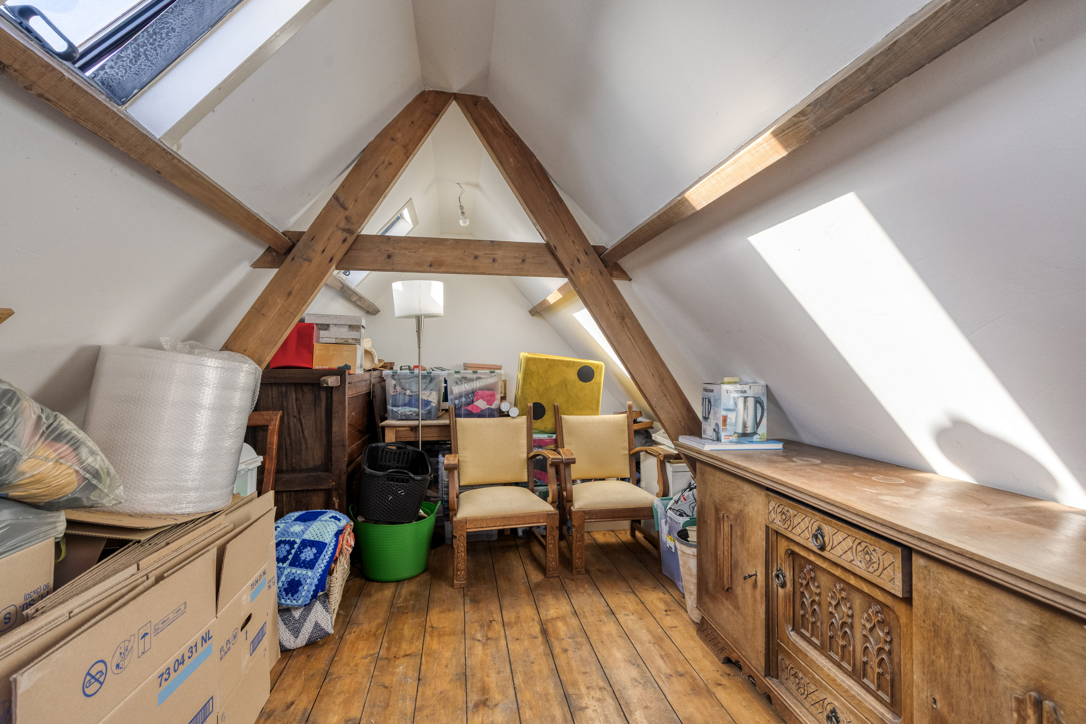 Via een vaste trap bereikt u de verrassend ruime tweede verdieping. De hoge nok en zichtbare balken geven deze zolderkamer een bijzonder karakter. Twee dakvensters zorgen voor veel lichtinval en er is volop bergruimte onder de knieschotten.