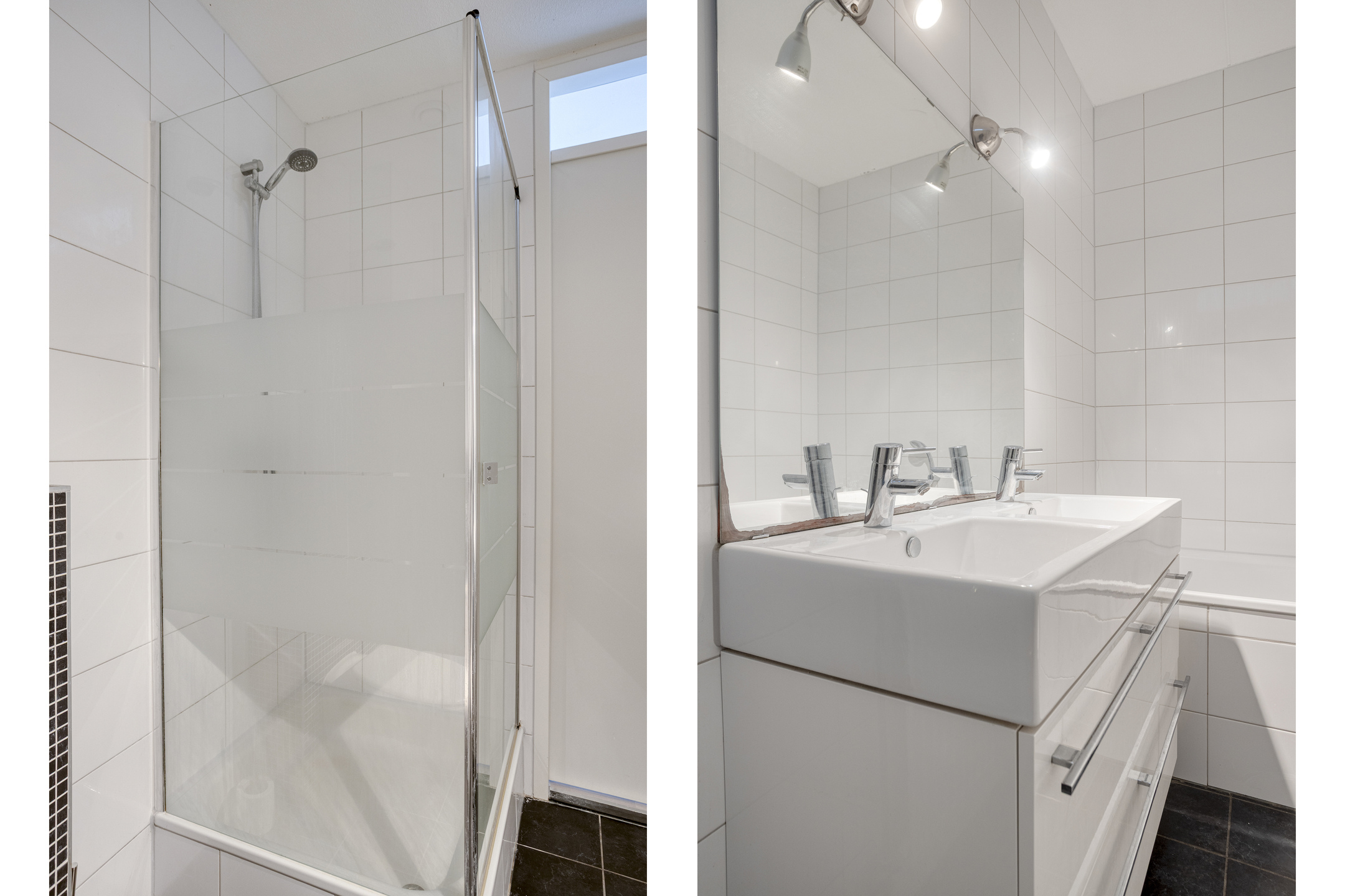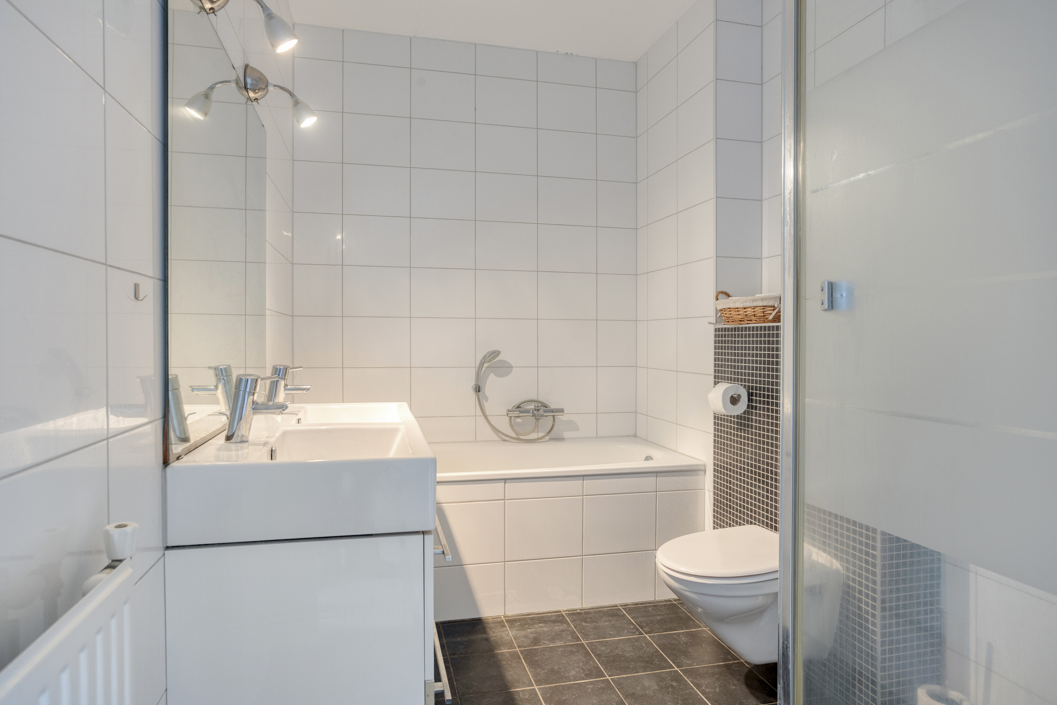 De badkamer is compleet uitgevoerd en biedt alles wat een gezin nodig heeft. U treft hier een douche, een ligbad, een toilet en een dubbele wastafel. De ruimte is praktisch ingedeeld en verzorgd afgewerkt.