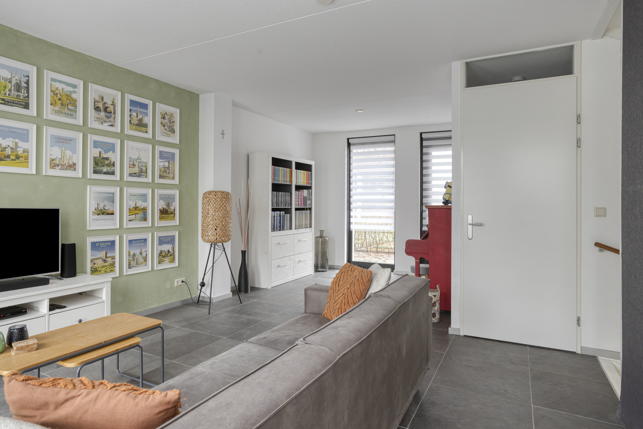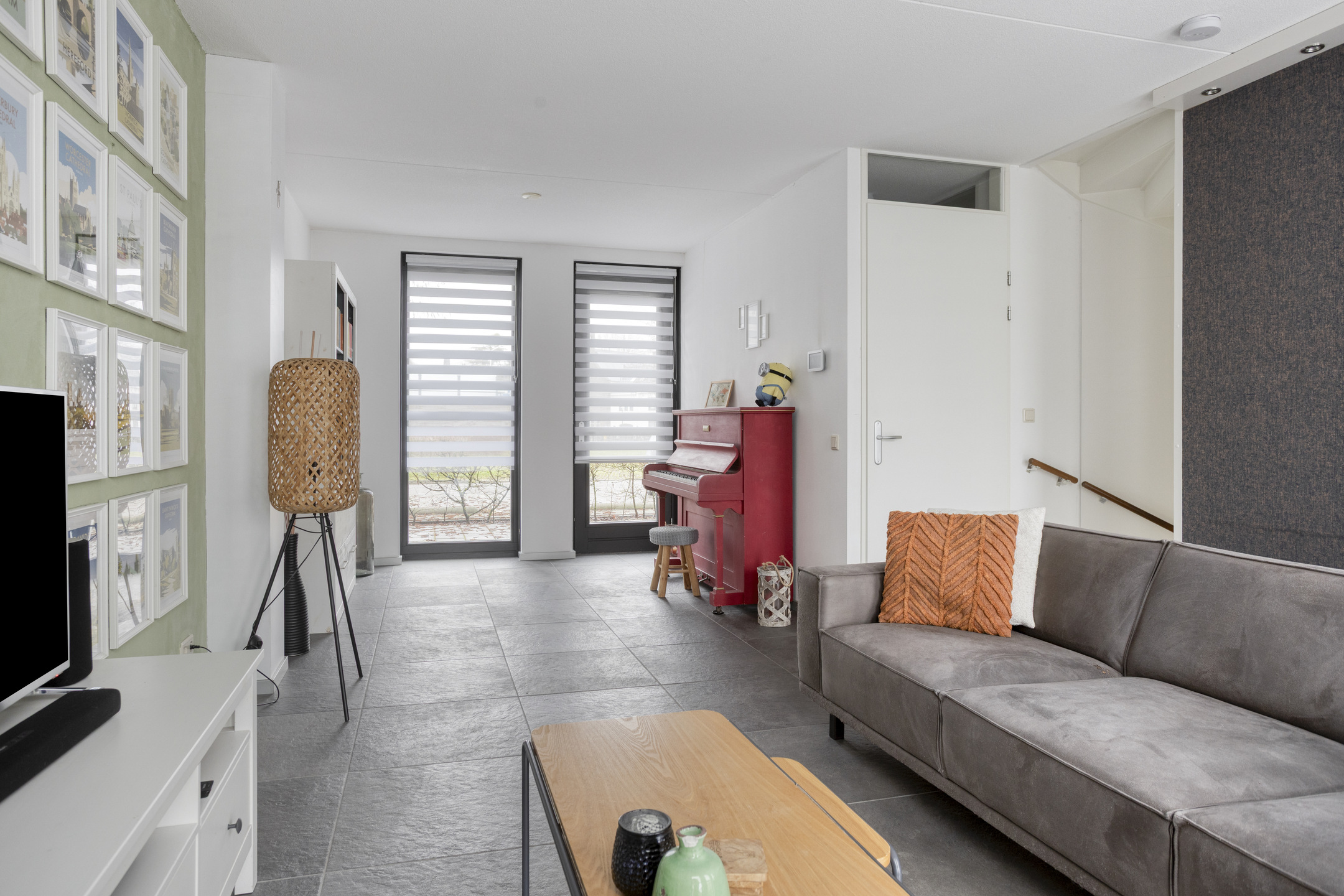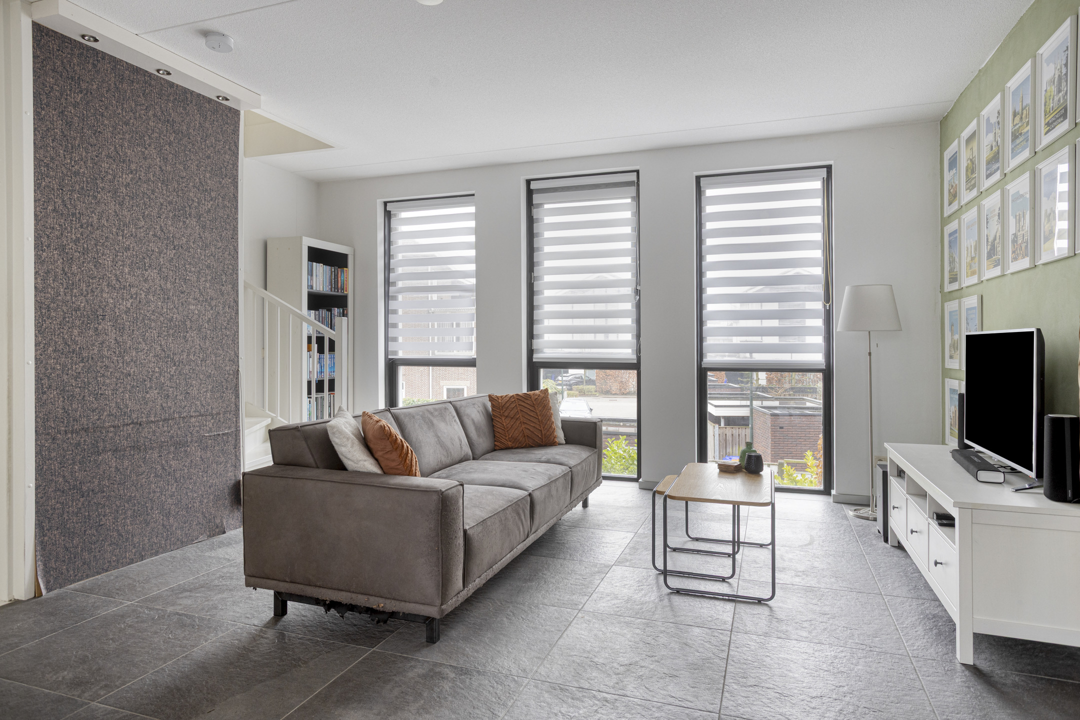 De woonkamer bevindt zich aan de straatzijde en profiteert van een prettige lichtinval dankzij de grote raampartijen. Door de ligging op dijkniveau heeft deze ruimte een open en vrij uitzicht. De vloerverwarming zorgt voor een aangenaam wooncomfort en een strakke afwerking zonder radiatoren in het zicht.