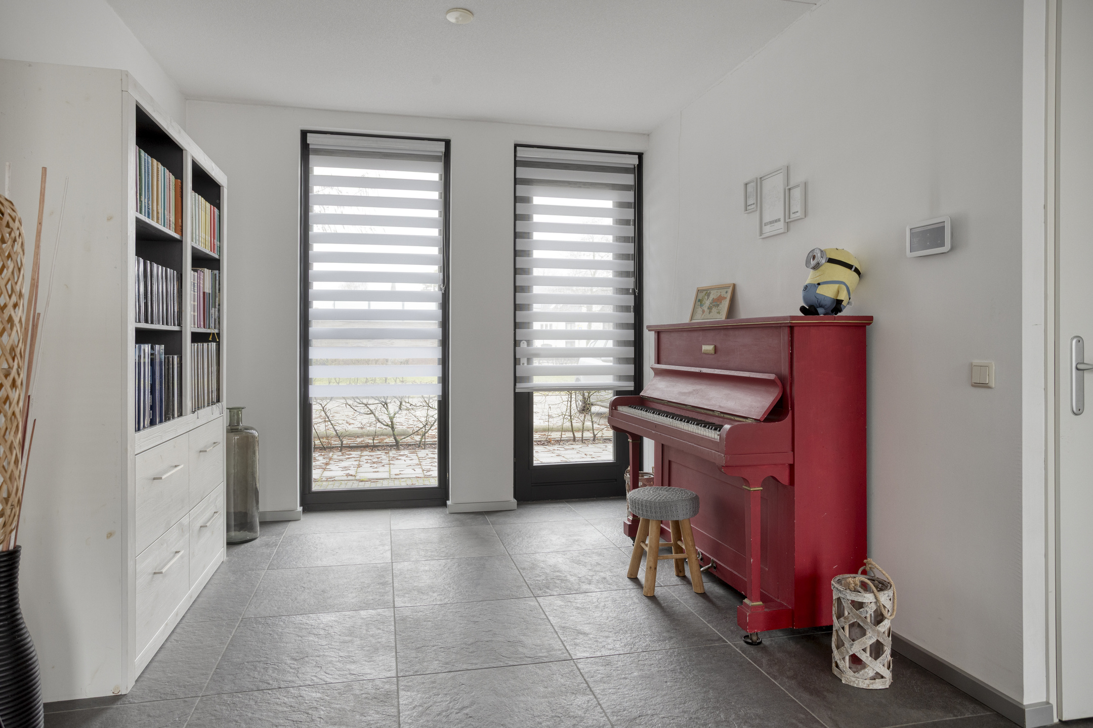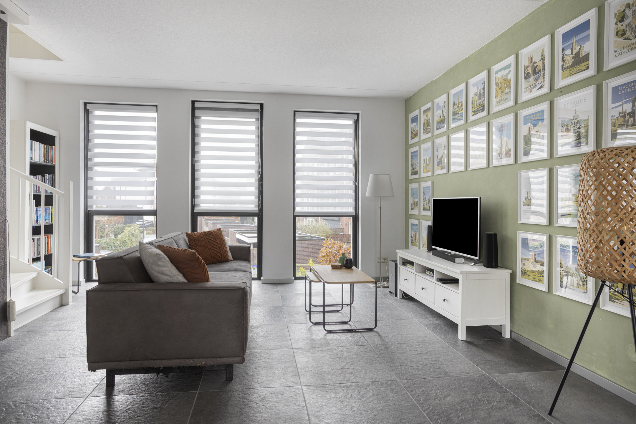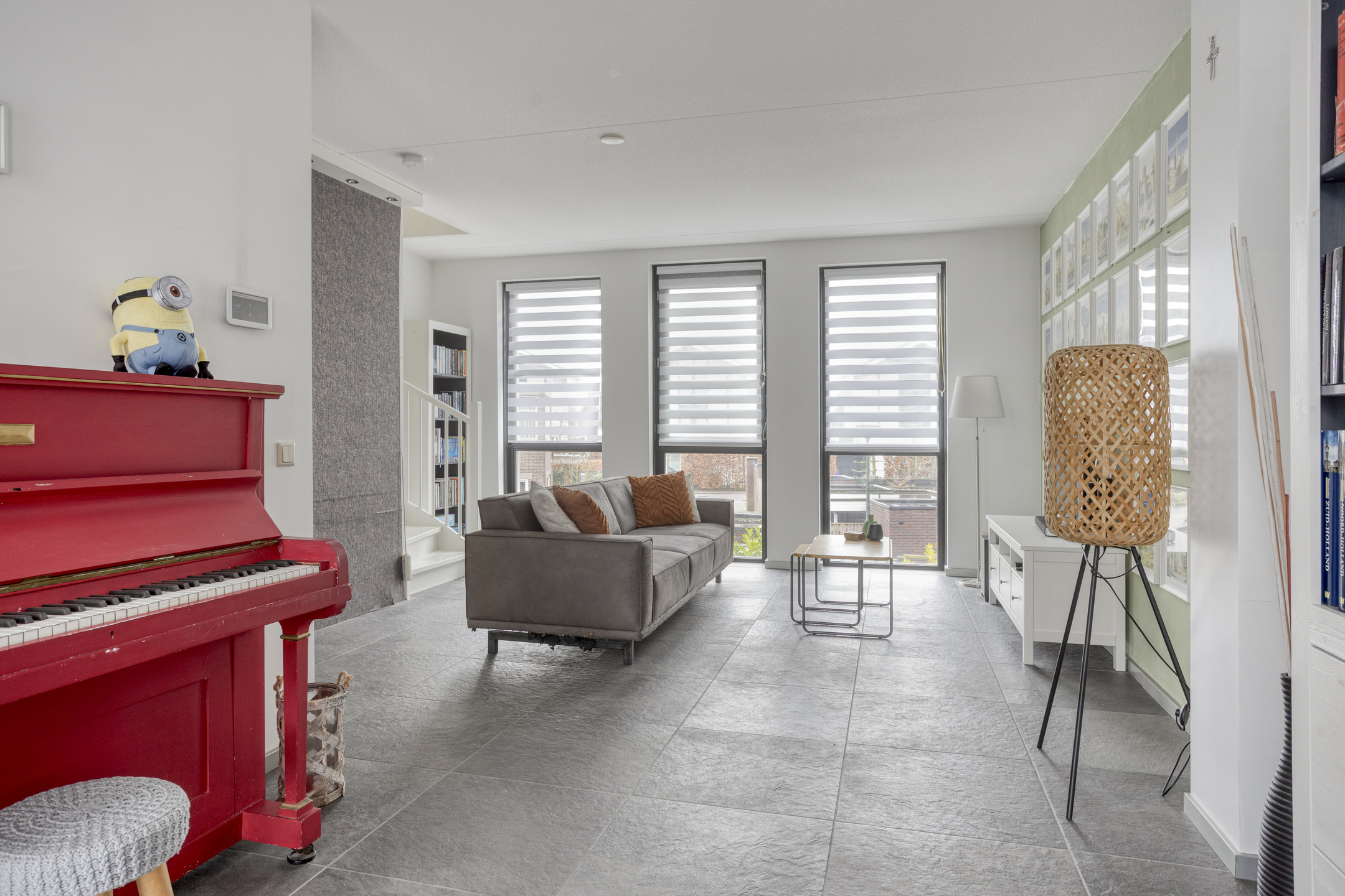 De woonkamer bevindt zich aan de straatzijde en profiteert van een prettige lichtinval dankzij de grote raampartijen. Door de ligging op dijkniveau heeft deze ruimte een open en vrij uitzicht. De vloerverwarming zorgt voor een aangenaam wooncomfort en een strakke afwerking zonder radiatoren in het zicht.