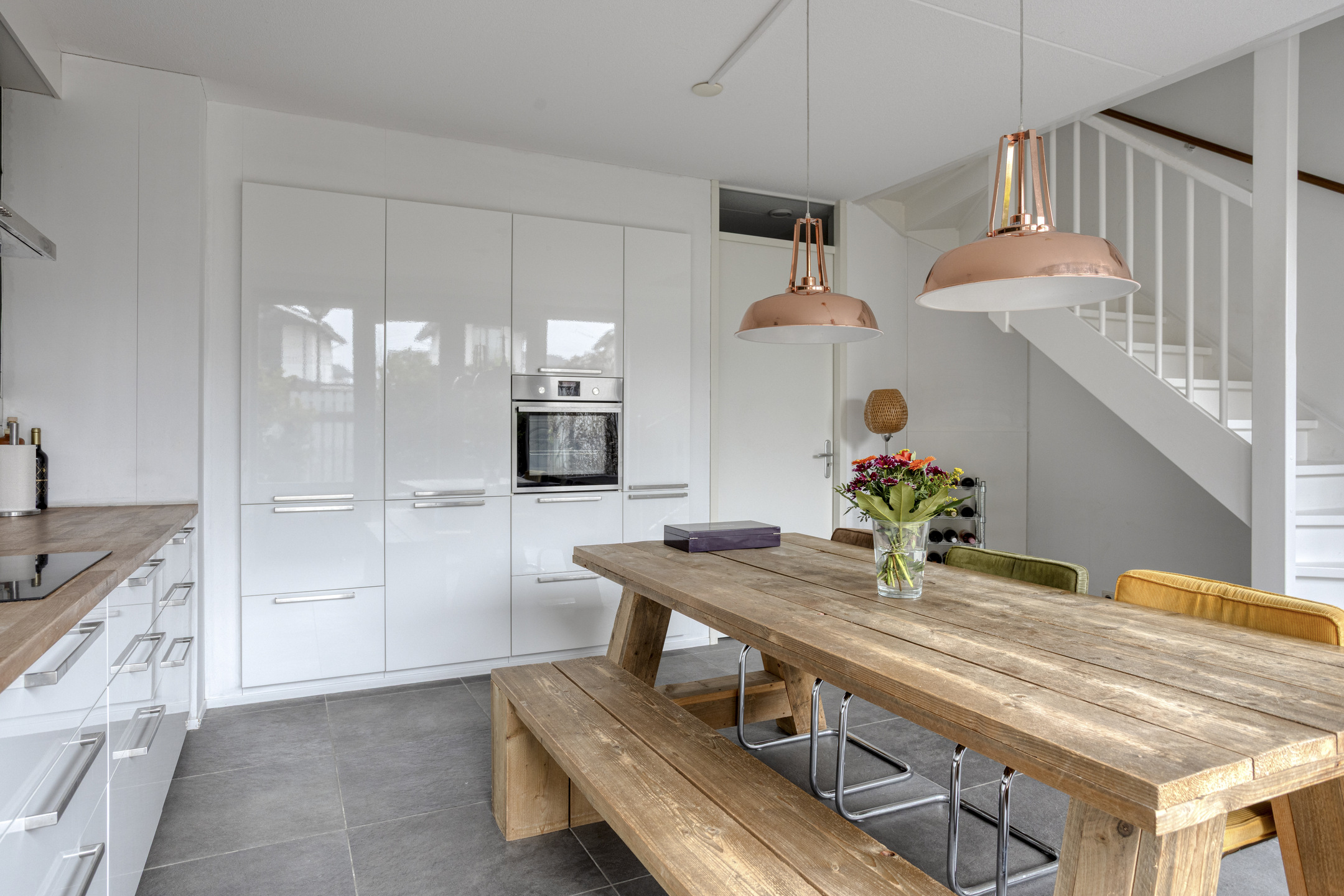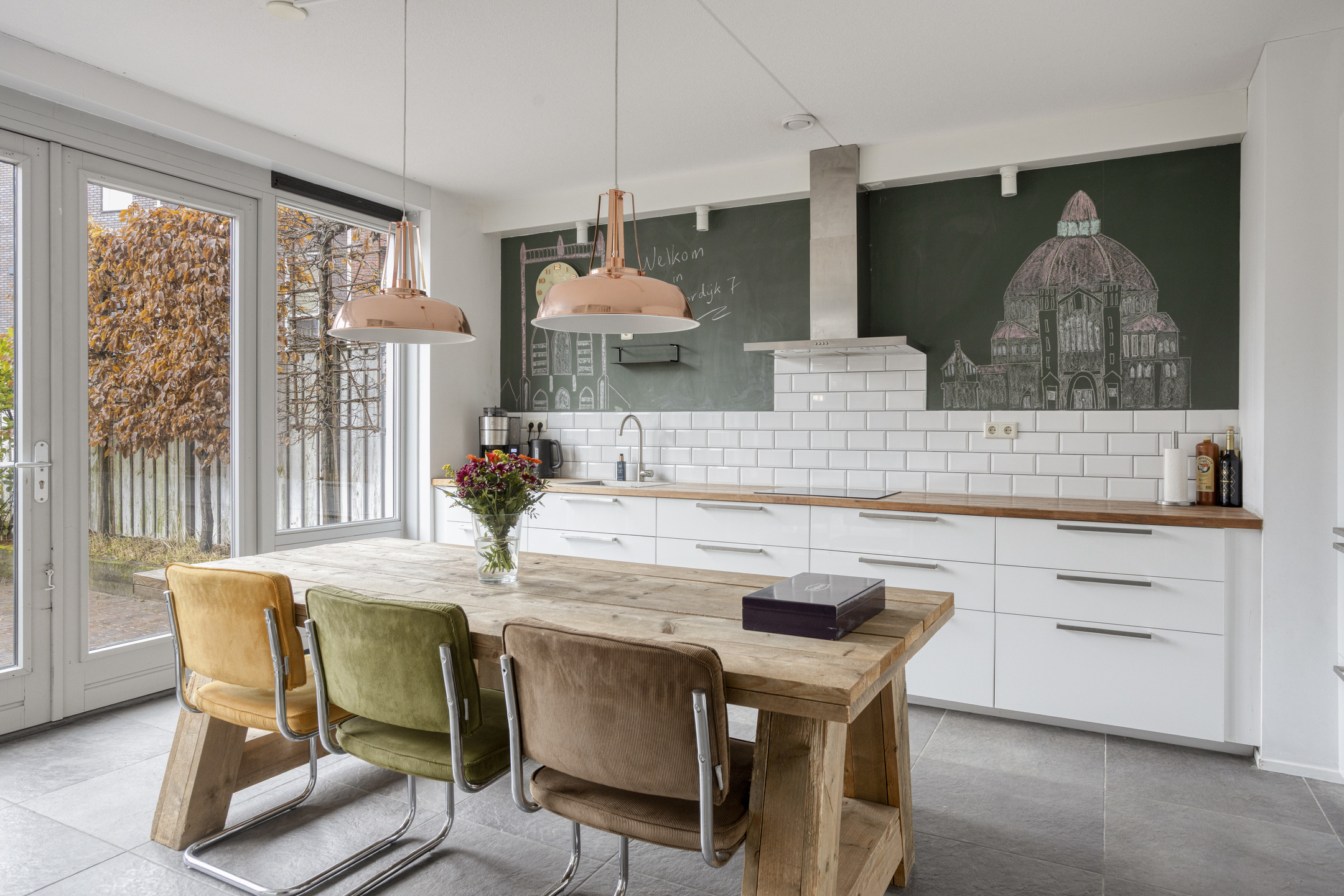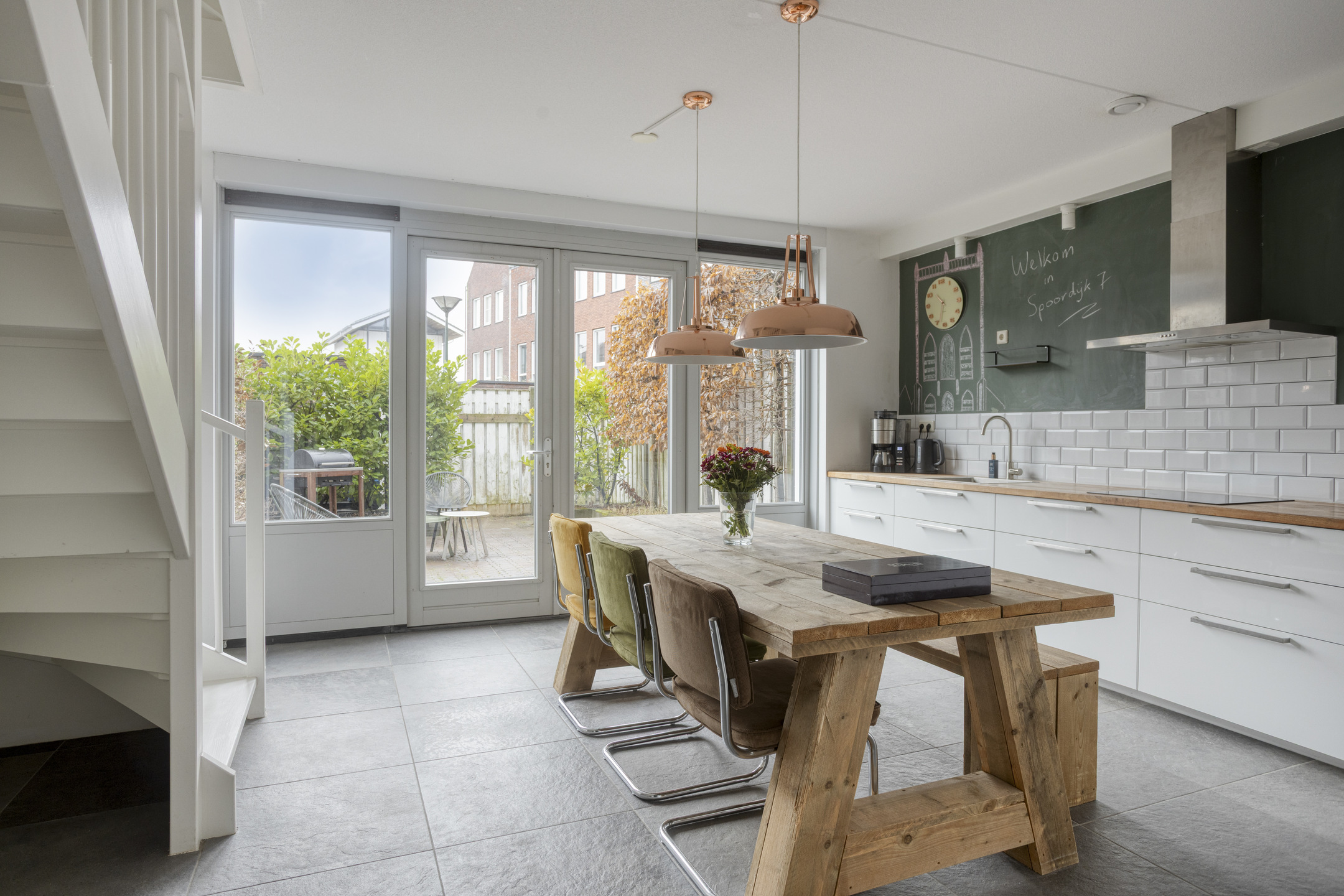 Een verdieping lager bevindt zich de woonkeuken. Deze ruimte staat in directe verbinding met de achtertuin, wat zorgt voor een natuurlijke overgang tussen binnen en buiten. Dit maakt het een heerlijke plek om te koken, tafelen en in de zomer de deuren open te zetten naar de tuin.
