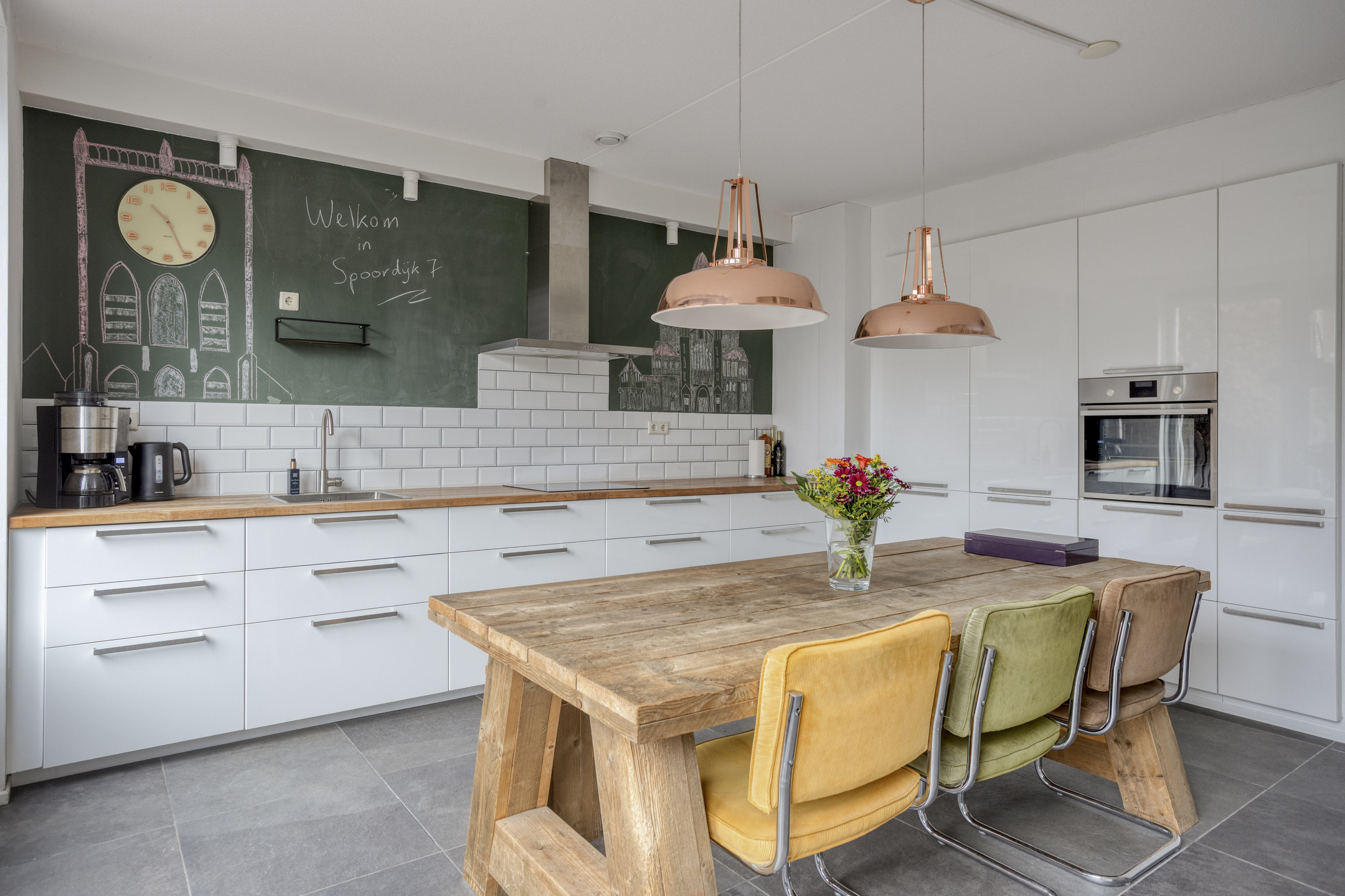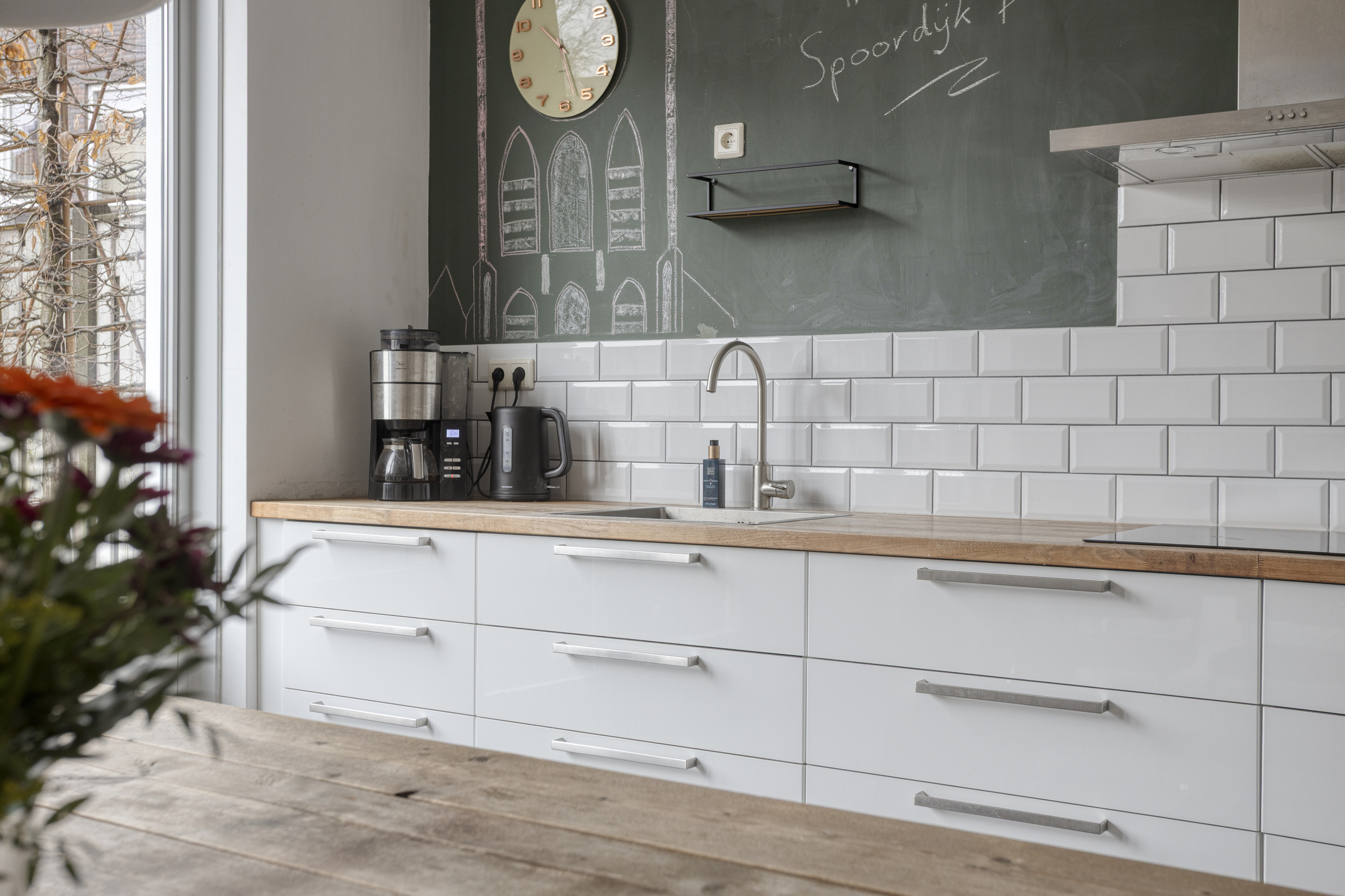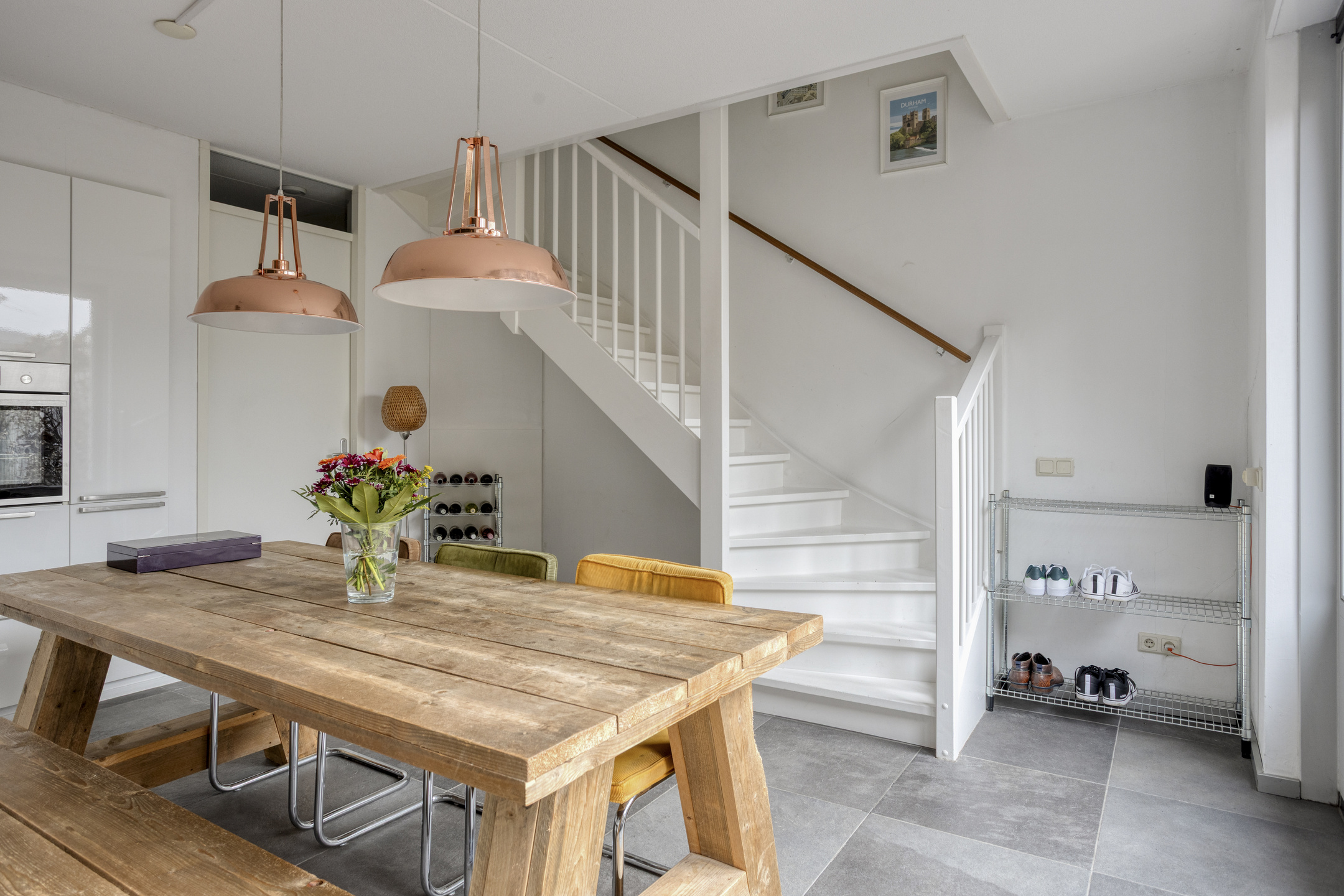 Een verdieping lager bevindt zich de woonkeuken. Deze ruimte staat in directe verbinding met de achtertuin, wat zorgt voor een natuurlijke overgang tussen binnen en buiten. Dit maakt het een heerlijke plek om te koken, tafelen en in de zomer de deuren open te zetten naar de tuin.