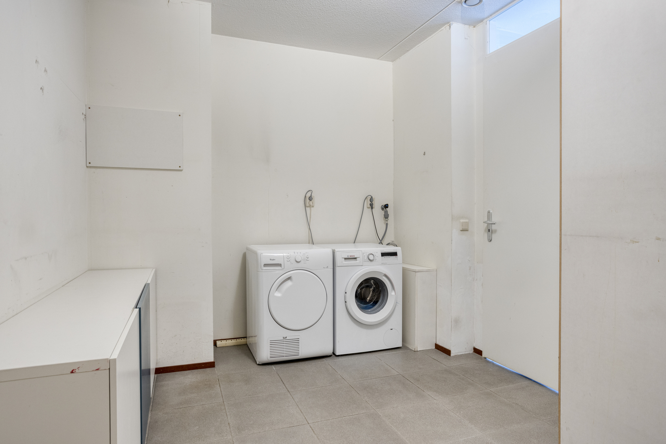 Aangrenzend bevindt zich de bijkeuken. Hier vindt u een vaste opbergkast en de aansluitingen voor wasmachine en droger.