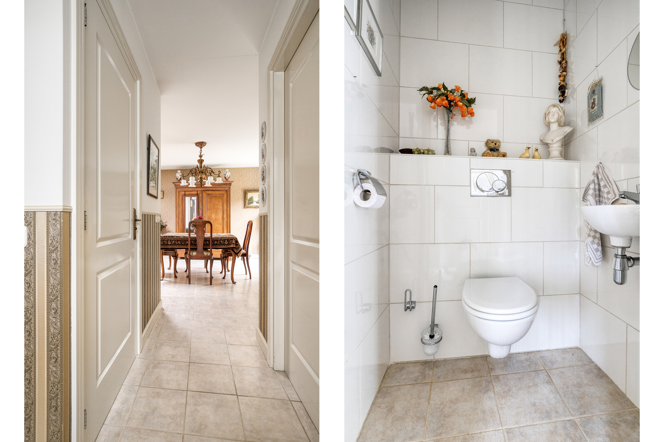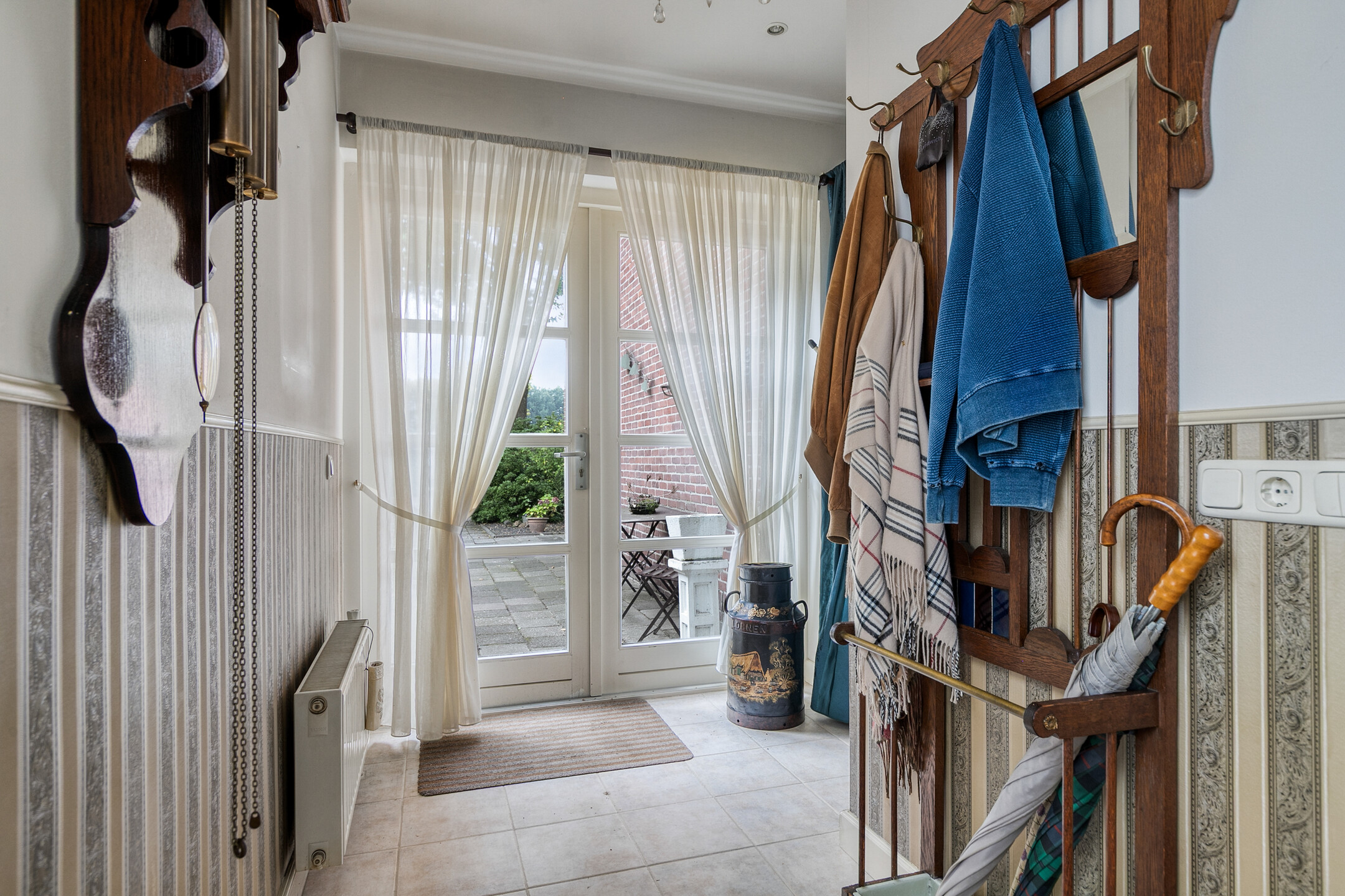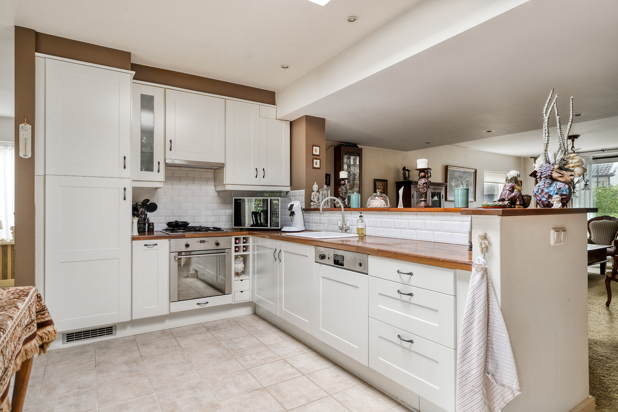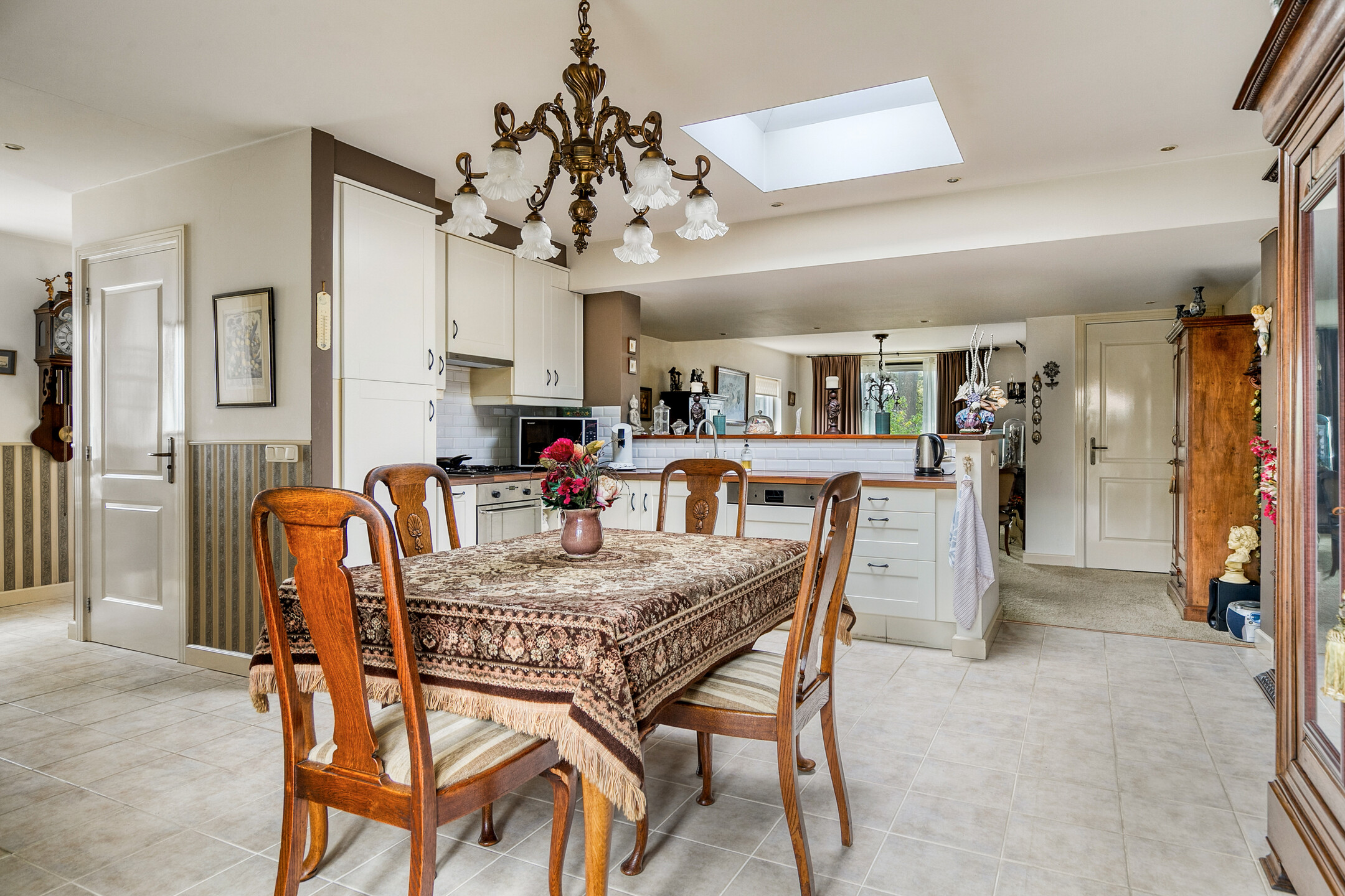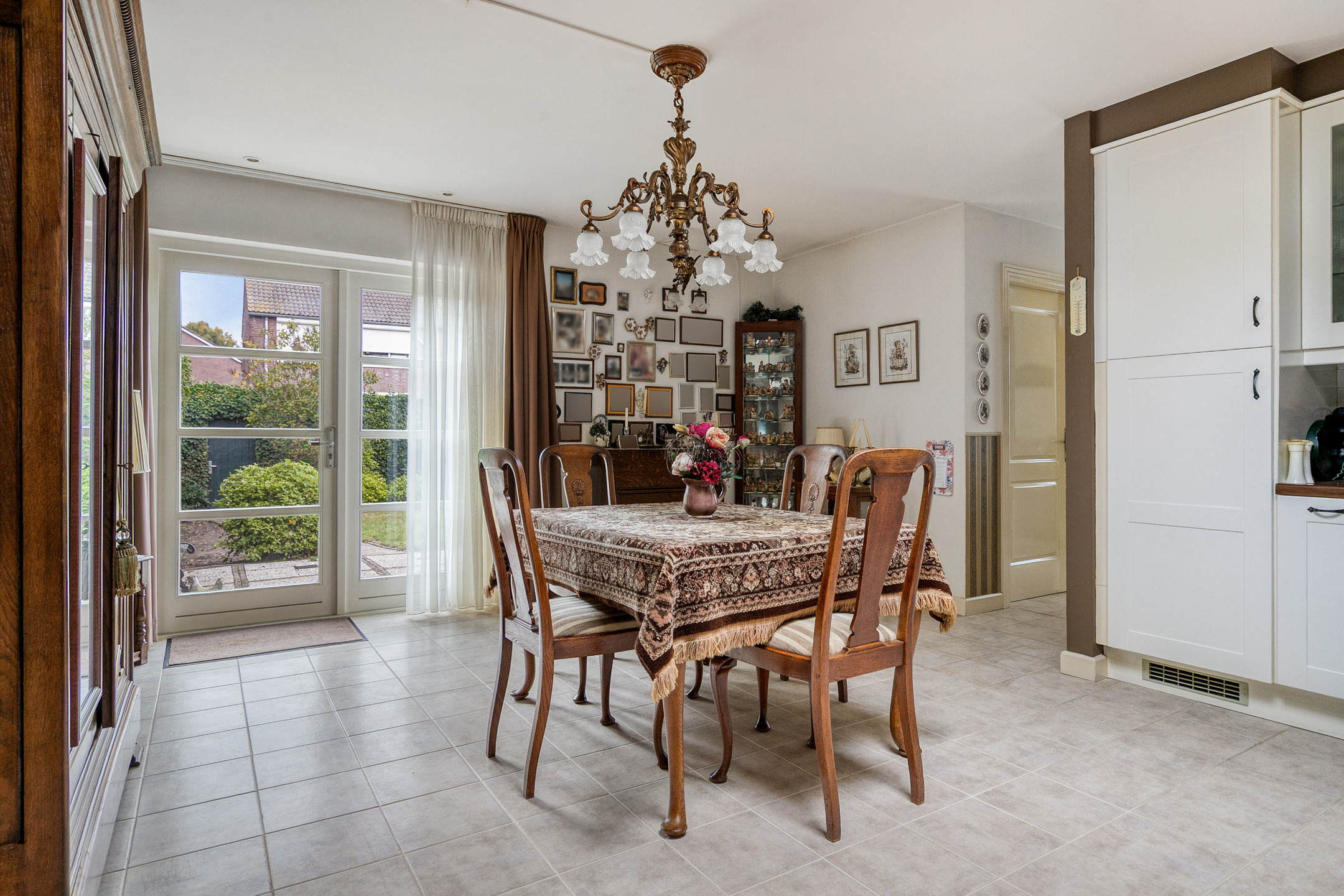 Aansluitend vindt u de halfopen keuken met een gezellig eetgedeelte. De keuken is uitgerust met een 4-pits gasfornuis, vaatwasser, oven en koelkast. Achter de keuken bevindt zich een praktische tussenhal met toegang tot het toilet, de bijkeuken en de tweede entree. Hier zijn ook de aansluitingen voor wasmachine en droger aanwezig. Via de openslaande deuren heeft u directe toegang tot de tuin.