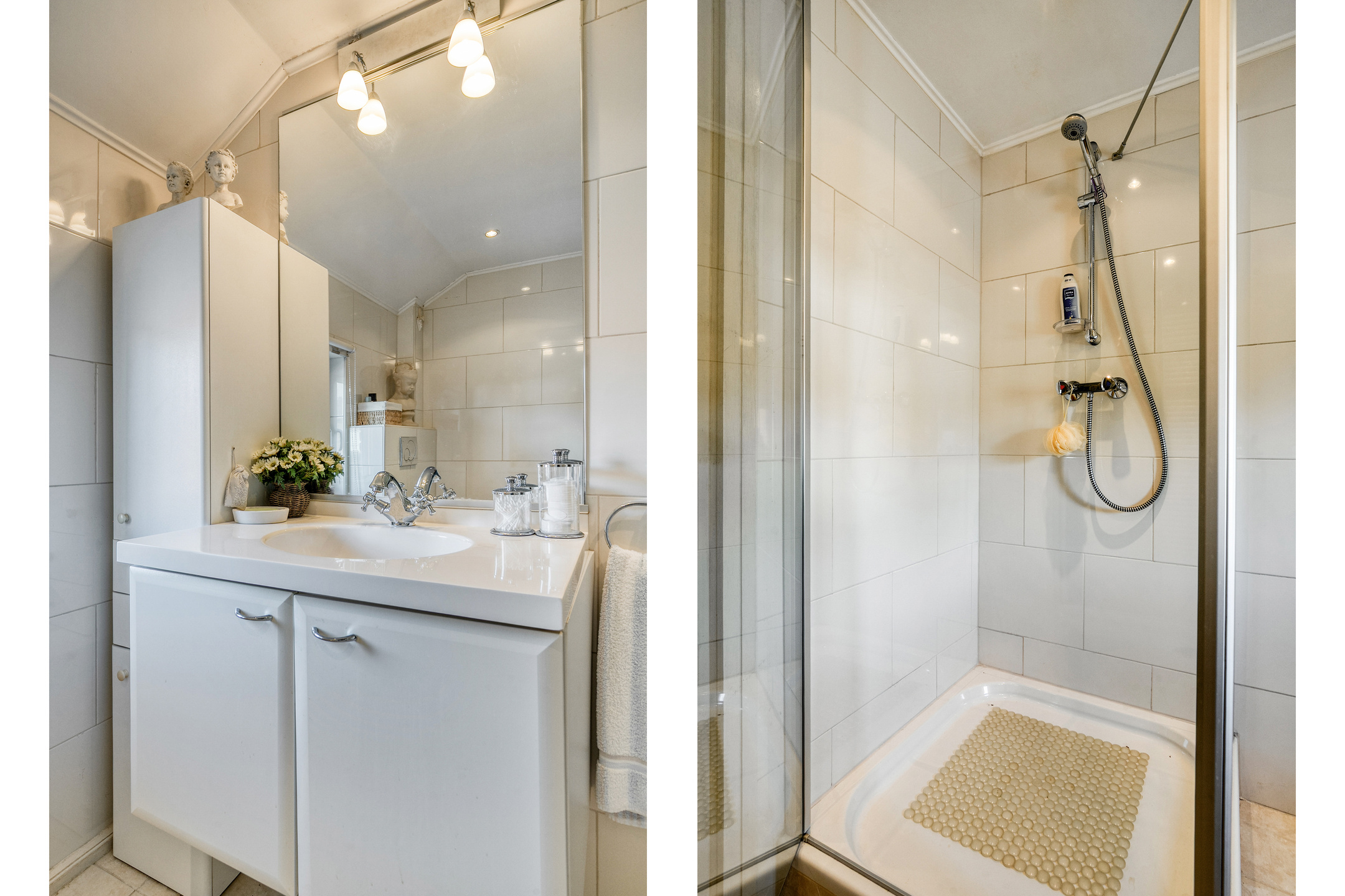 De badkamer is netjes uitgevoerd en beschikt over een douche, wastafelmeubel met wastafel en een toilet.