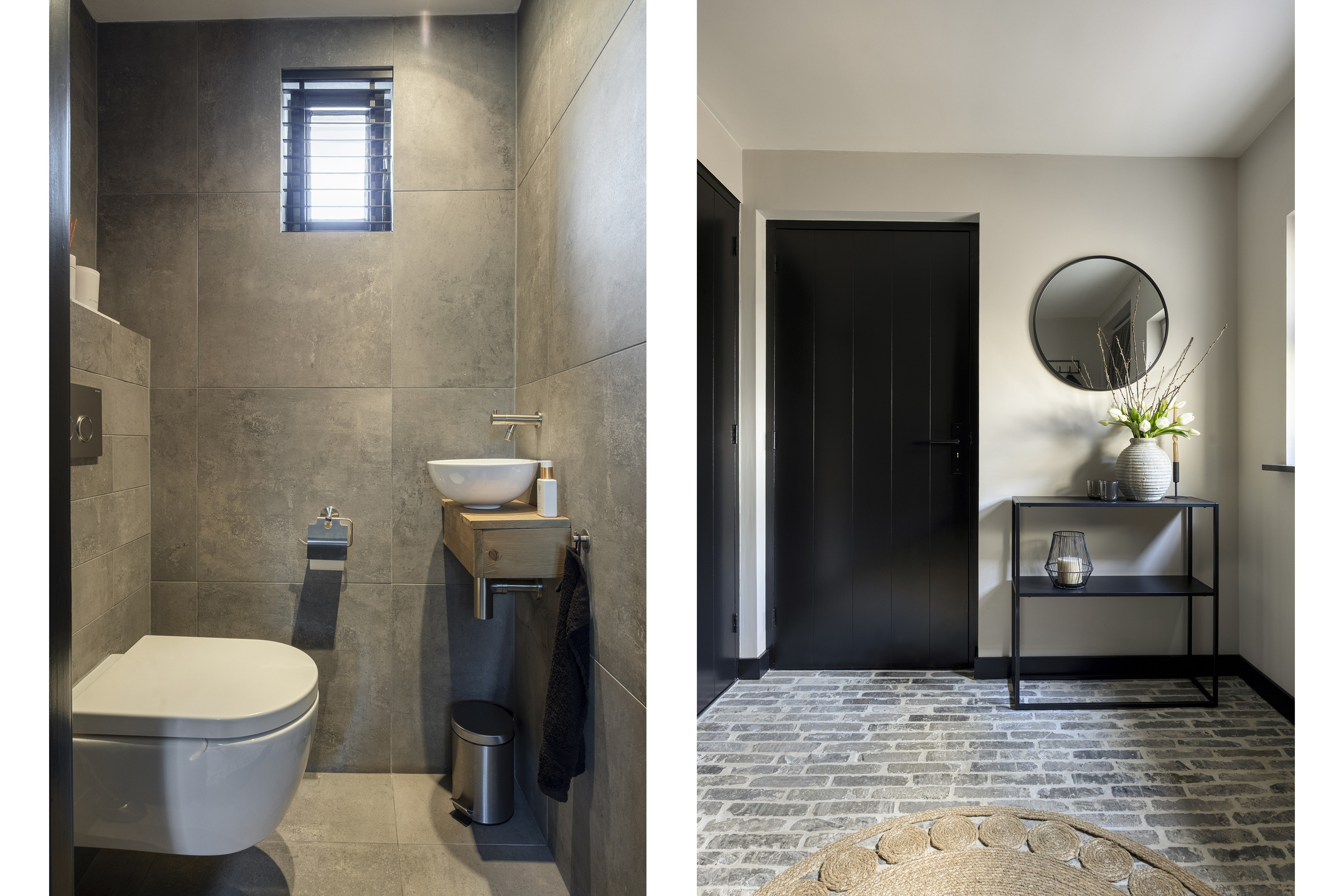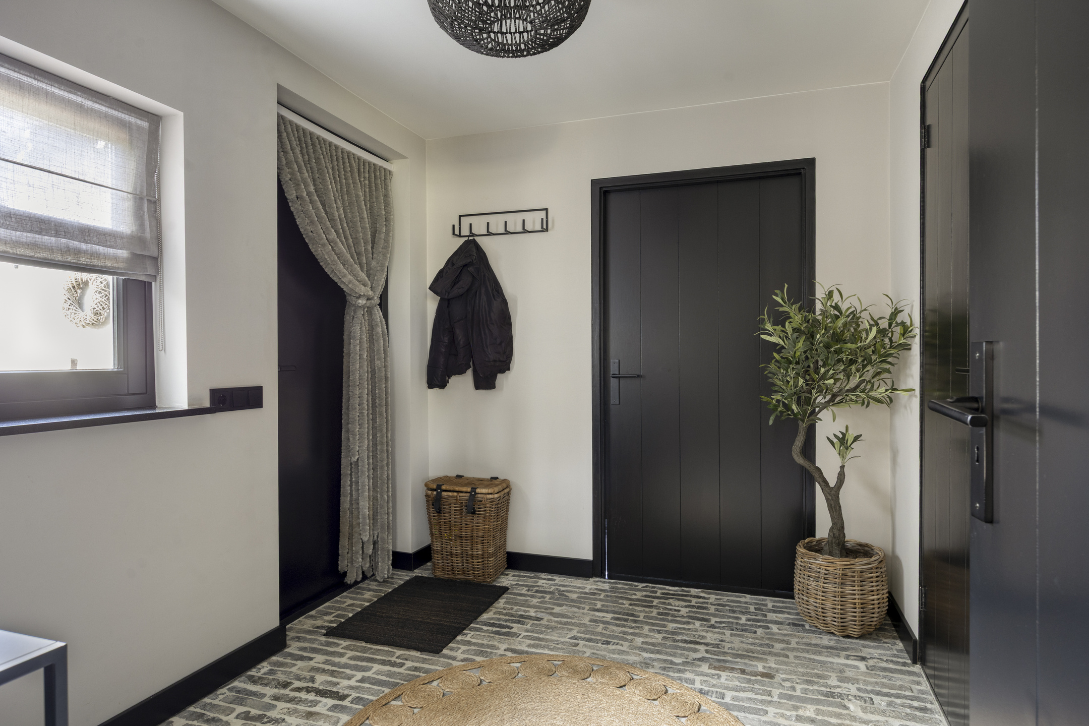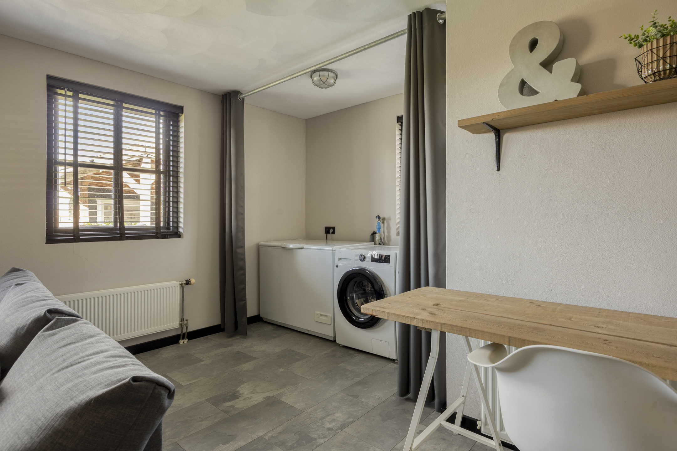 Aan de achterzijde van de woning bevindt zich een tweede hal met eigen entree, voorzien van een toiletruimte met fontein, de opstelplaats van de Remeha cv-ketel (2024) en aansluitingen voor de wasmachine.