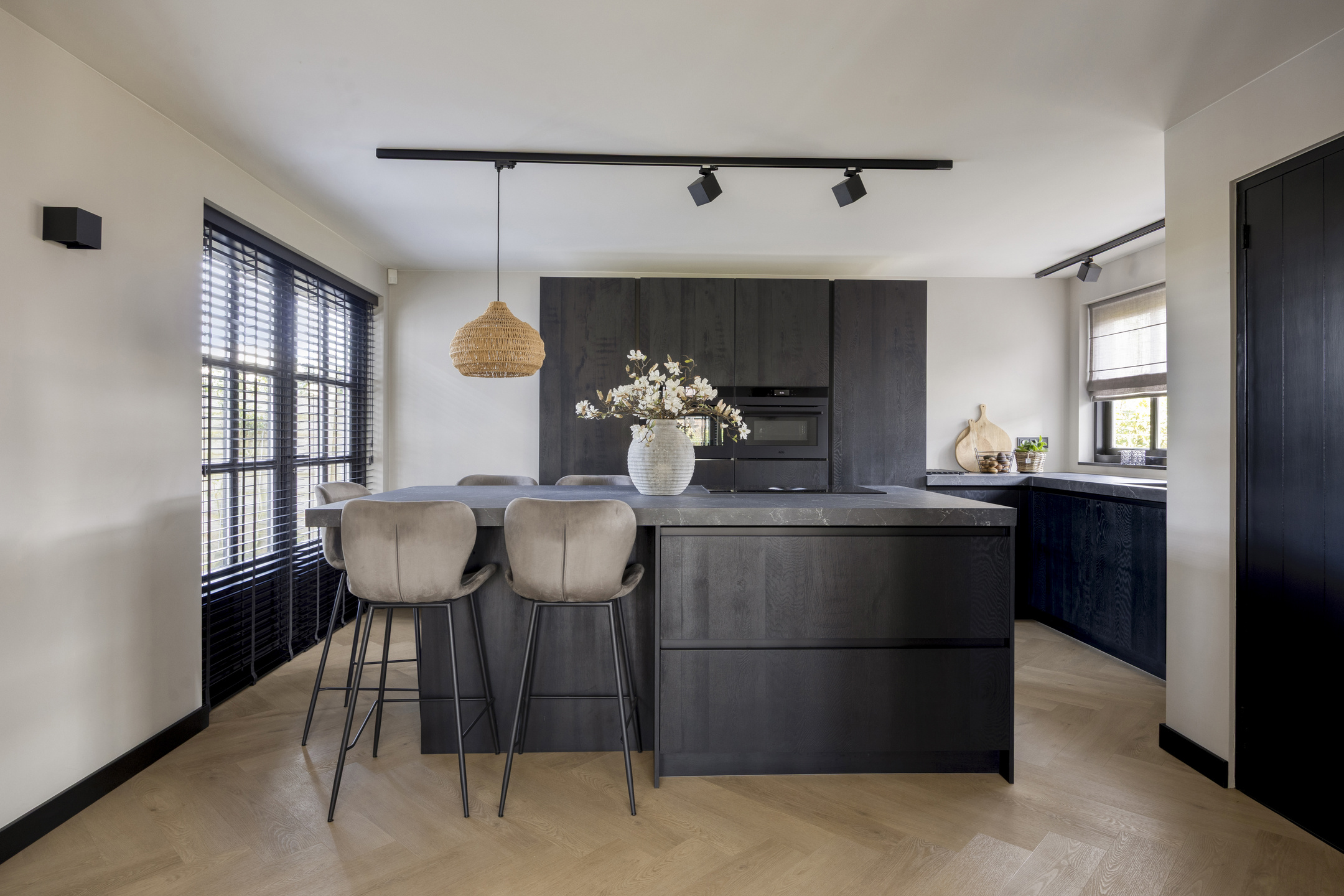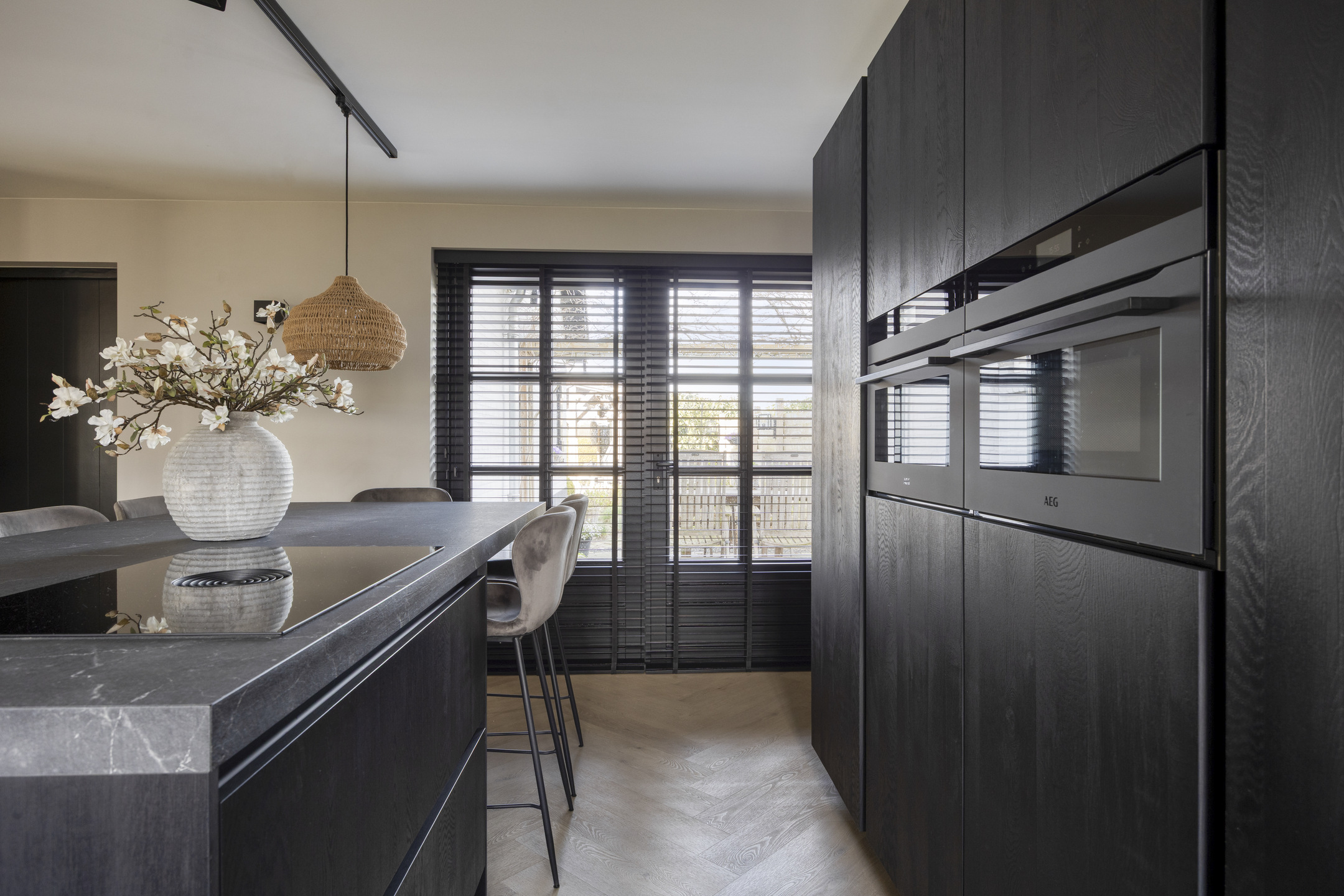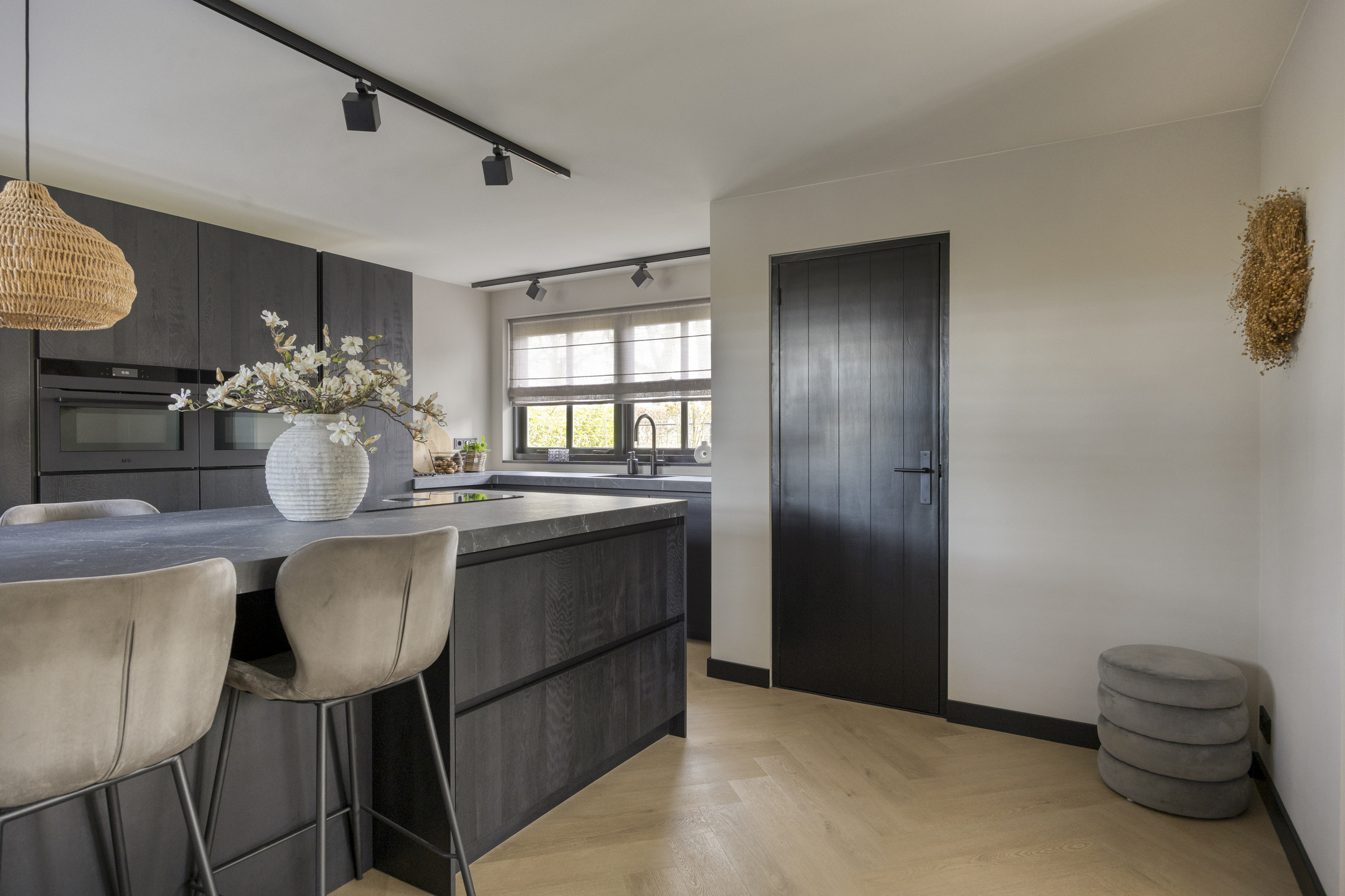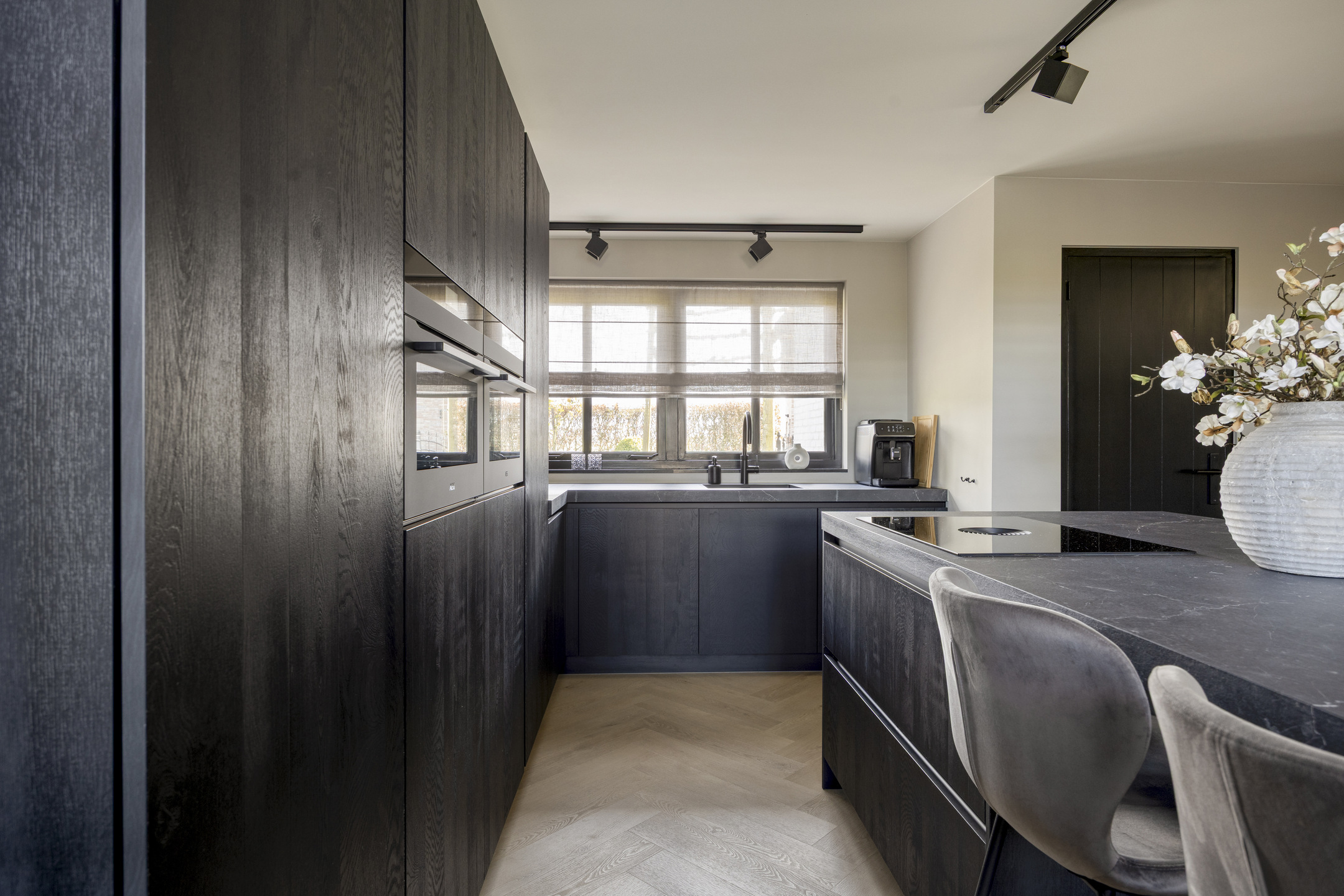 De moderne keuken is van alle gemakken voorzien, waaronder een koelkast, twee combi-ovens, een Bora kookplaat, Quooker en vaatwasser. Vanuit de keuken geven openslaande deuren toegang tot de tuin. Daarnaast is er een praktische kelderkast aanwezig voor extra bergruimte.