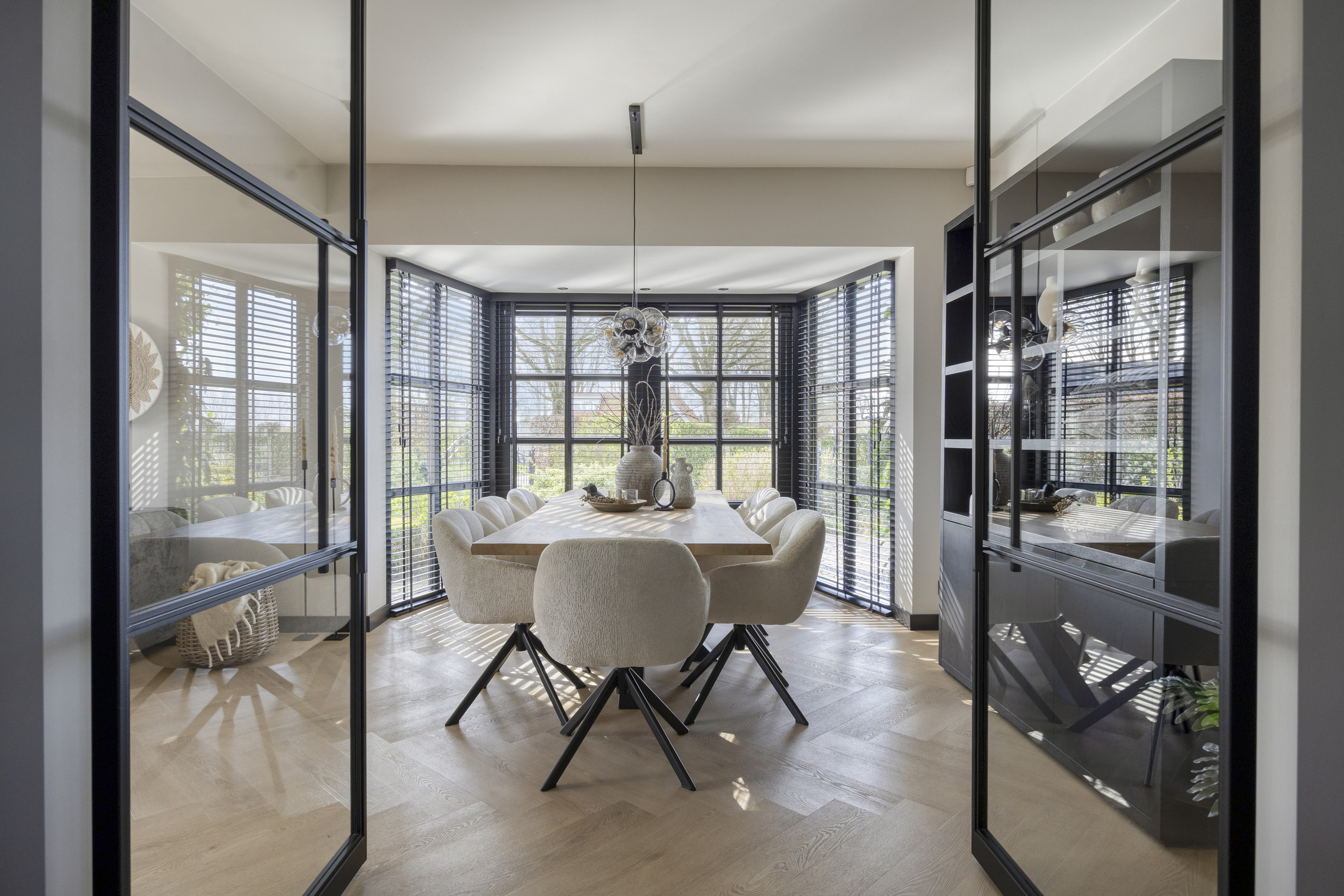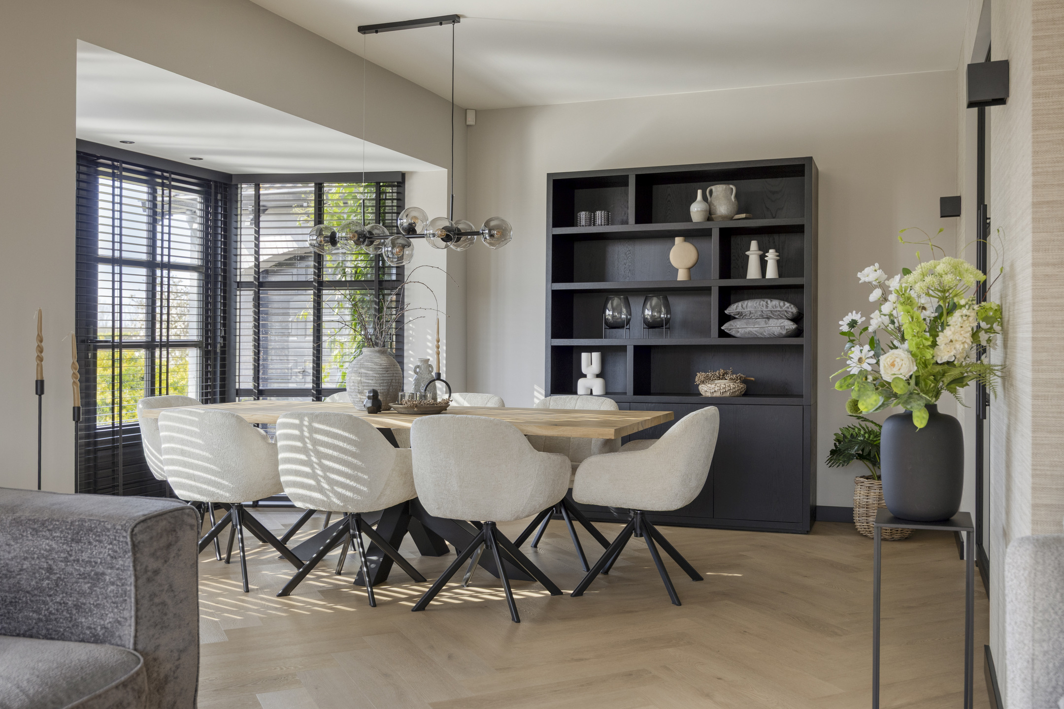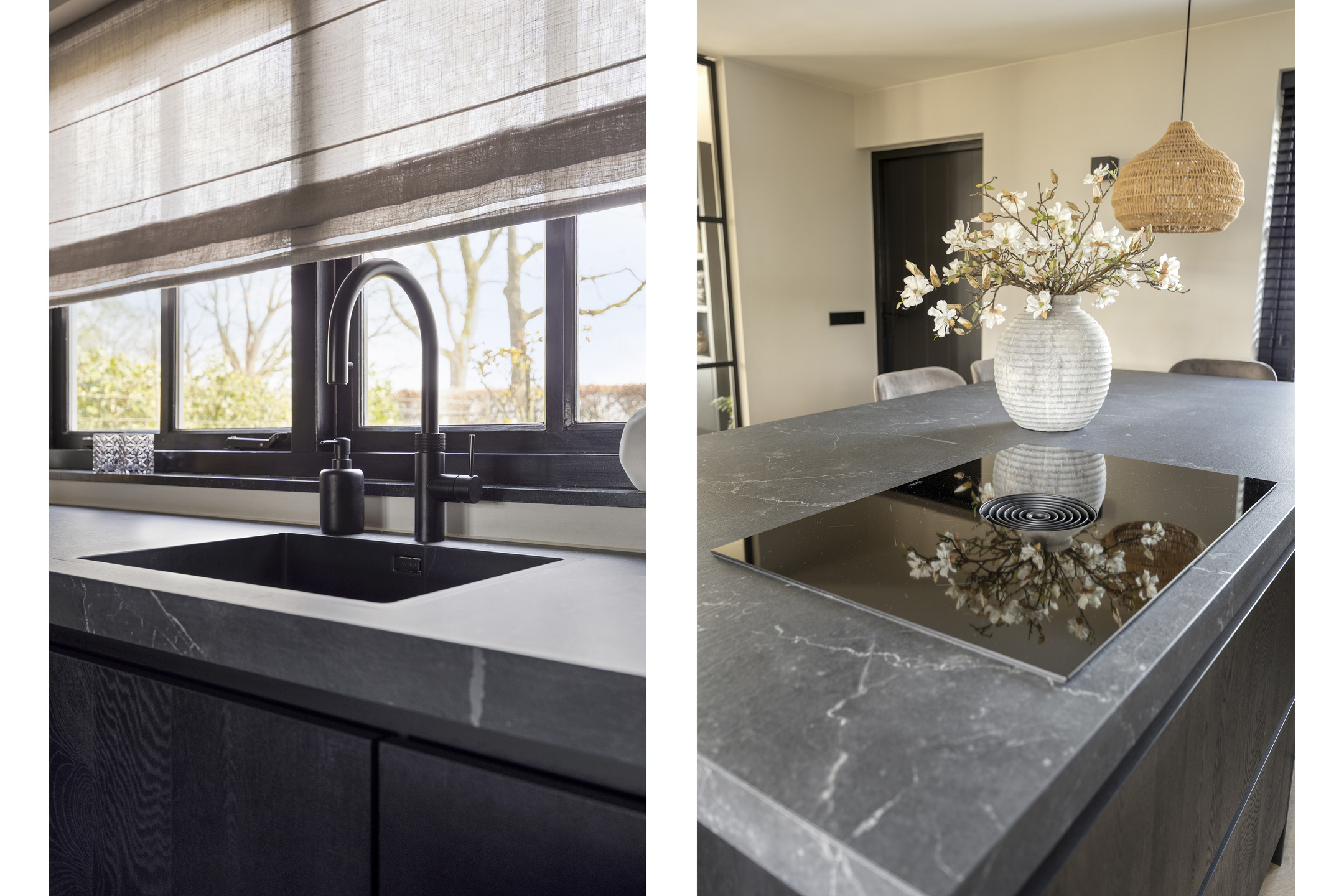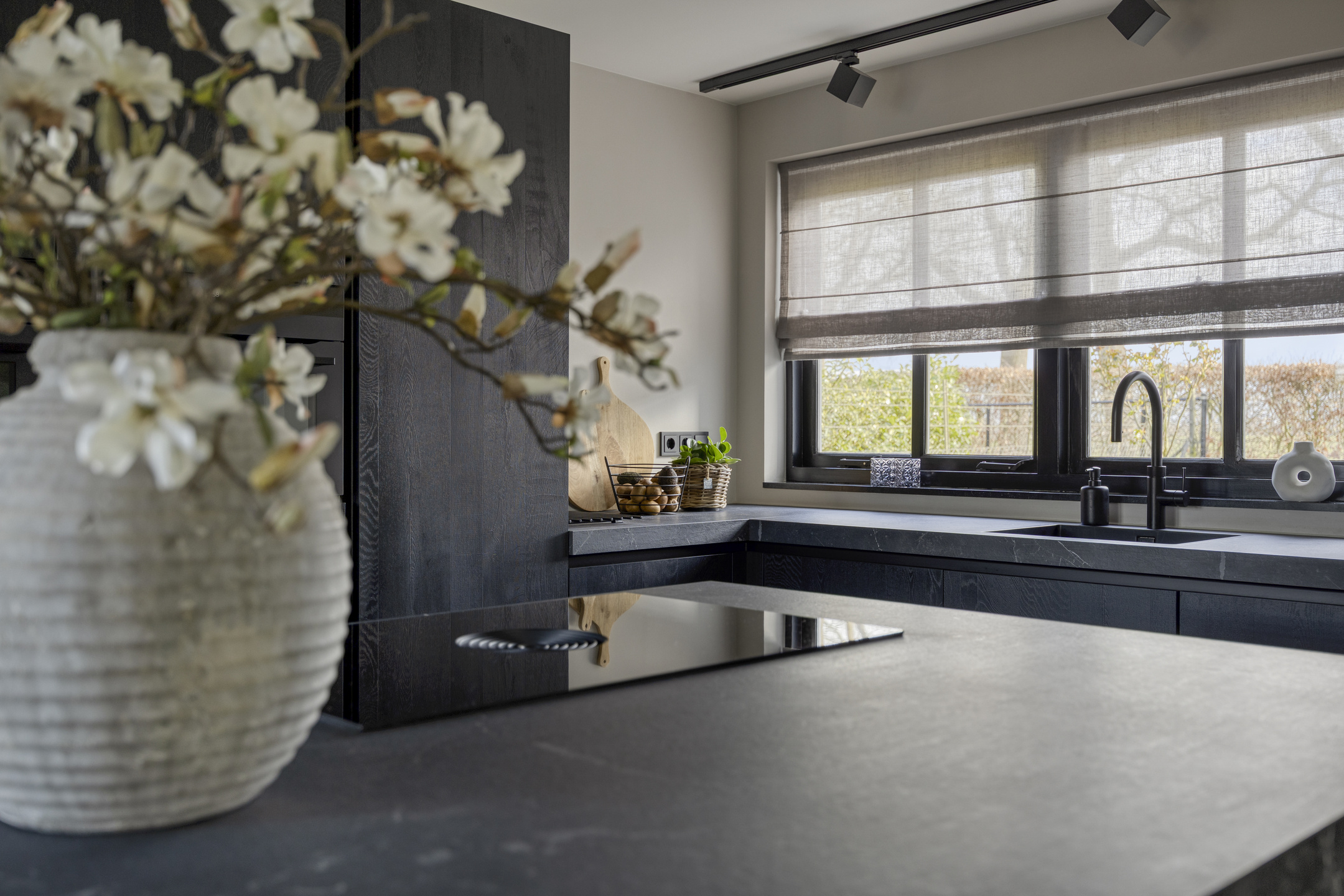 De moderne keuken is van alle gemakken voorzien, waaronder een koelkast, twee combi-ovens, een Bora kookplaat, Quooker en vaatwasser. Vanuit de keuken geven openslaande deuren toegang tot de tuin. Daarnaast is er een praktische kelderkast aanwezig voor extra bergruimte.