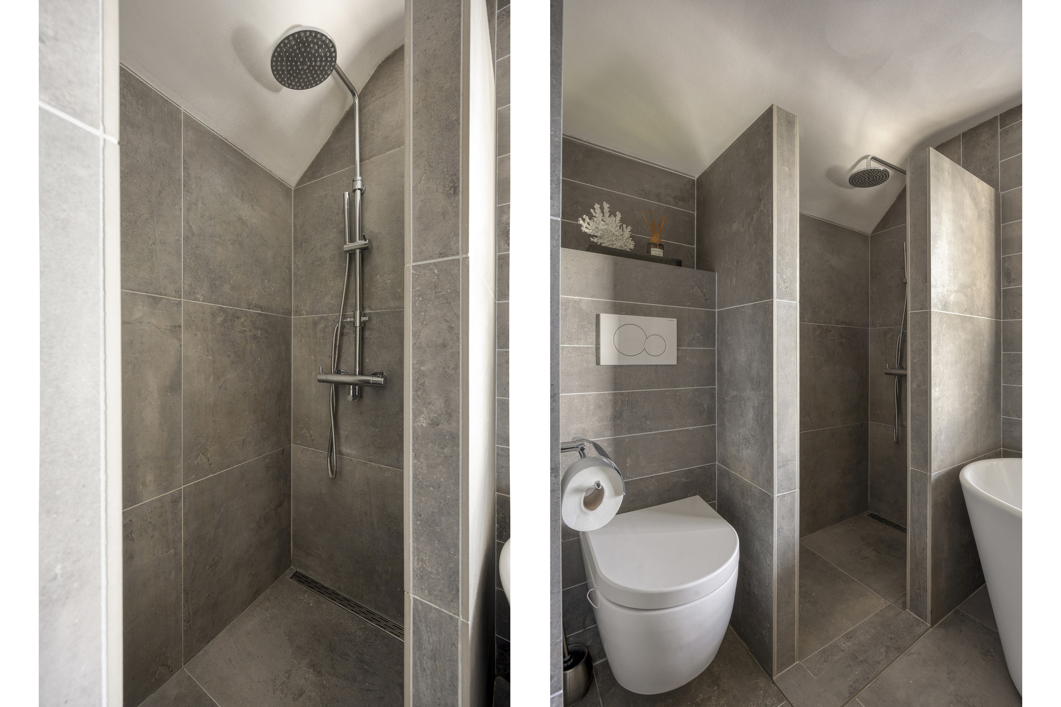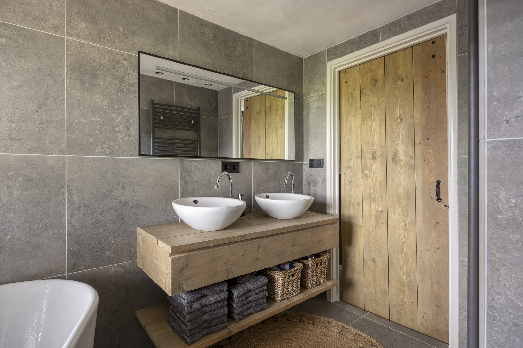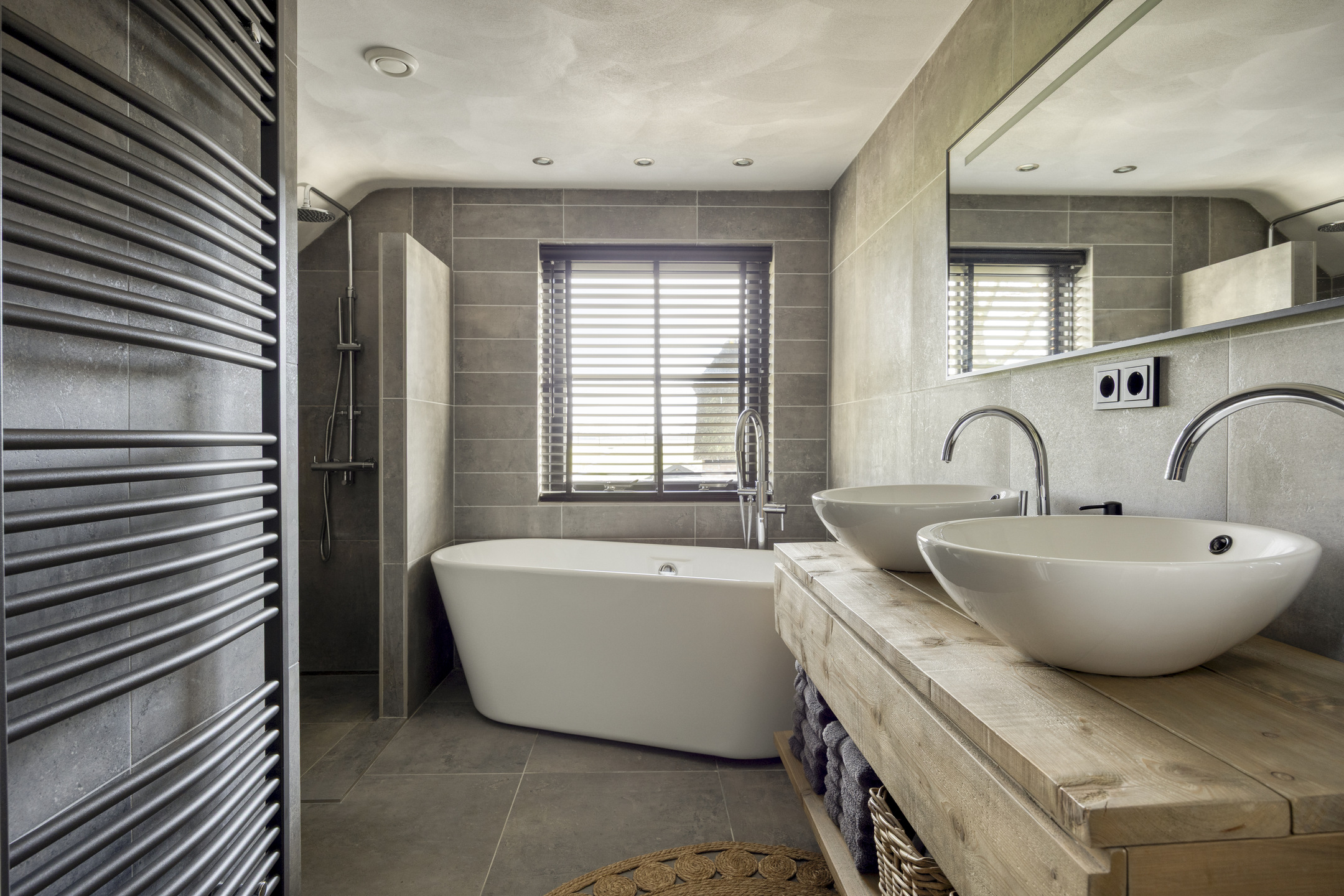 De badkamer is compleet en modern ingericht met een inloopdouche, ligbad, dubbele wastafel, toilet en mechanische ventilatie.