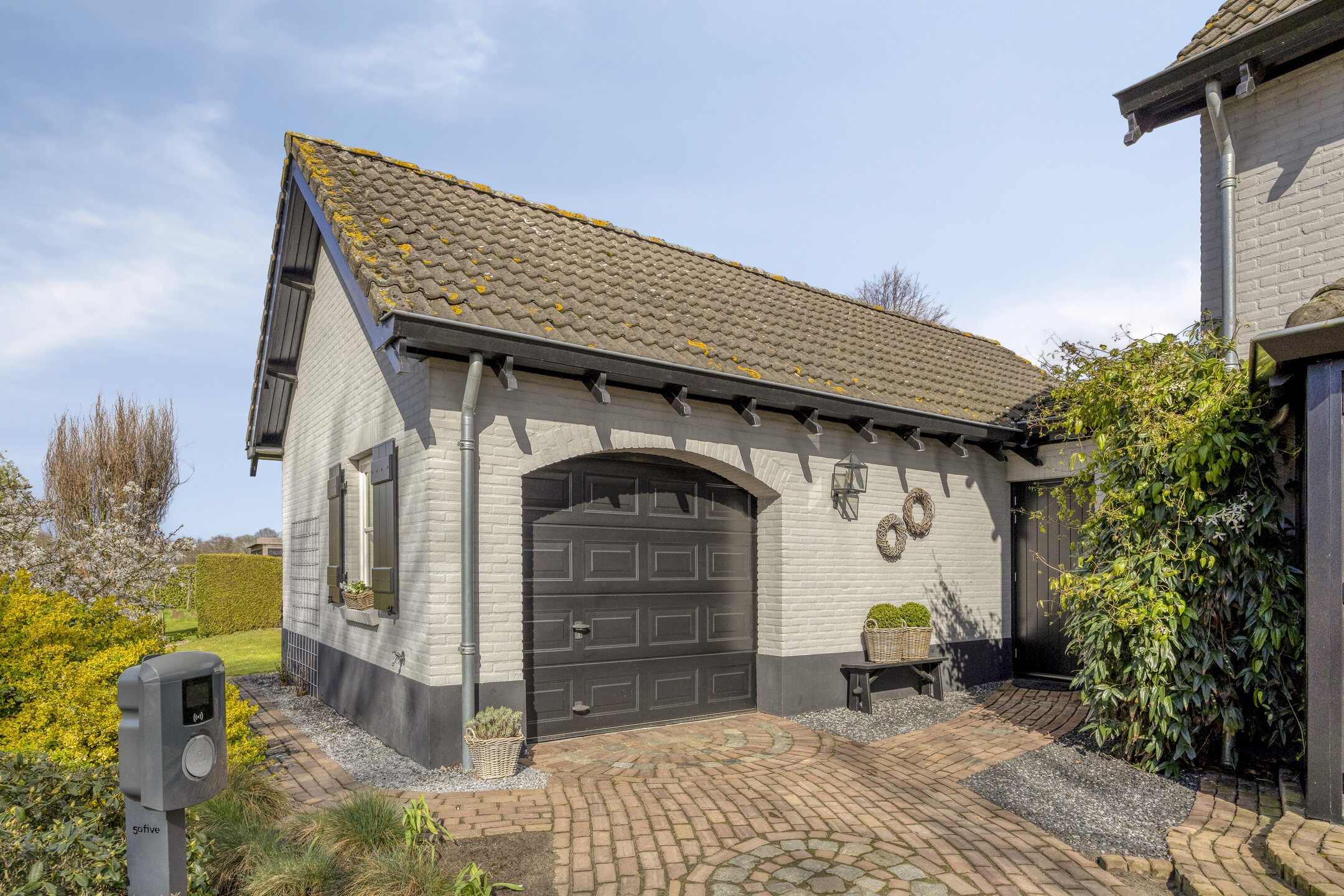 De garage is inpandig bereikbaar, voorzien van een handmatige deur en beschikt over een praktische bergzolder.