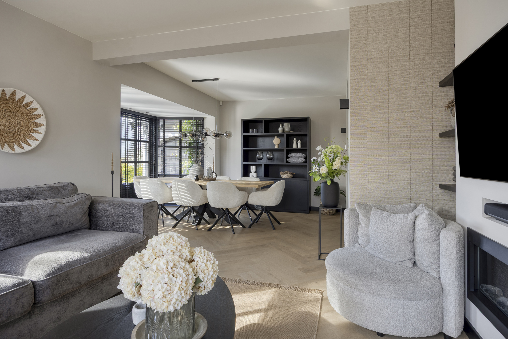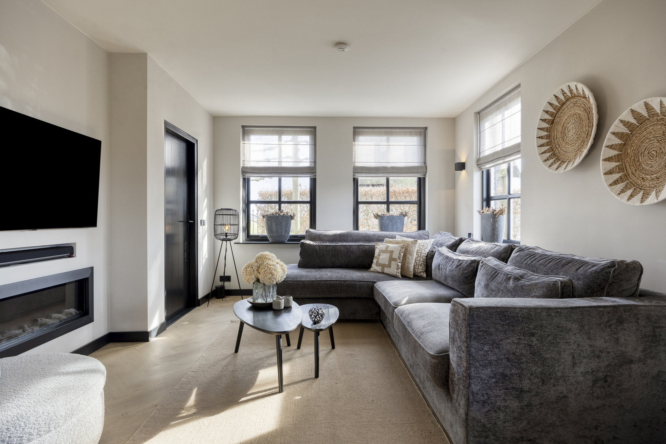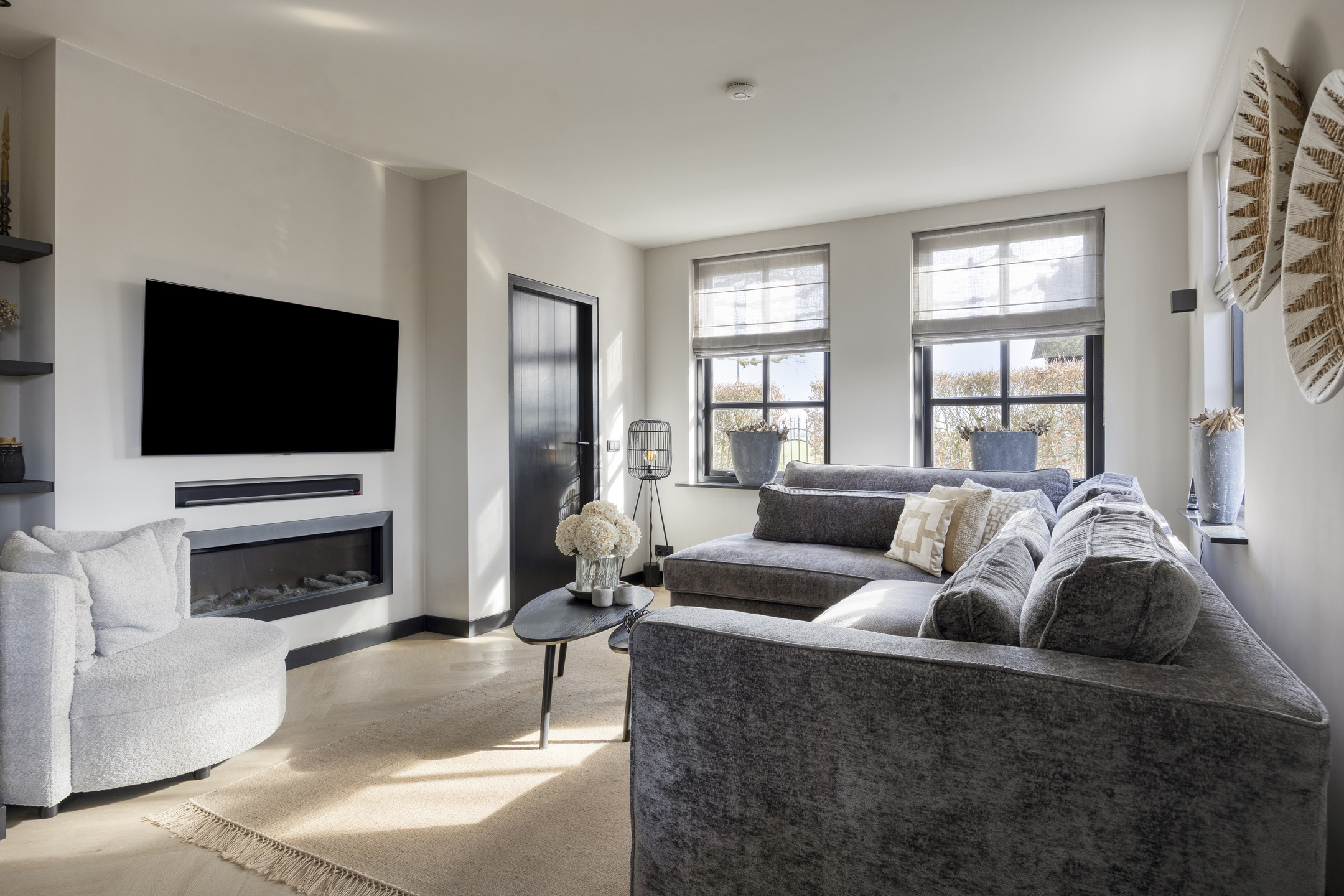 De woonkamer is ruim en sfeervol, met een erker die zorgt voor extra lichtinval en een elektrisch verwarmde haard als centraal middelpunt. De ruimte staat in directe verbinding met de keuken en het eetgedeelte, wat zorgt voor een open en gezellige leefomgeving.