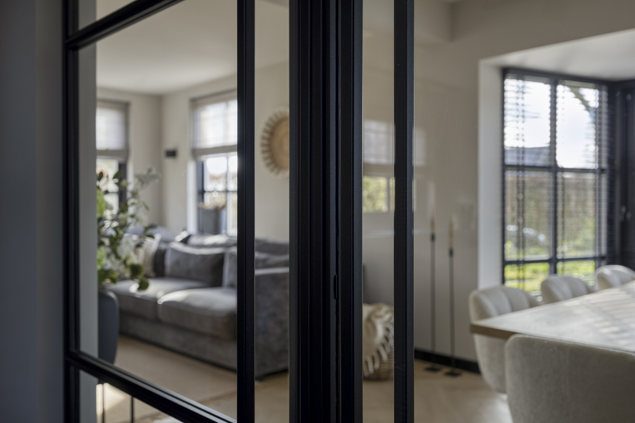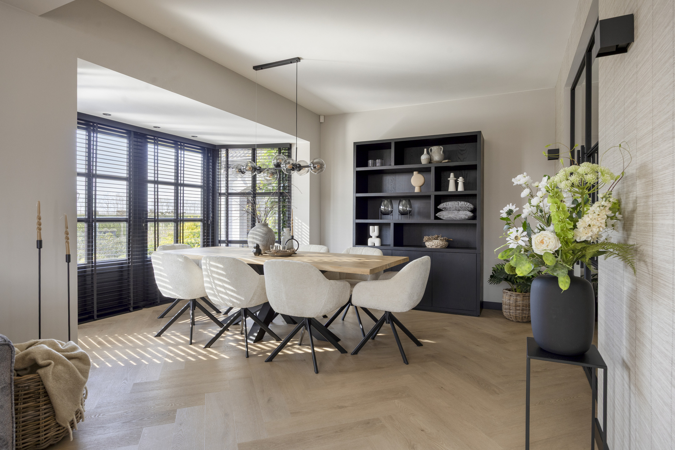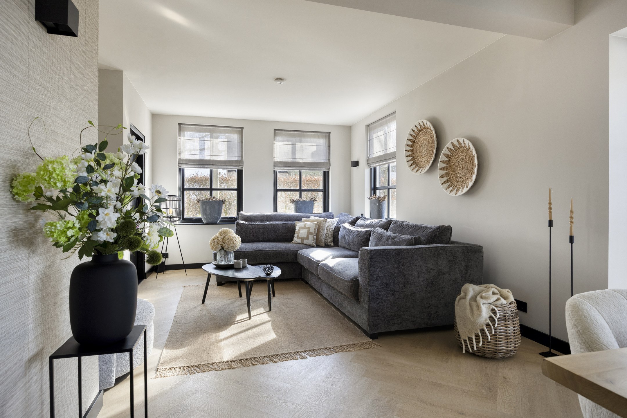 De woonkamer is ruim en sfeervol, met een erker die zorgt voor extra lichtinval en een elektrisch verwarmde haard als centraal middelpunt. De ruimte staat in directe verbinding met de keuken en het eetgedeelte, wat zorgt voor een open en gezellige leefomgeving.