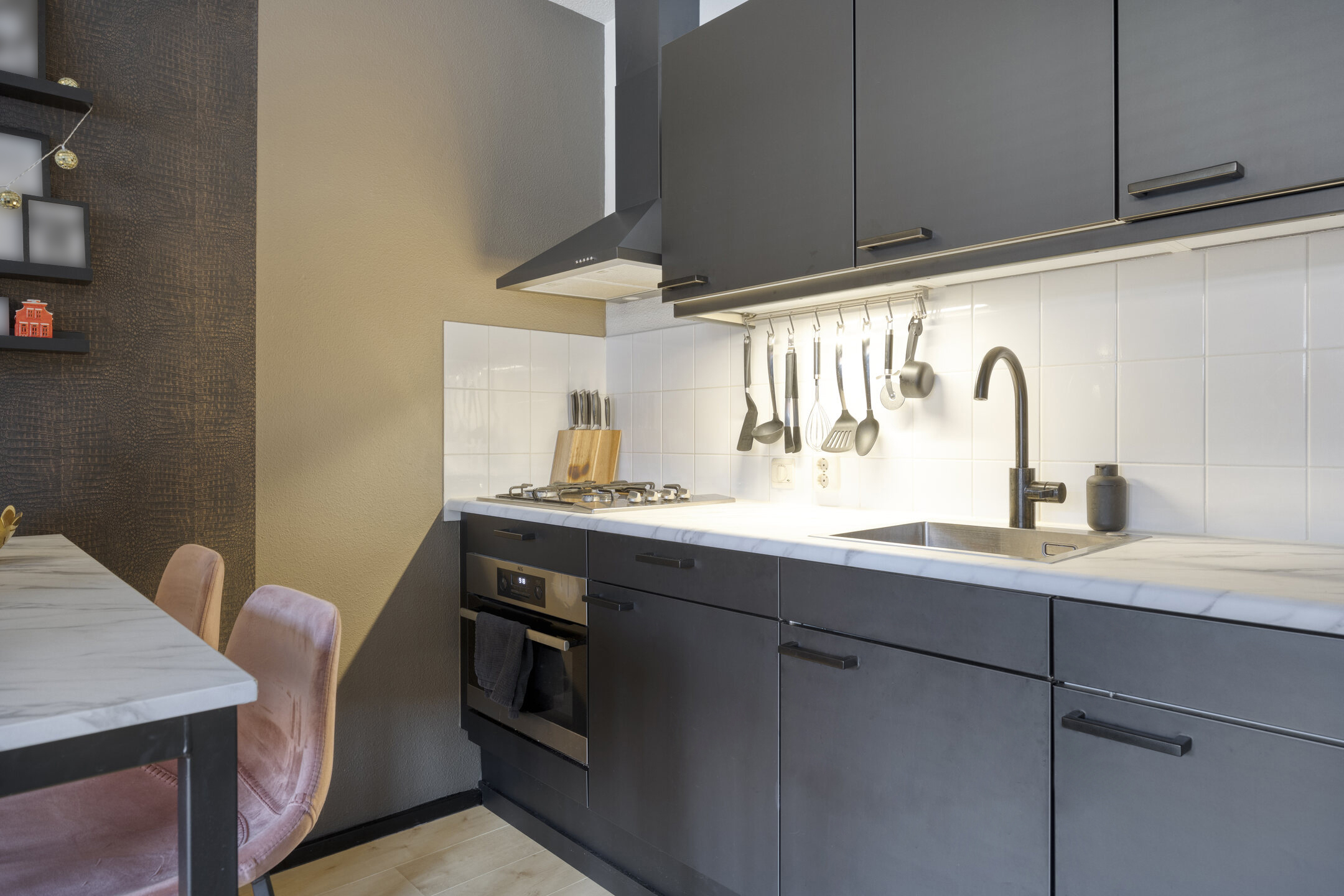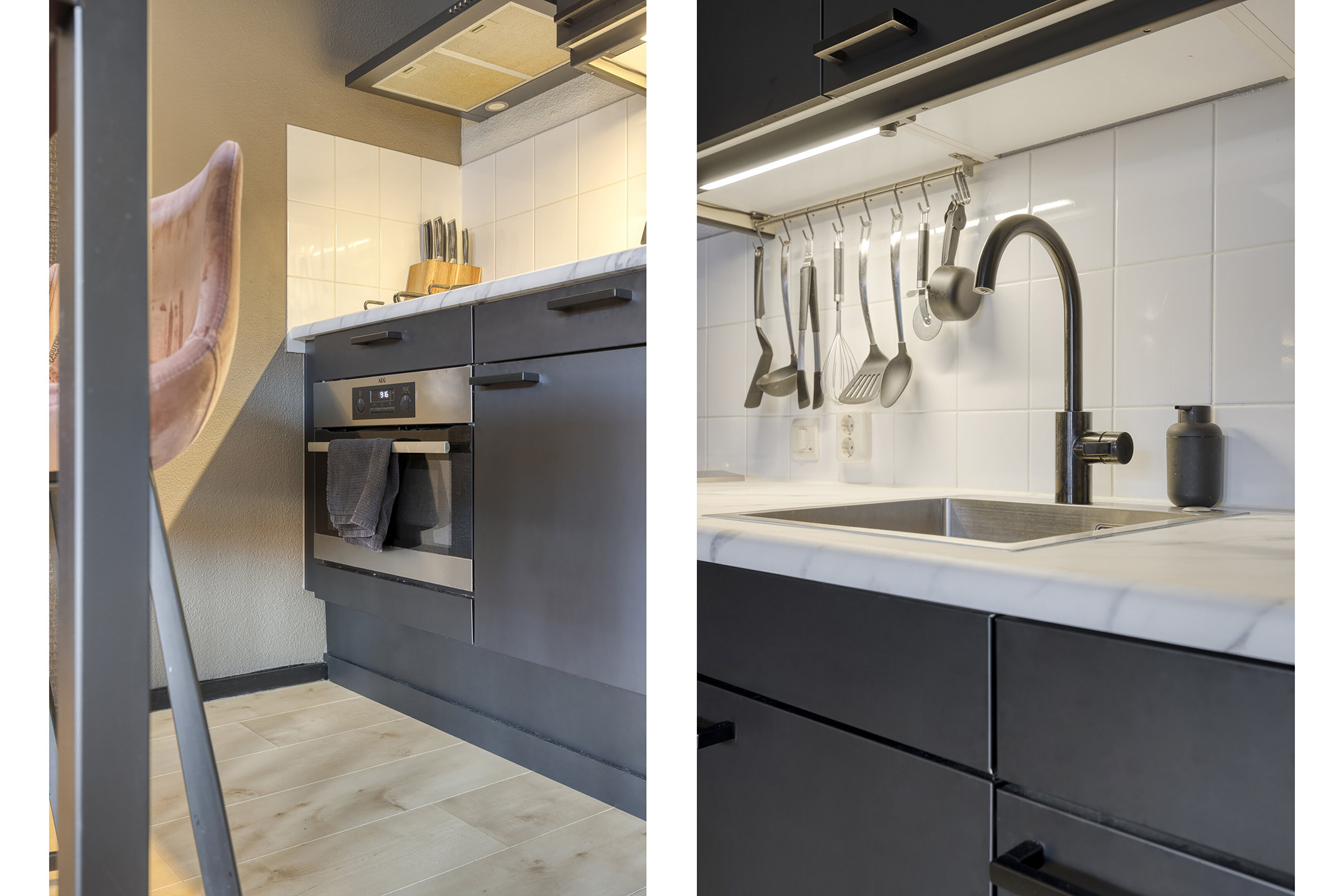 De open keuken is voorzien van een moderne keukeninstallatie, uitgerust met een koel-vries combinatie, een 4-pits gaskookplaat, een afzuigkap en een combi-oven.