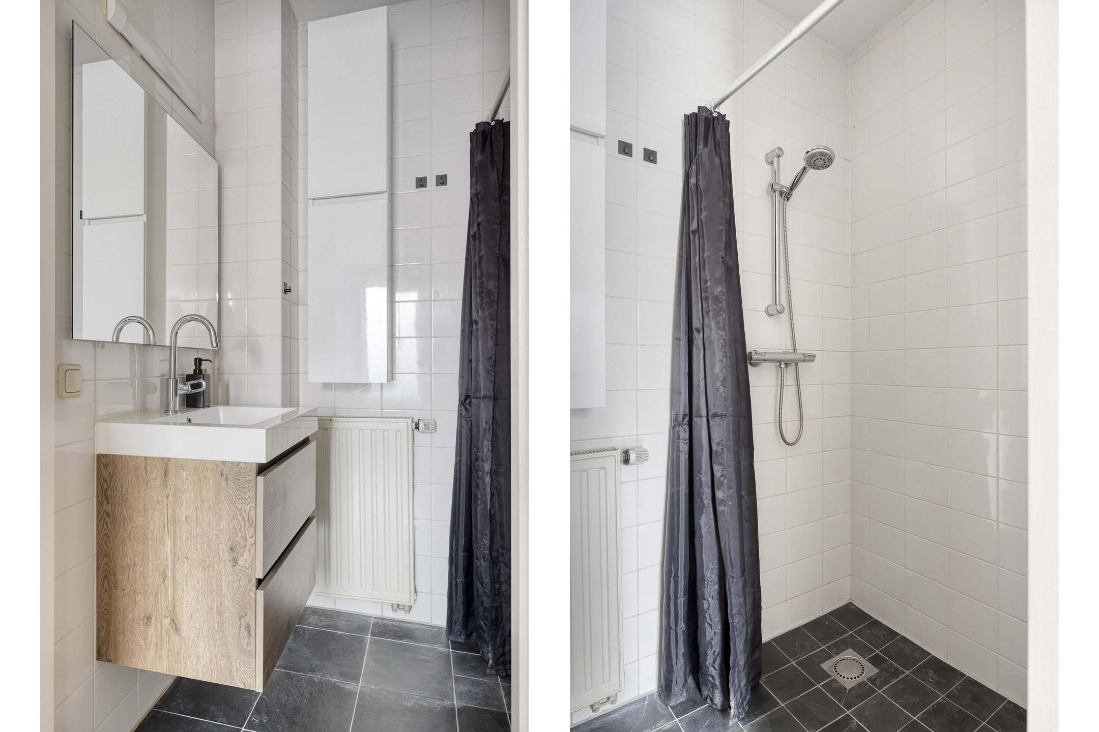 De badkamer is voorzien van een douche en een wastafelmeubel.