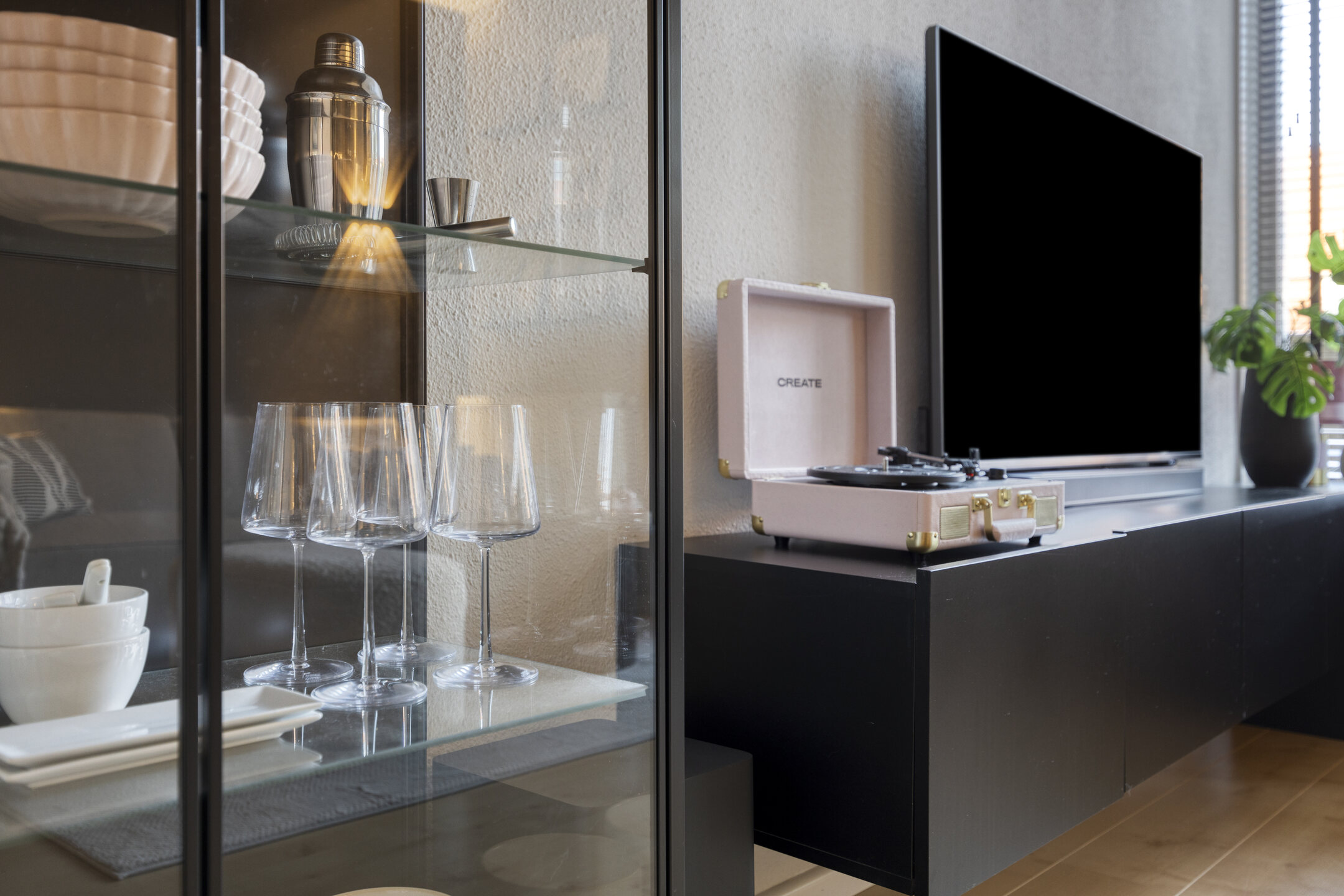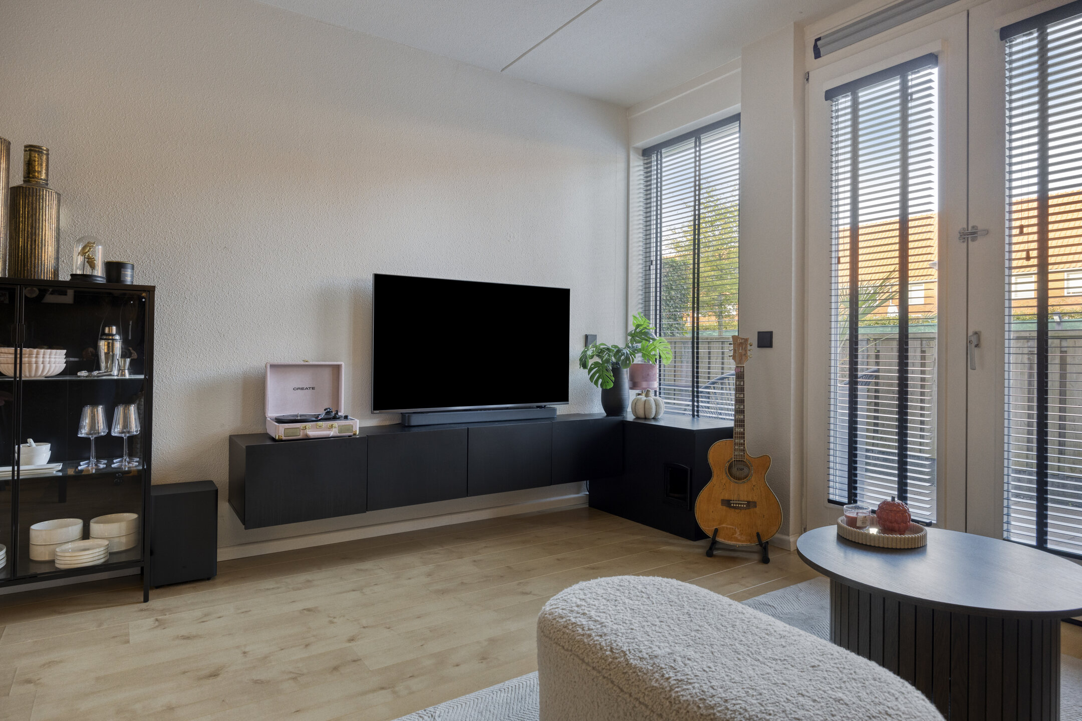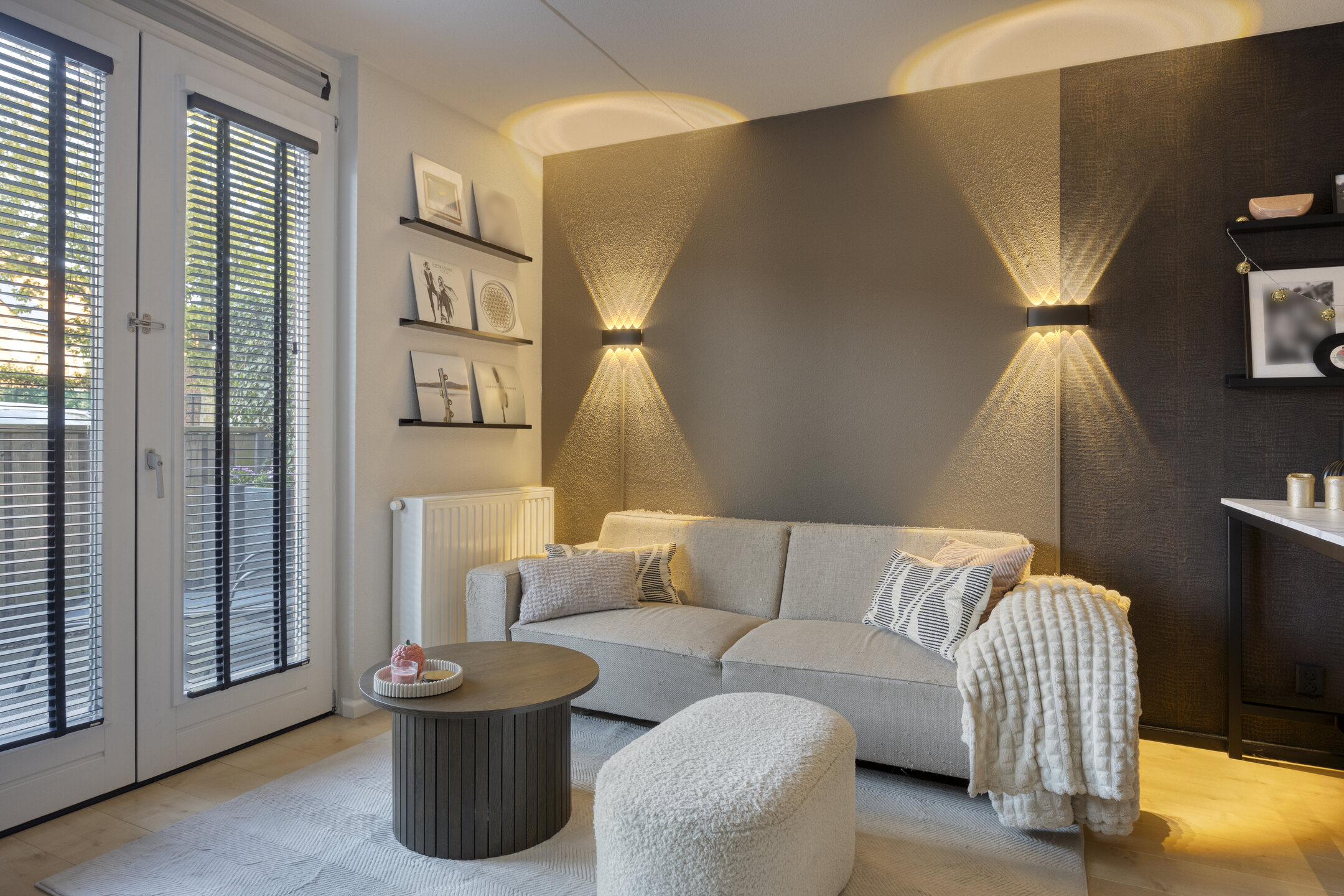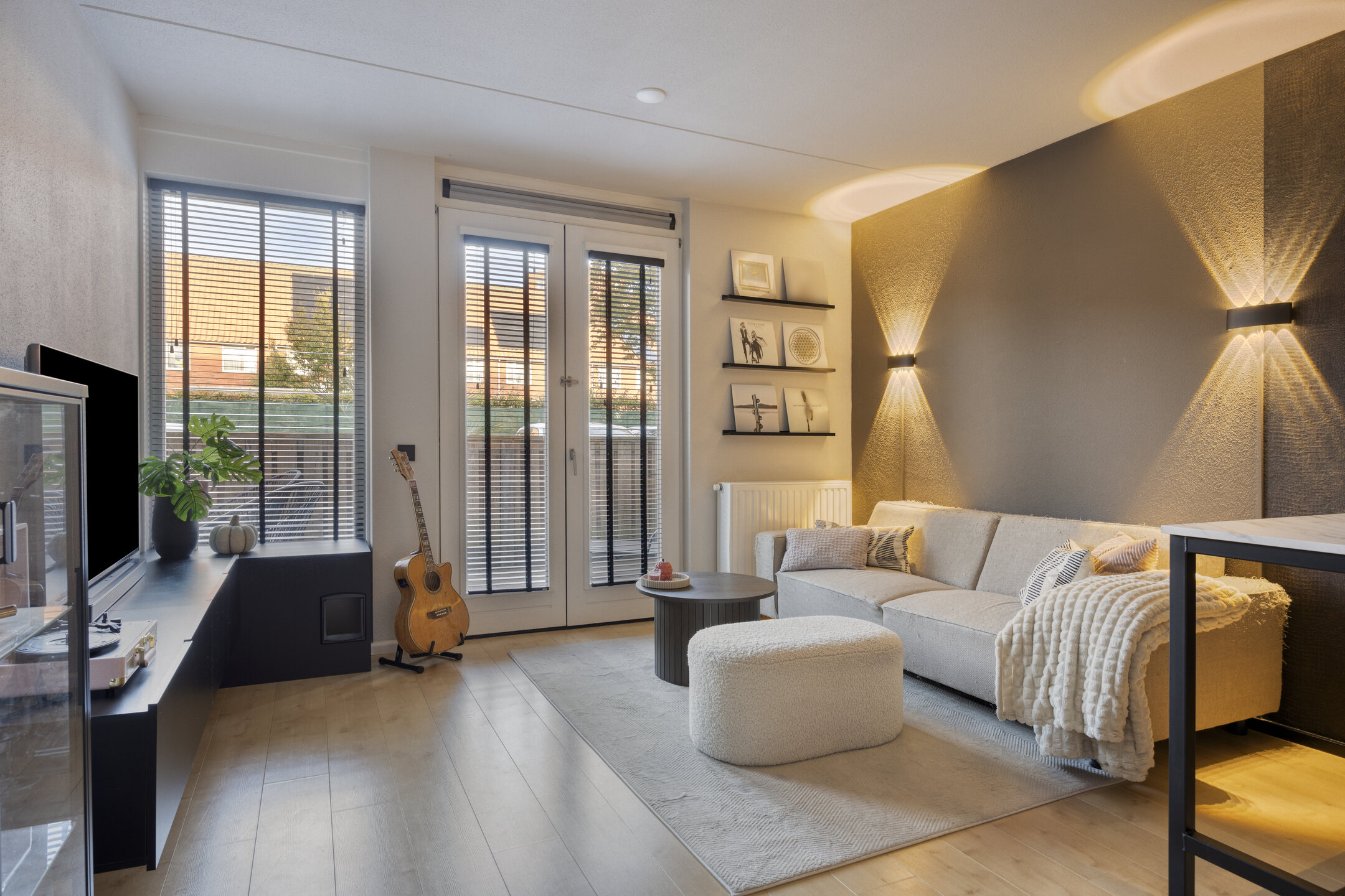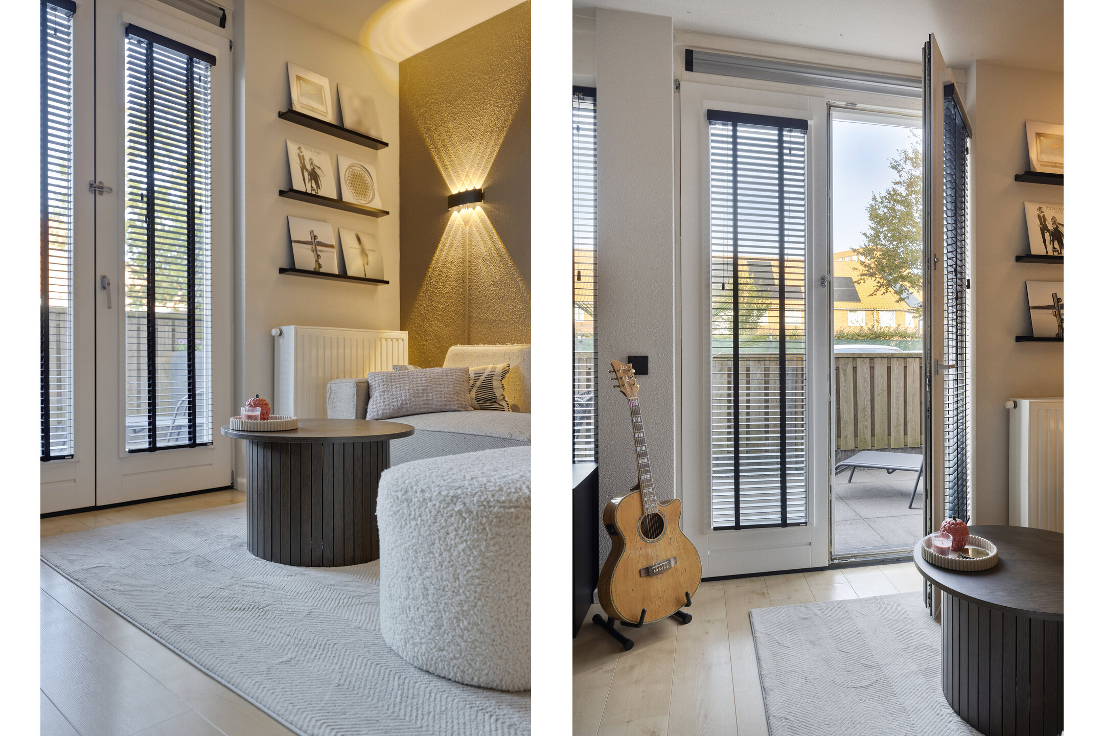 De woonkamer heeft door de grote ramen veel lichtinval. Via de tuindeuren is het eigen terras bereikbaar.