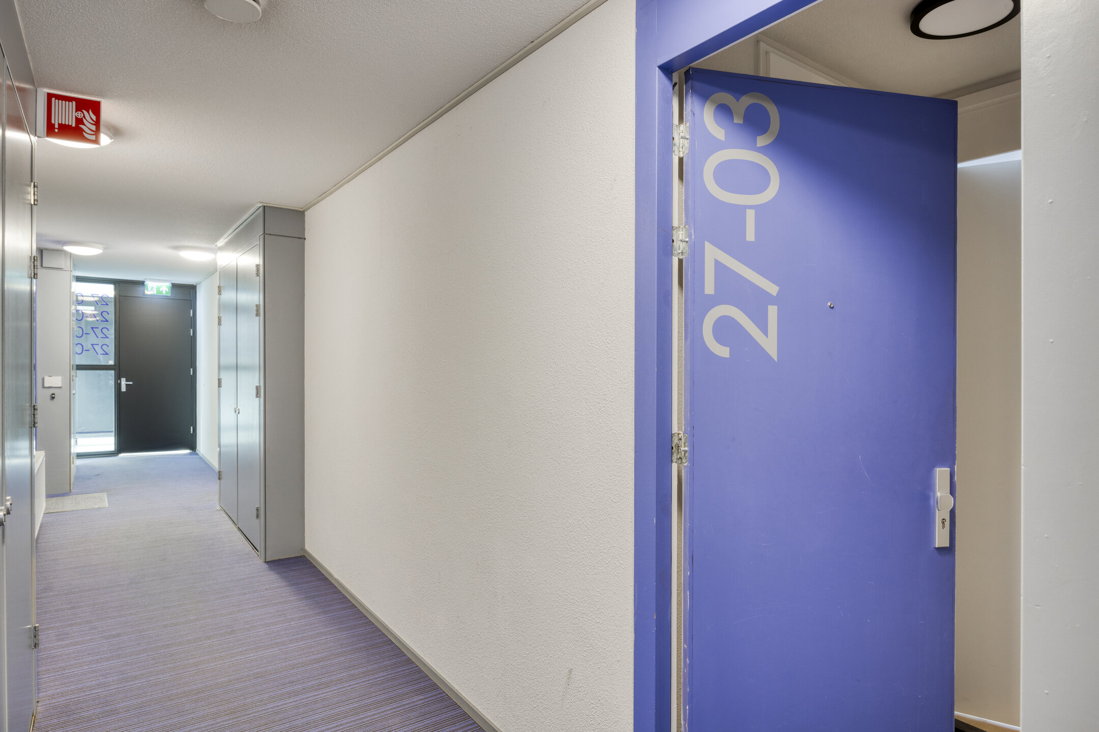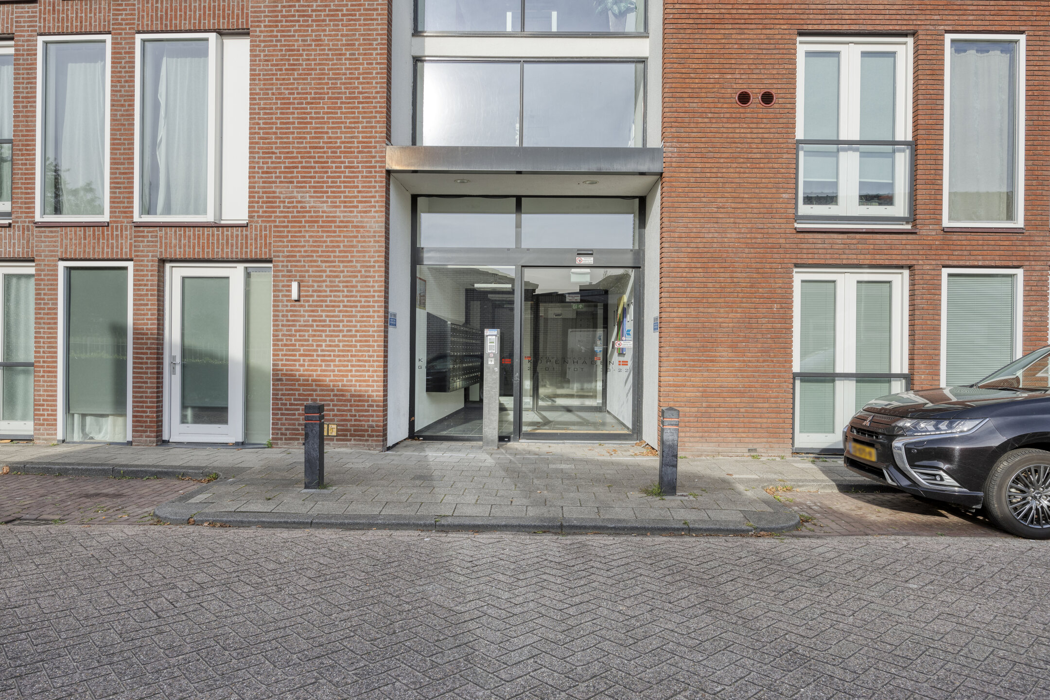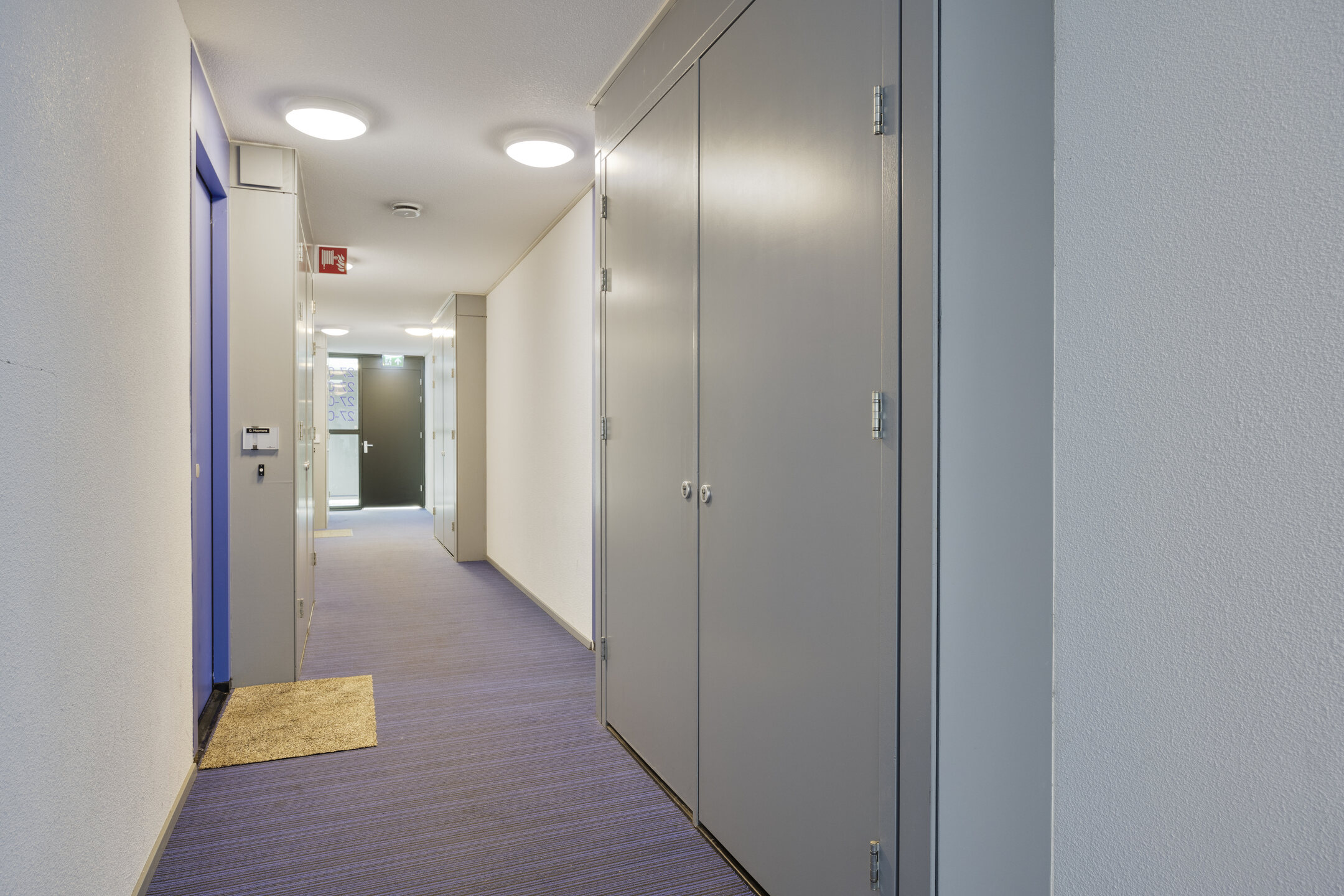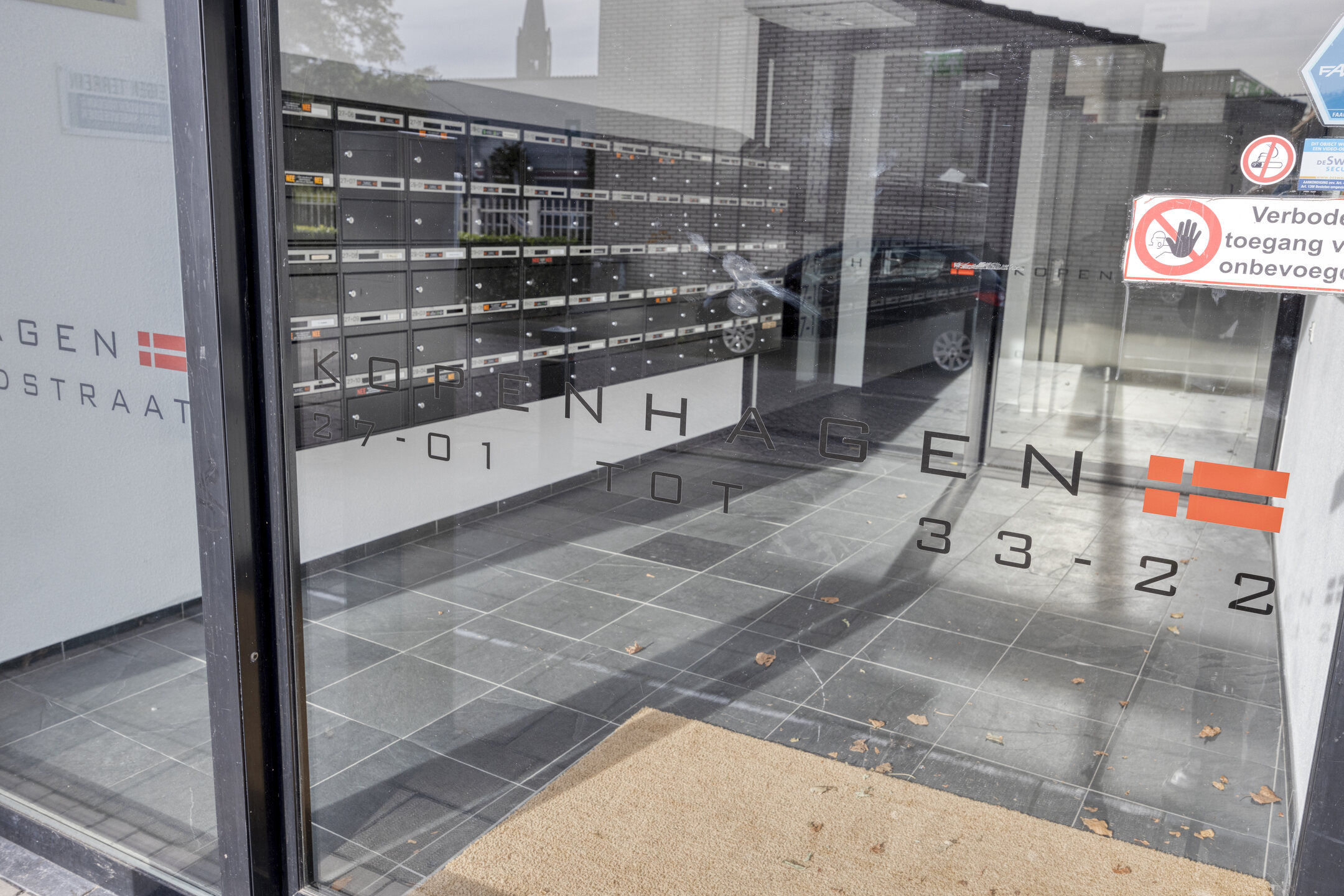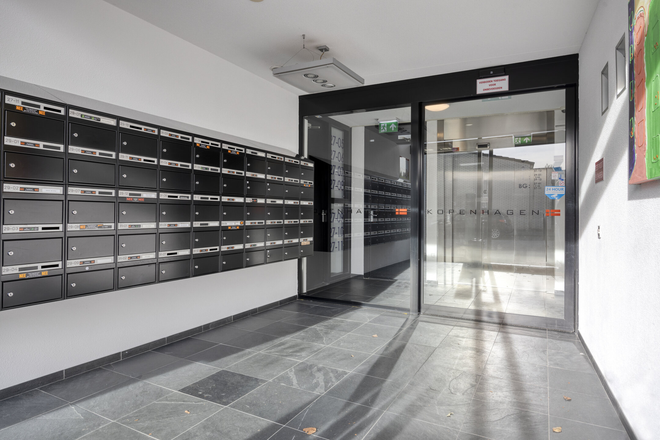 Je betreedt het complex via de centrale hal met automatische schuifdeur. In de hal bevinden zich de brievenbussen, de intercom en toegang tot de lift. Via de tussendeuren zijn de appartementen bereikbaar.