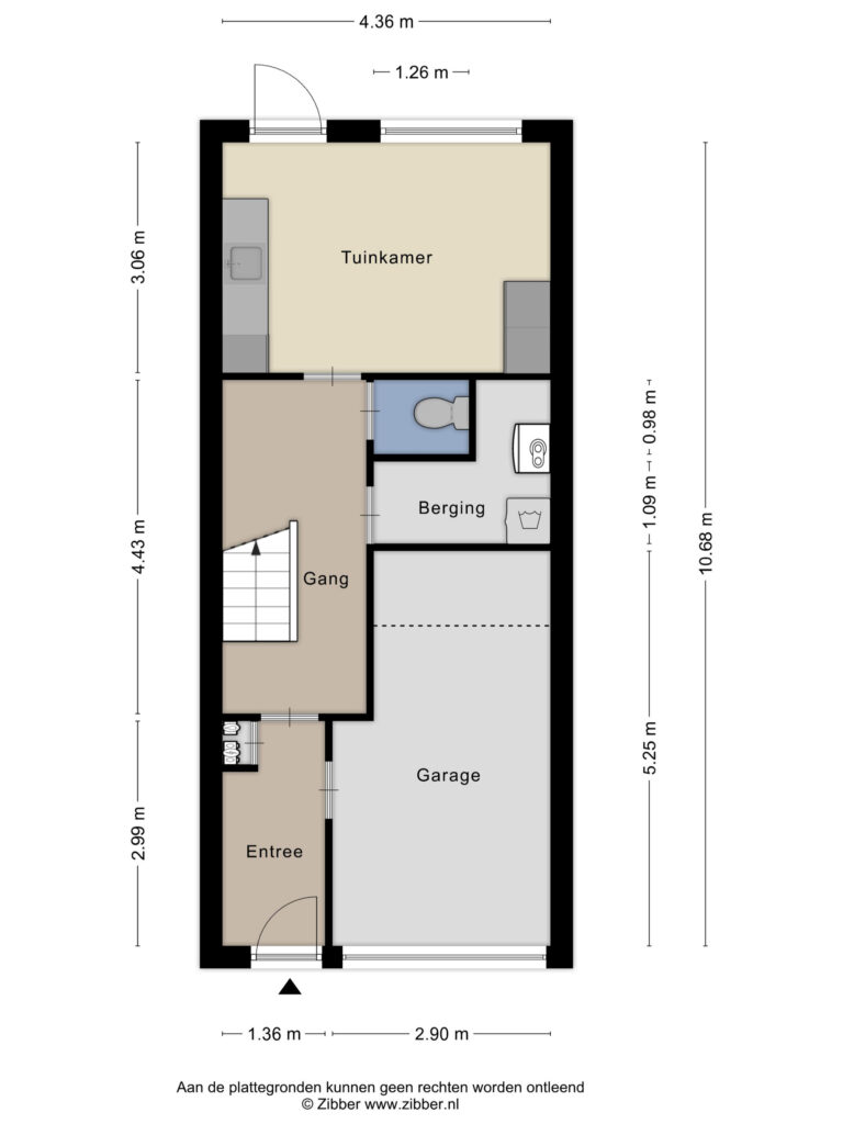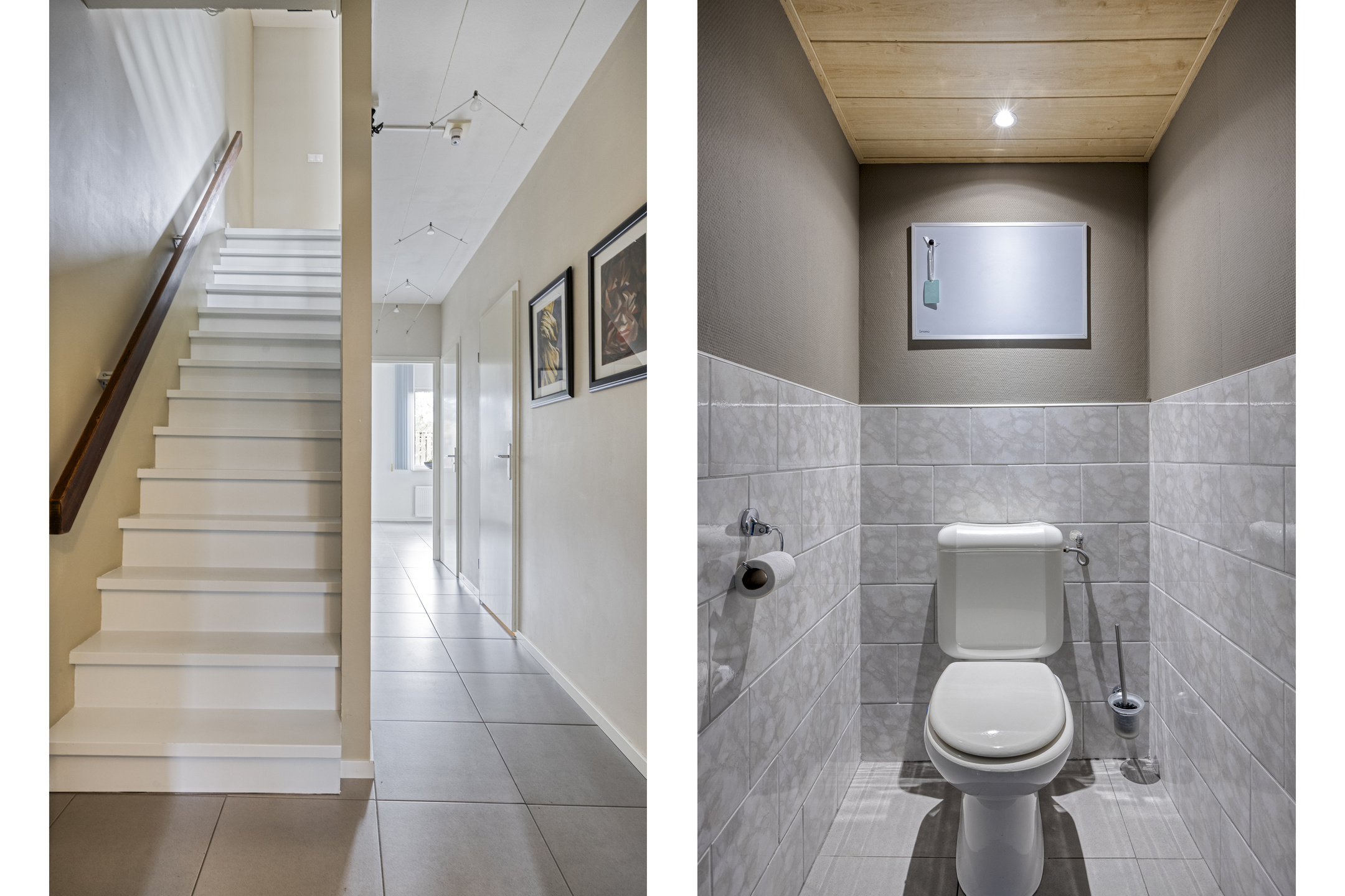 In de hal bevinden zich een toiletruimte, trapopgang naar de verdiepingen, toegang tot de garage en de tuinkamer.