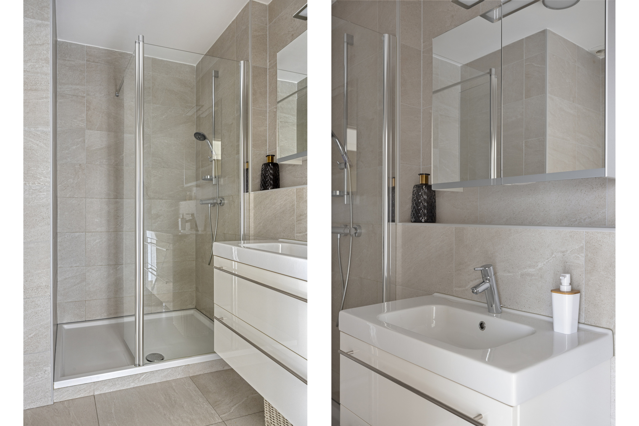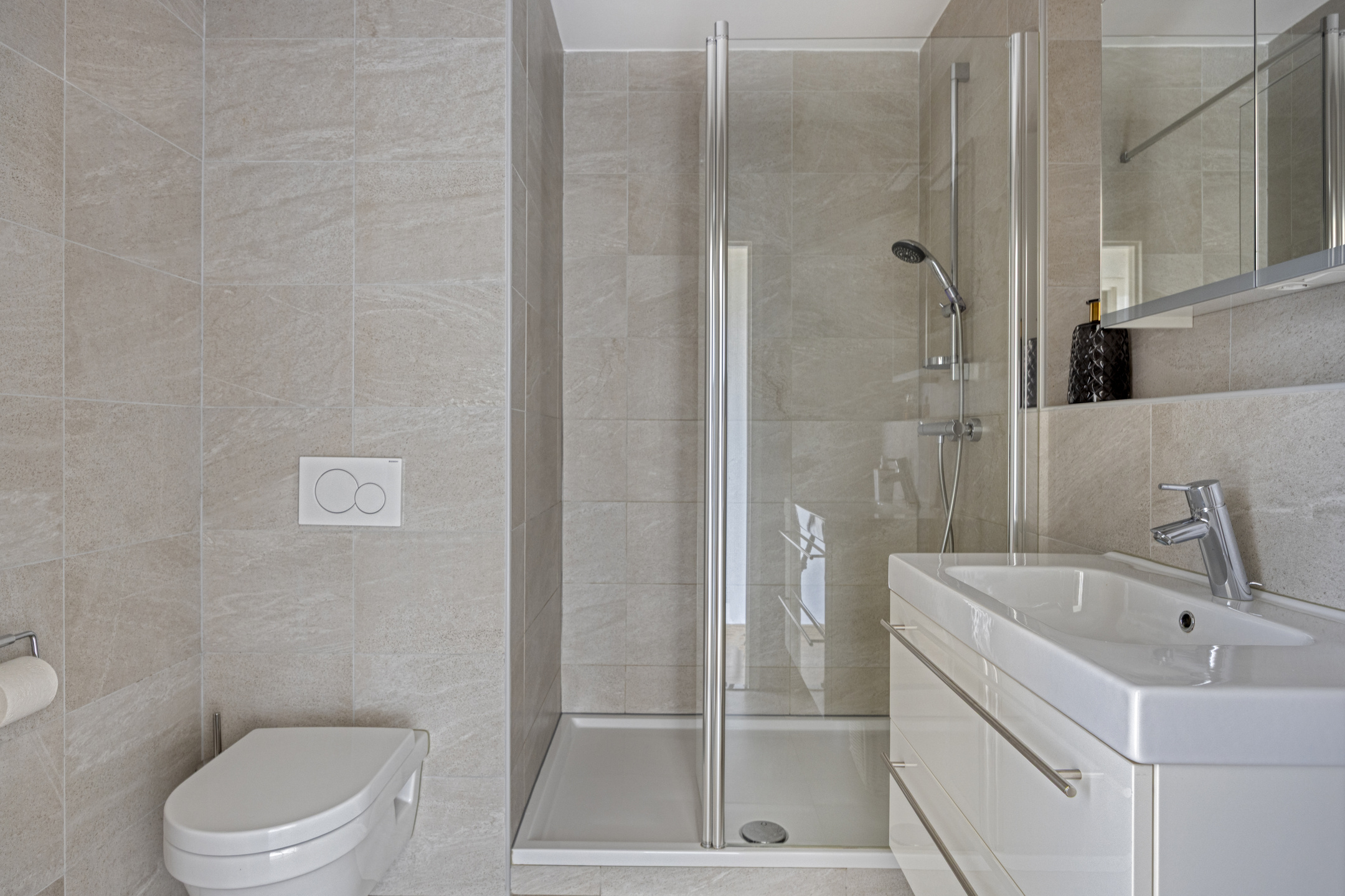 De badkamer (2015) is modern afgewerkt en volledig betegeld in een lichte kleurstelling. De ruimte is uitgerust met een inloopdouche, toilet en een net wastafelmeubel.