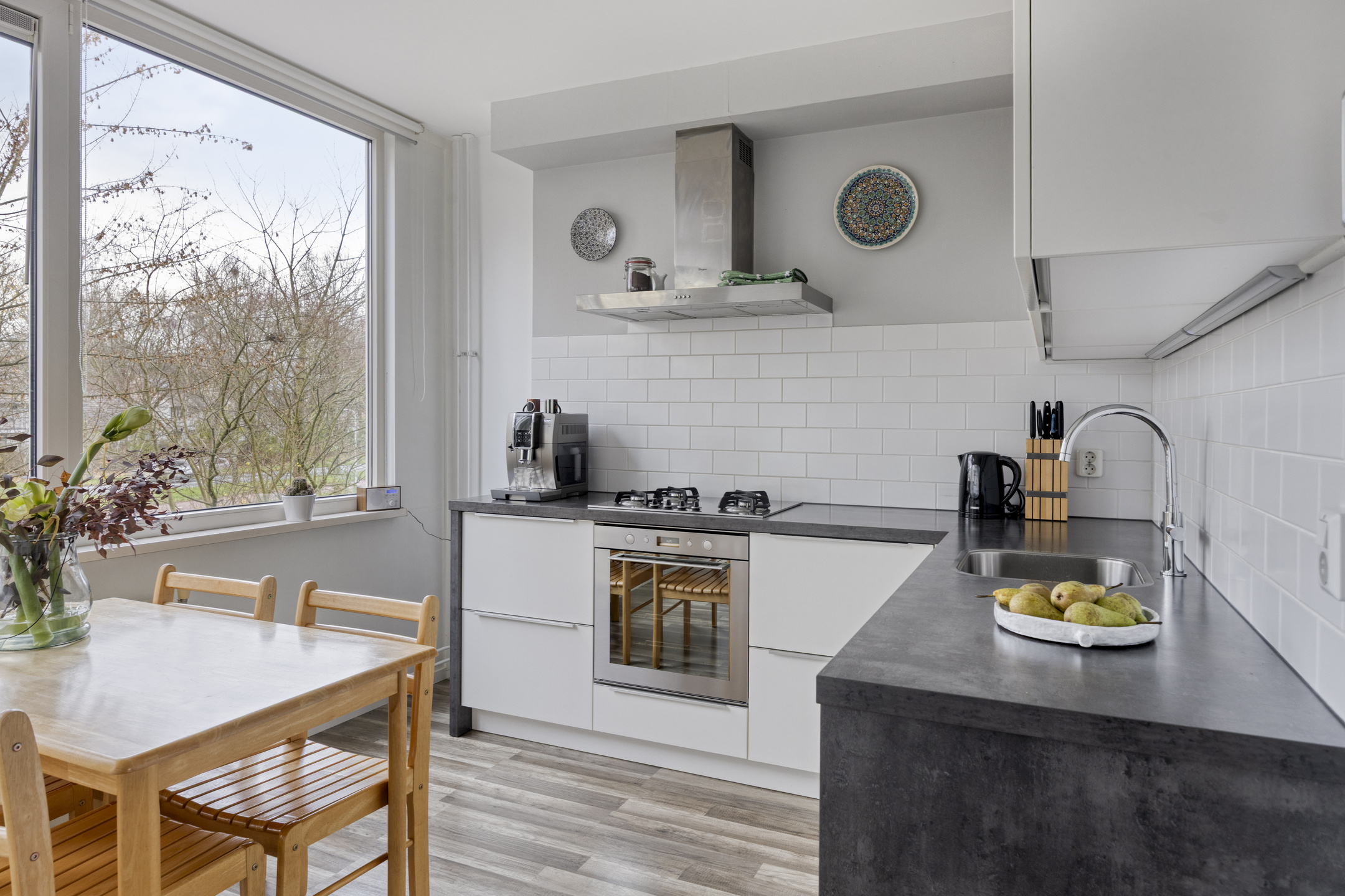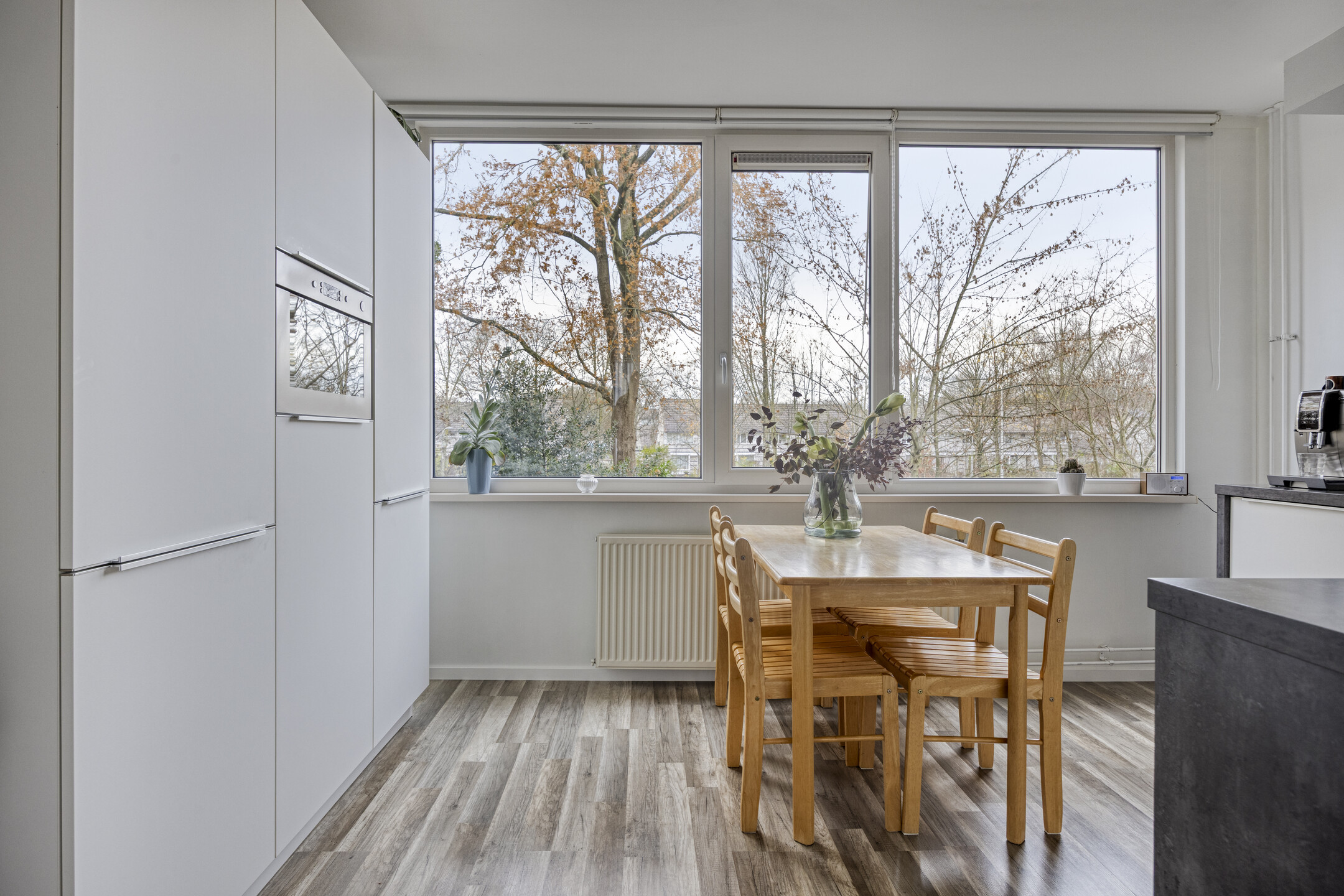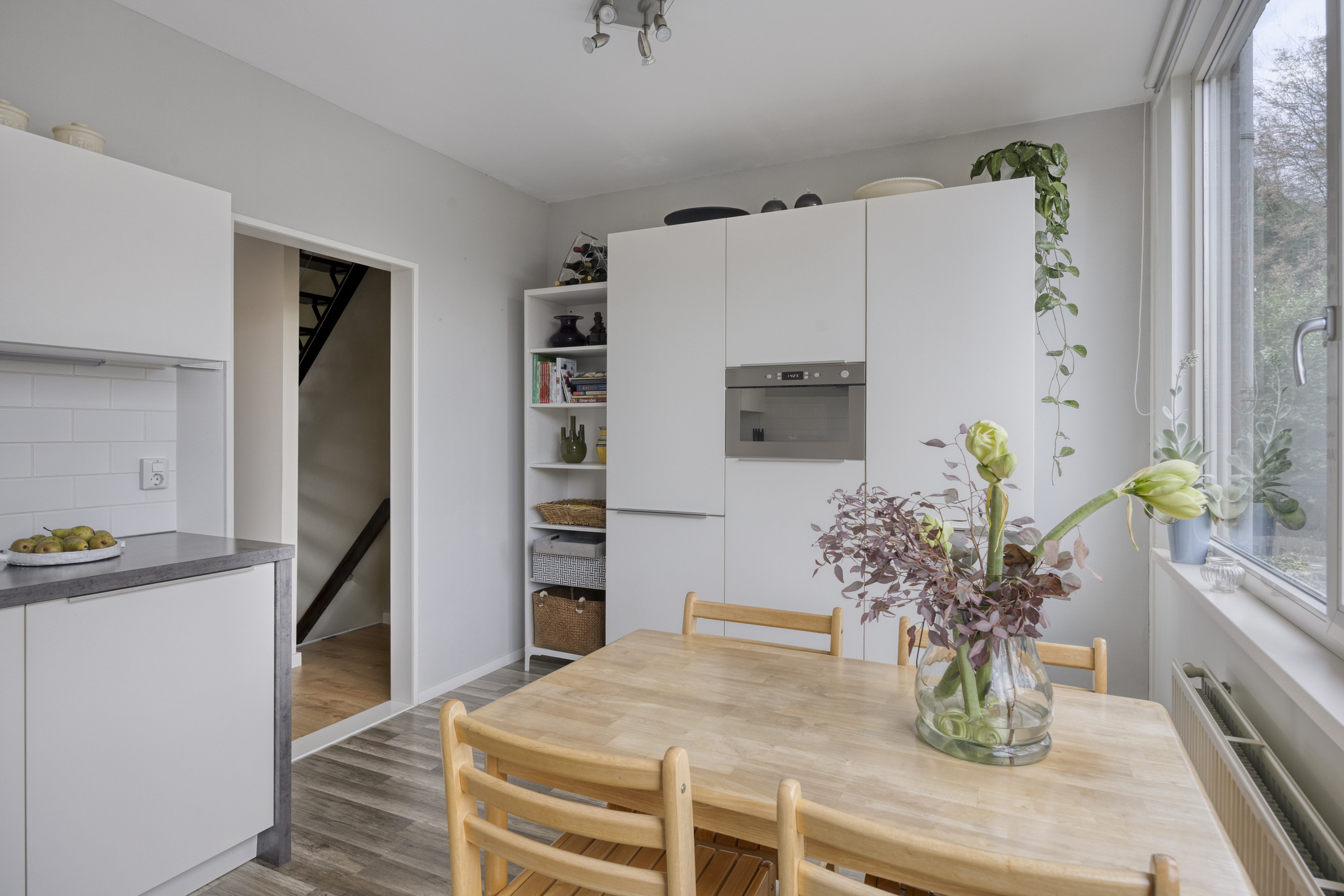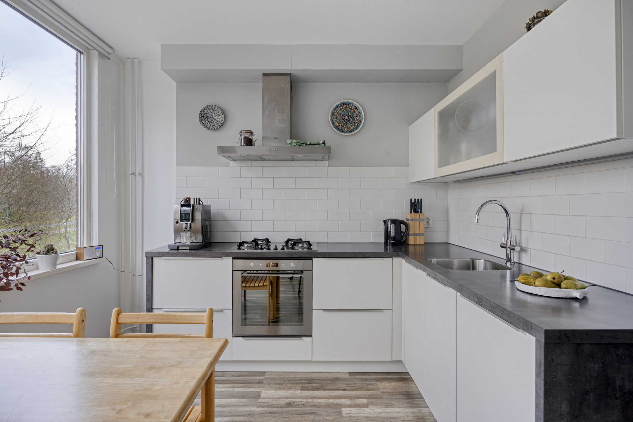 Aan de achterzijde bevindt zich de moderne keuken in hoekopstelling. Deze is voorzien van diverse inbouwapparatuur: een gaskookplaat, oven, magnetron, afzuigkap, vaatwasser en koel-/vriescombinatie. Er is daarnaast voldoende ruimte voor een eettafel, zodat je hier gezellig kunt koken en tafelen.