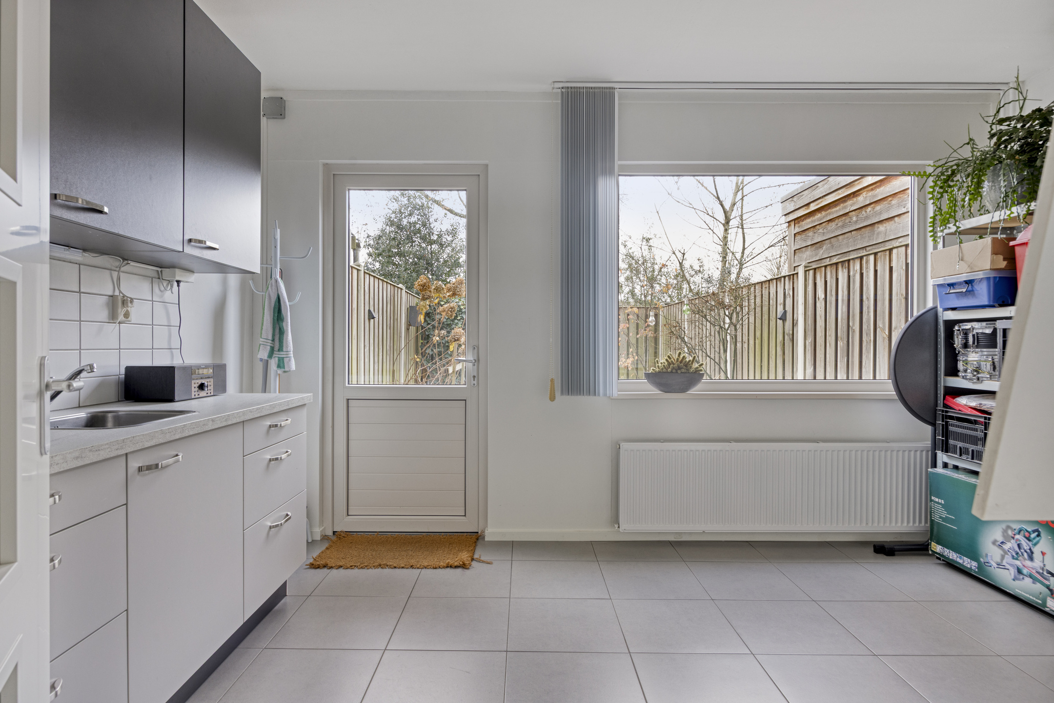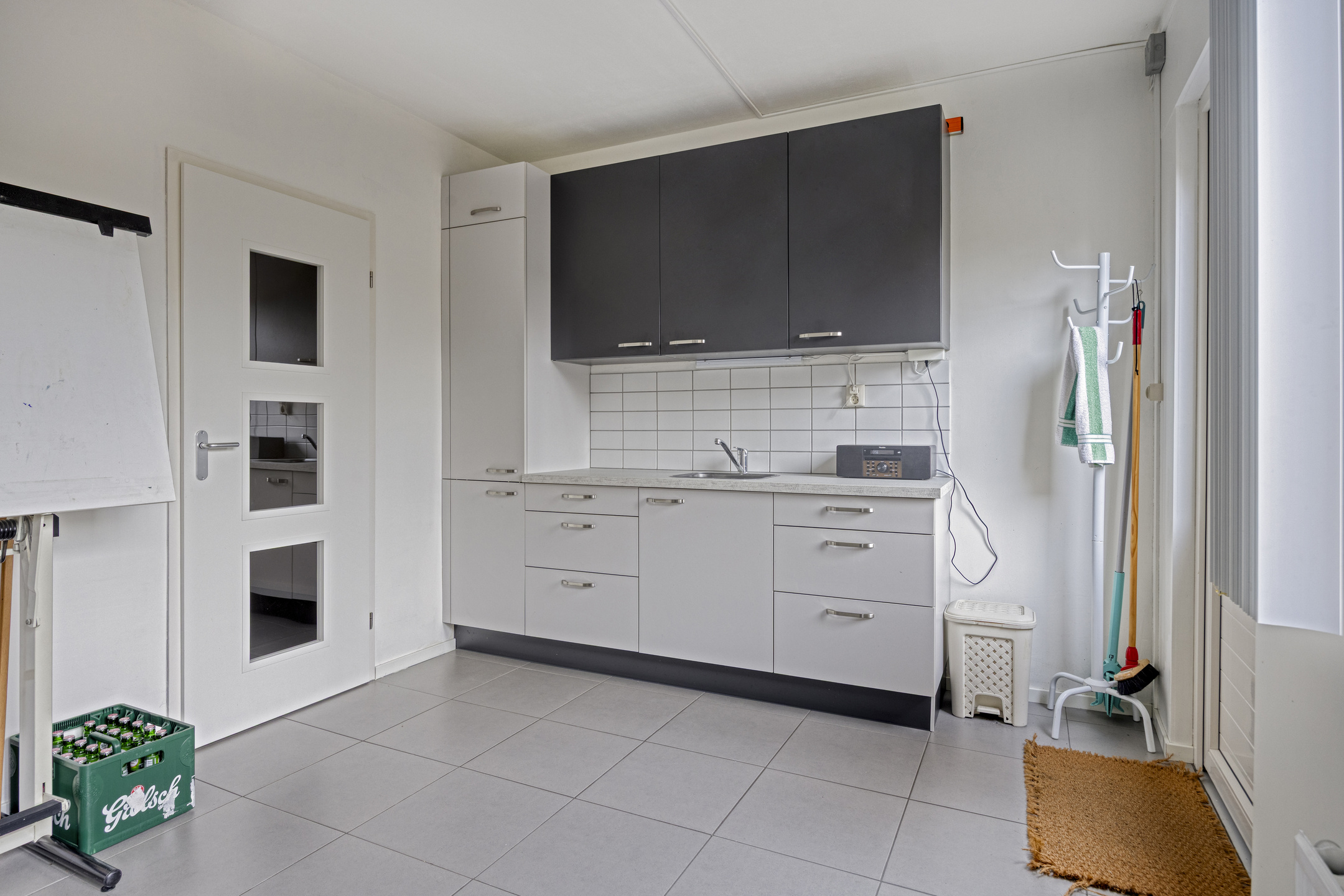Achterin de hal bevindt zich de praktische tuinkamer welke is voorzien van een keukenblok en kasten wand – ideaal als extra opslagruimte, werkplek of hobbyruimte.